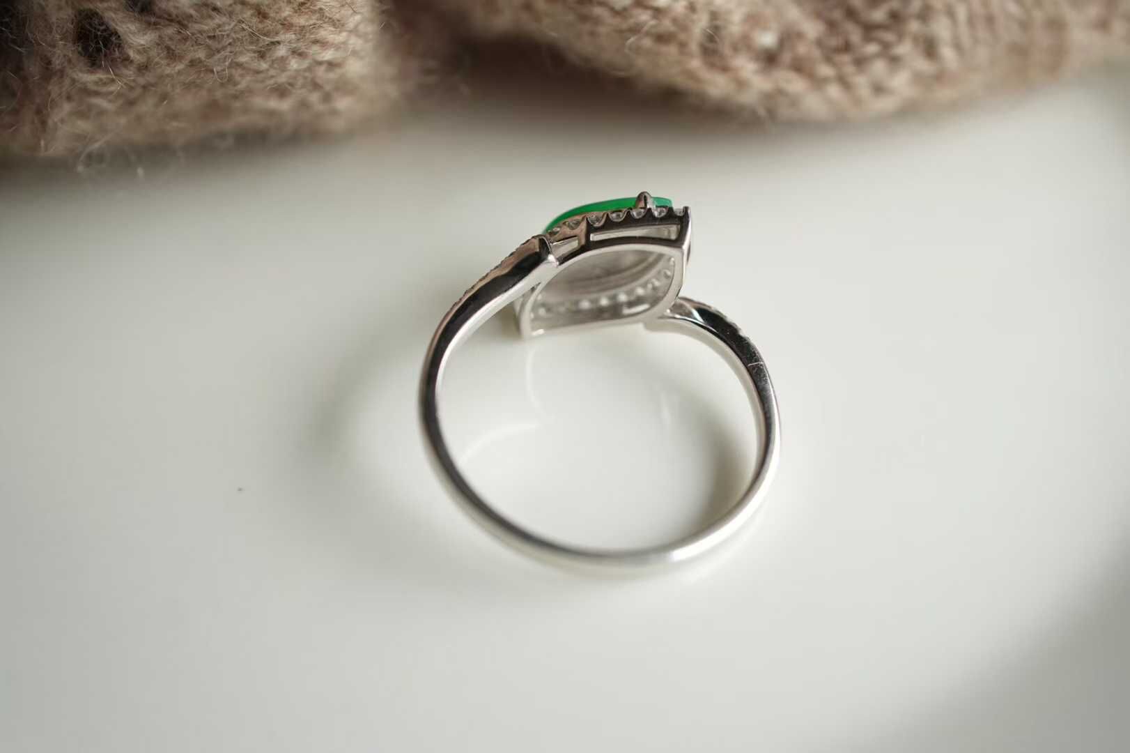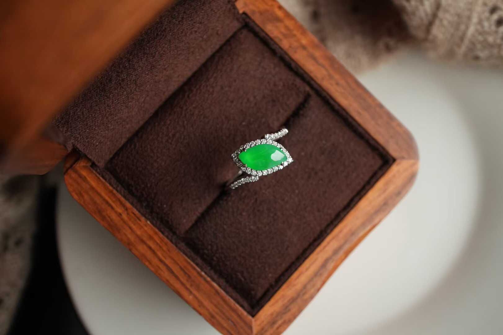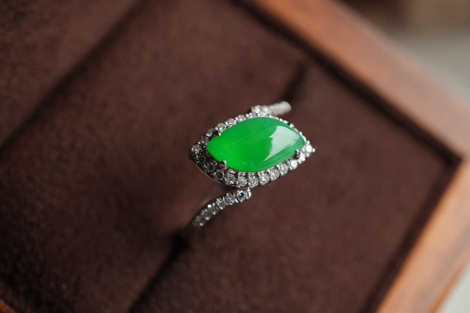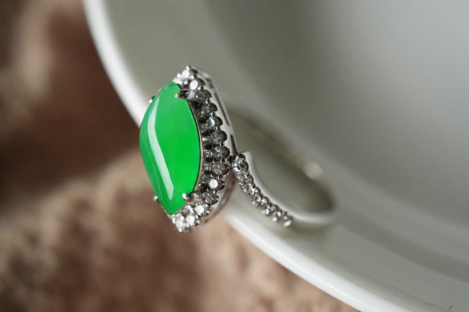 天然翡翠A玉,緬料老坑種冰陽綠,品質很好,隨性自然的美,獨特氣質,18K金鑽石鑲嵌,孤品不可復制。