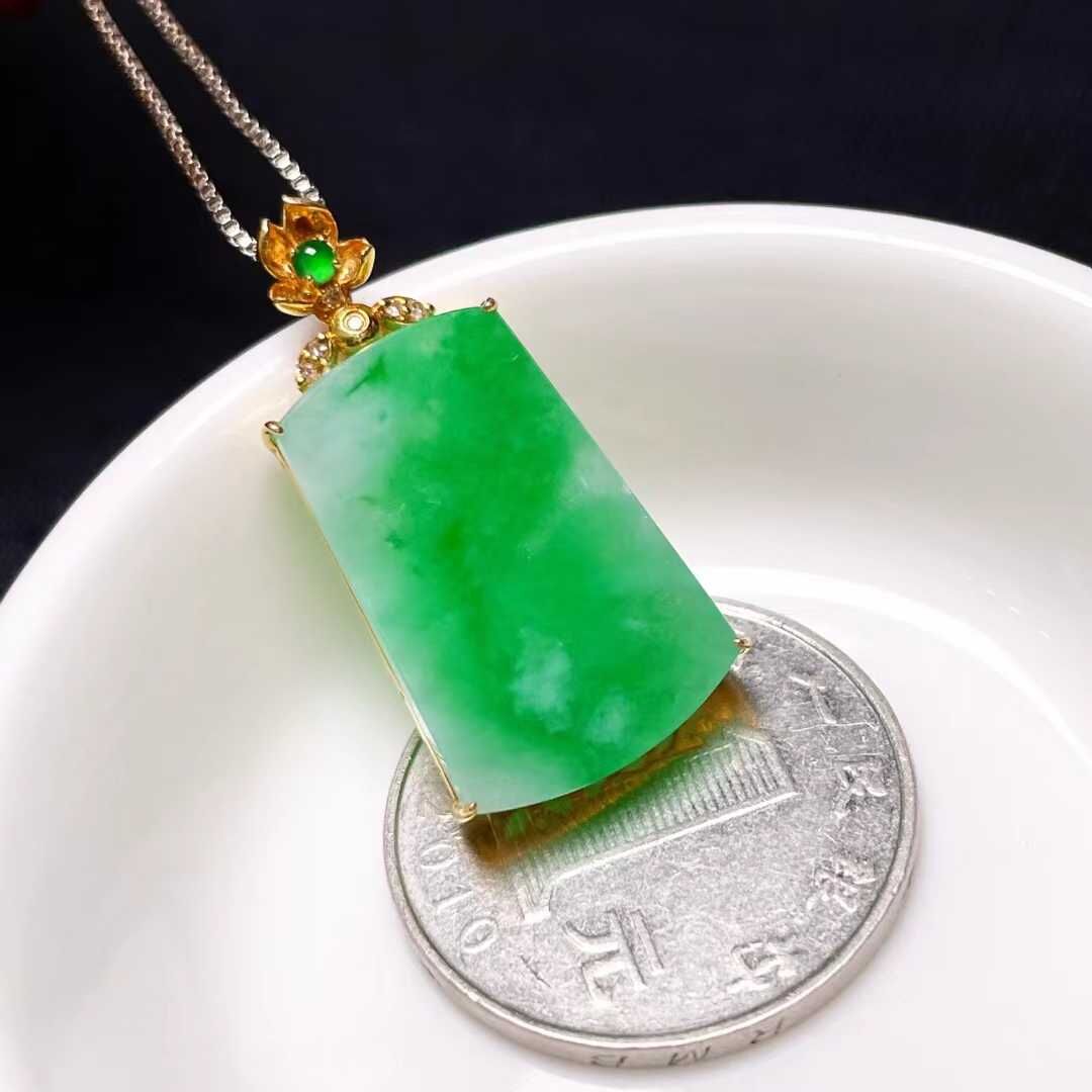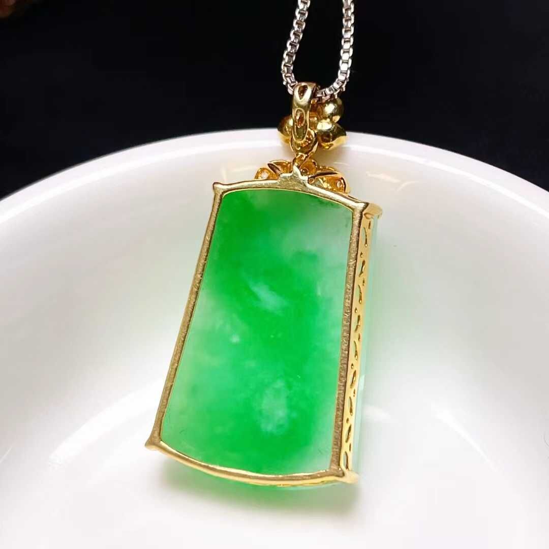 天然翡翠A玉,緬料,老坑冰種,辣綠,18K金鑲嵌。