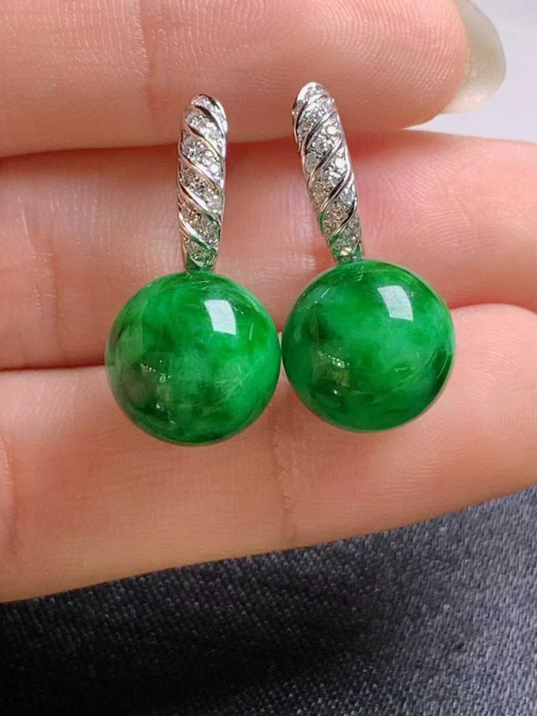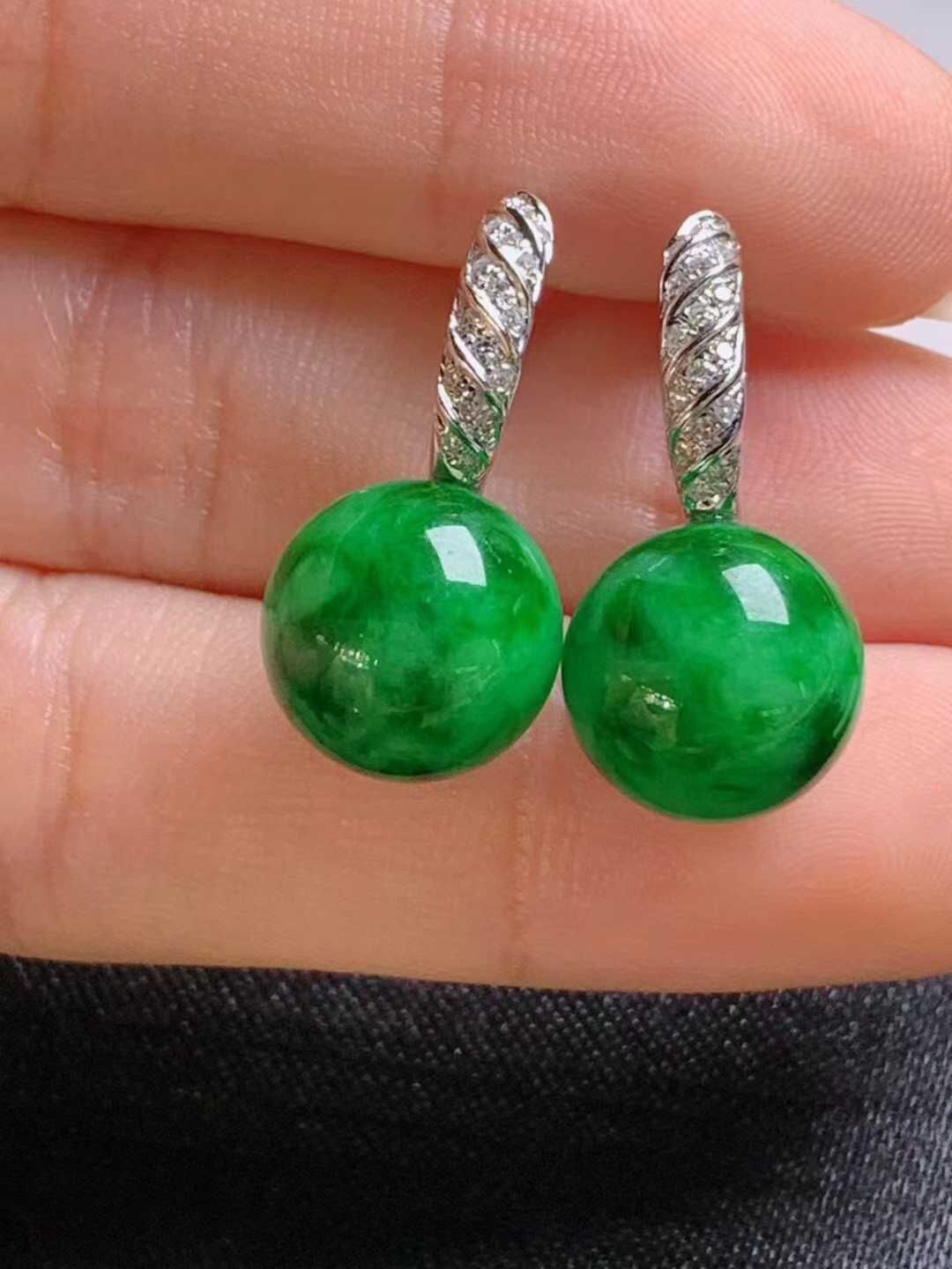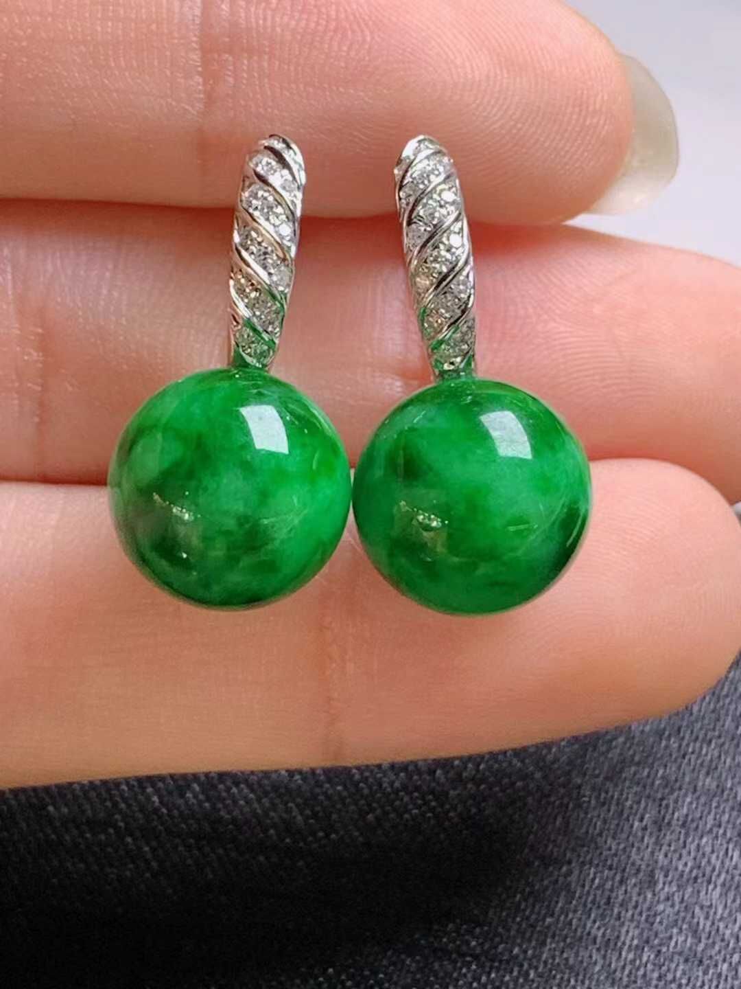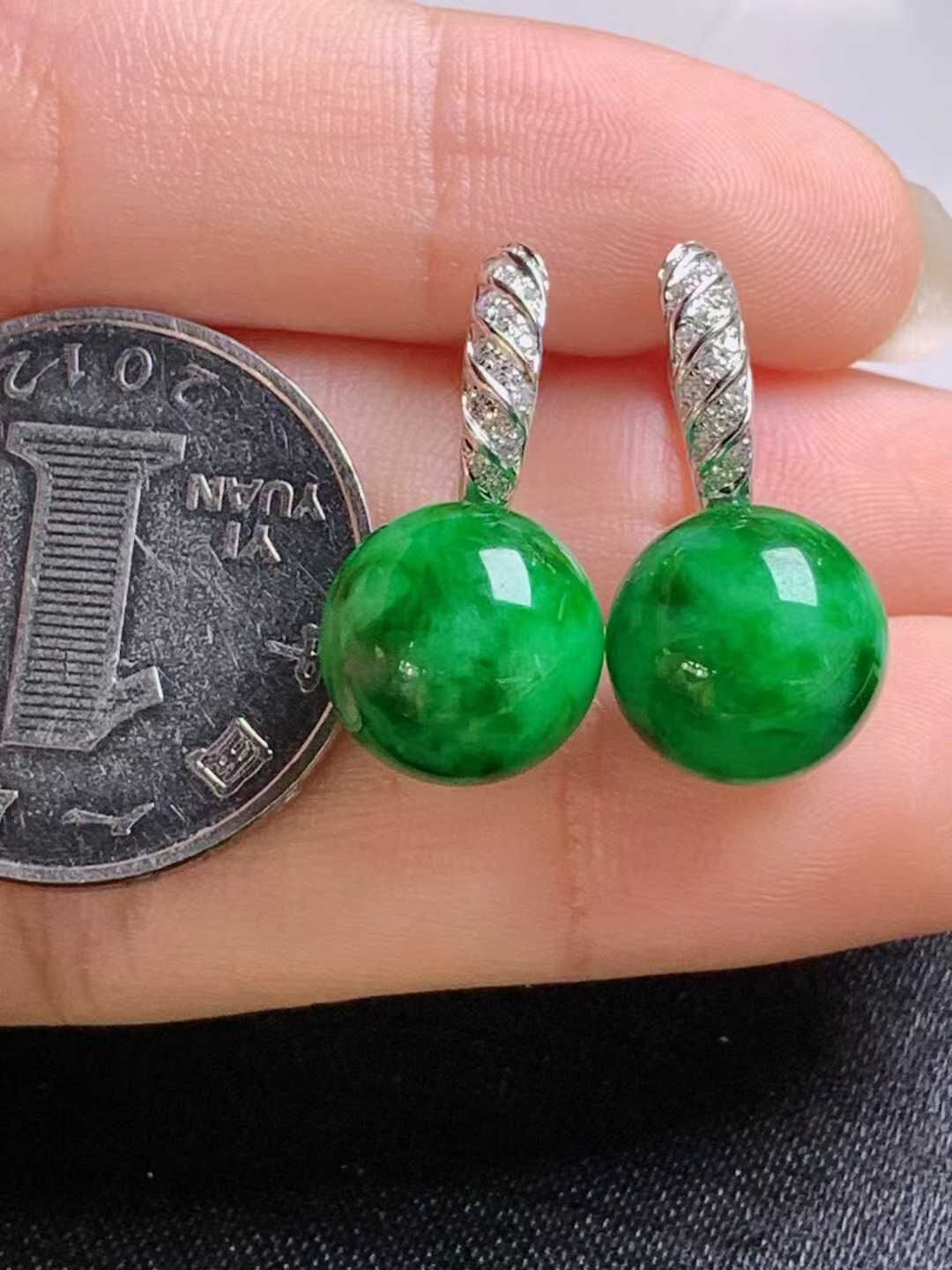 • 翡翠冰種陽綠珠珠耳墜 (11.4mm直徑),天然翡翠A玉, 緬甸玉, Jade, Jadeite