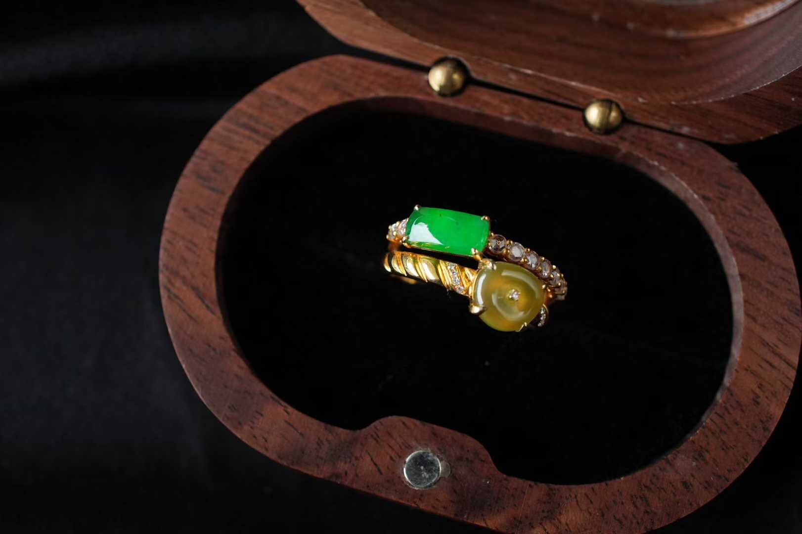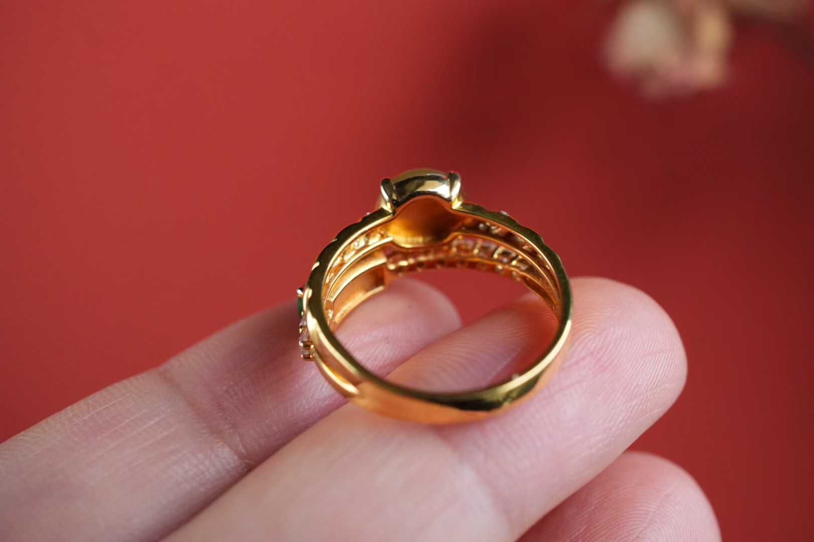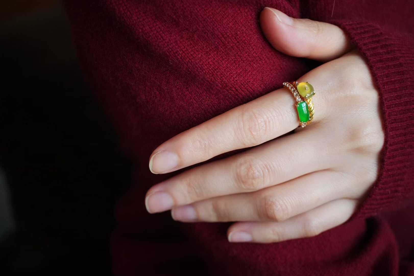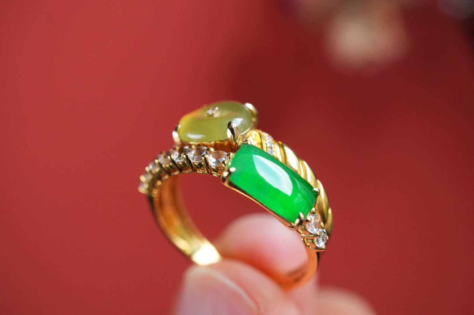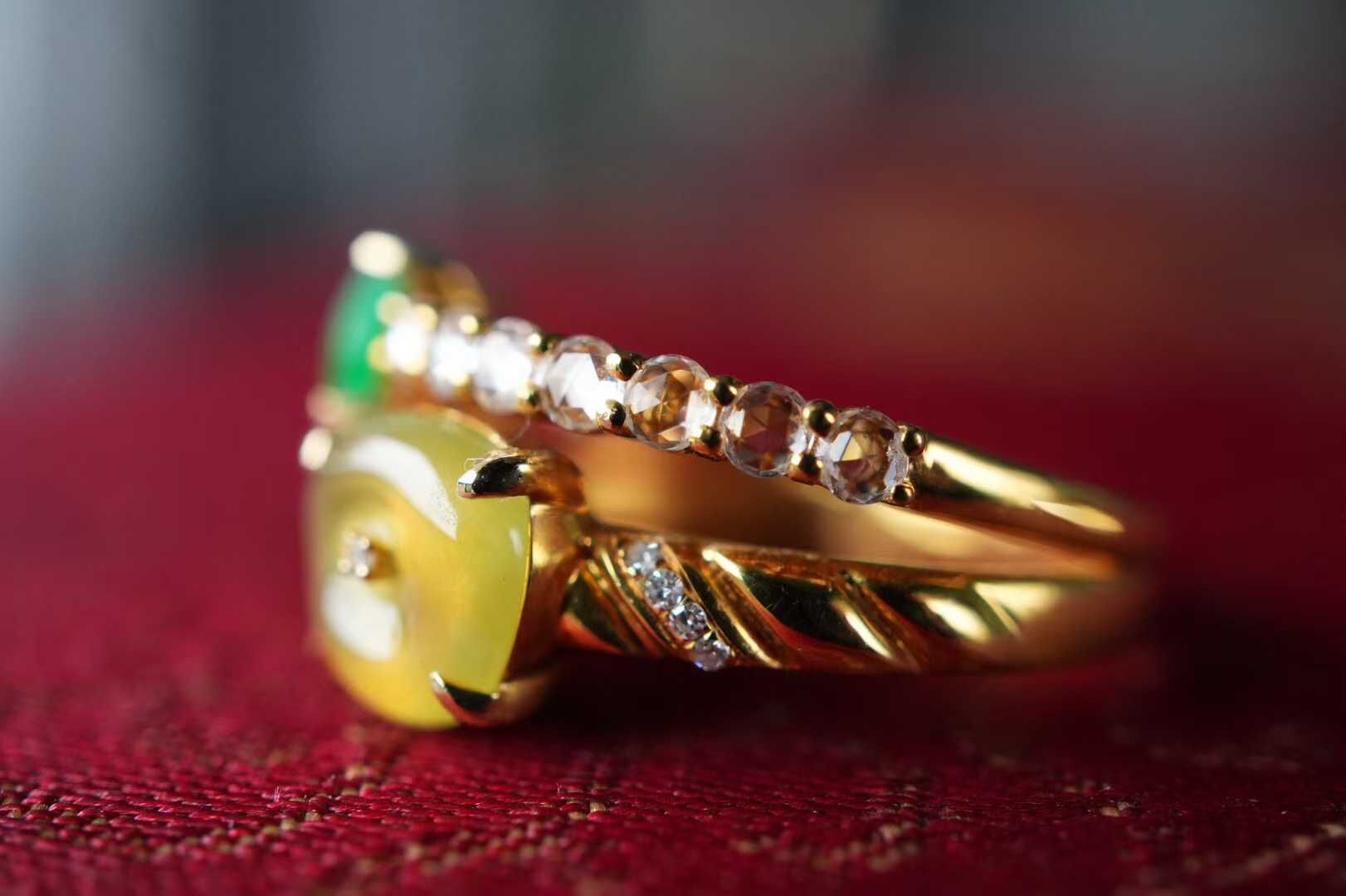 • 翡翠黃翡陽綠拼鑲戒指,天然翡翠A玉, 緬甸玉, Jade, Jadeite