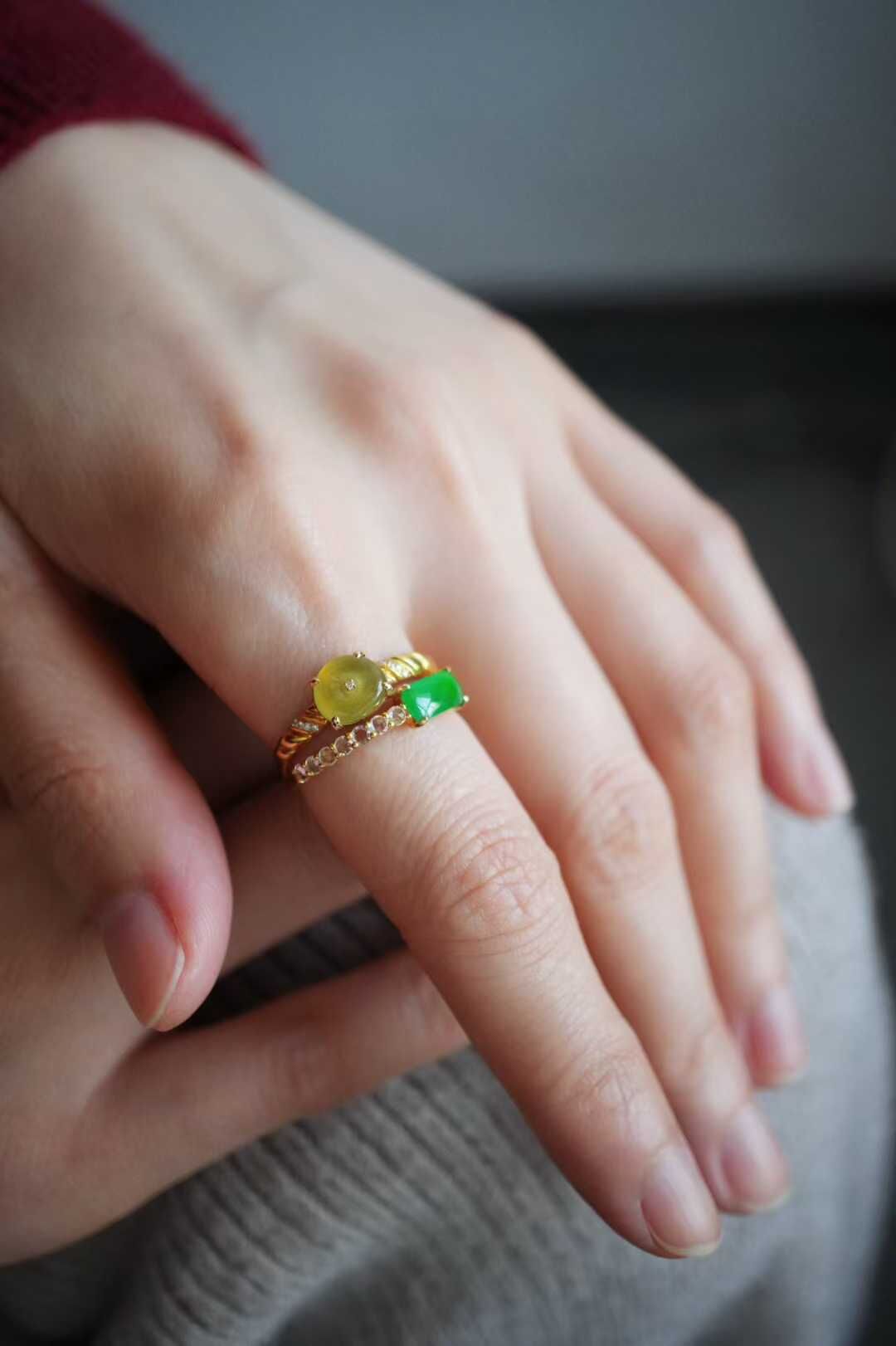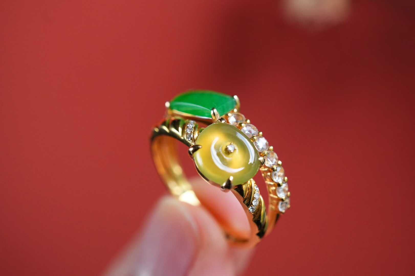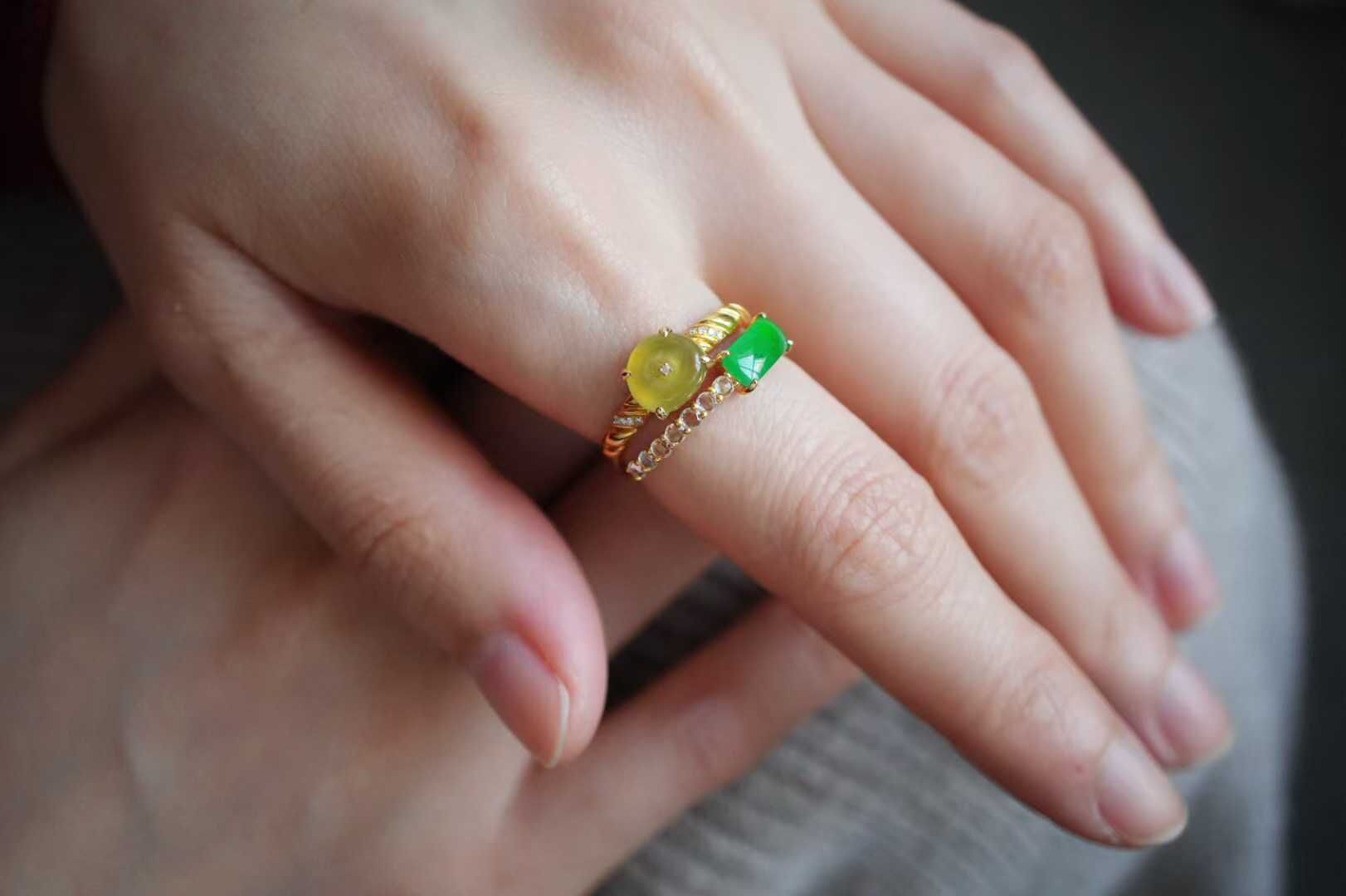天然翡翠A玉,緬料,雙翡疊戴,平安無事,緬料黃翡平安扣配陽綠翡翠戒面,一黃一綠撞出東方的雅致和矜貴,種色俱佳,18K金鑽鑲嵌,伴鑲白色藍寶石,黃翡聚財,陽綠納福,上手顯白又提氣質,戴在指間,既藏吉祥寓意,又為穿搭添上一抹精緻。
