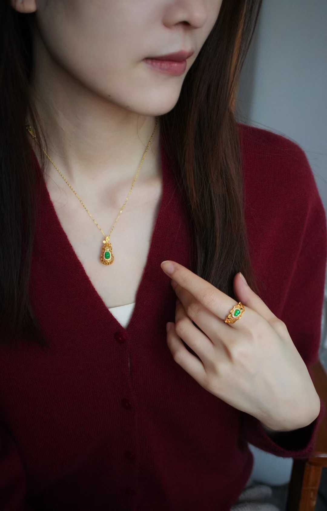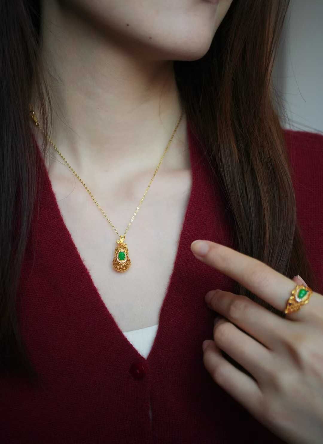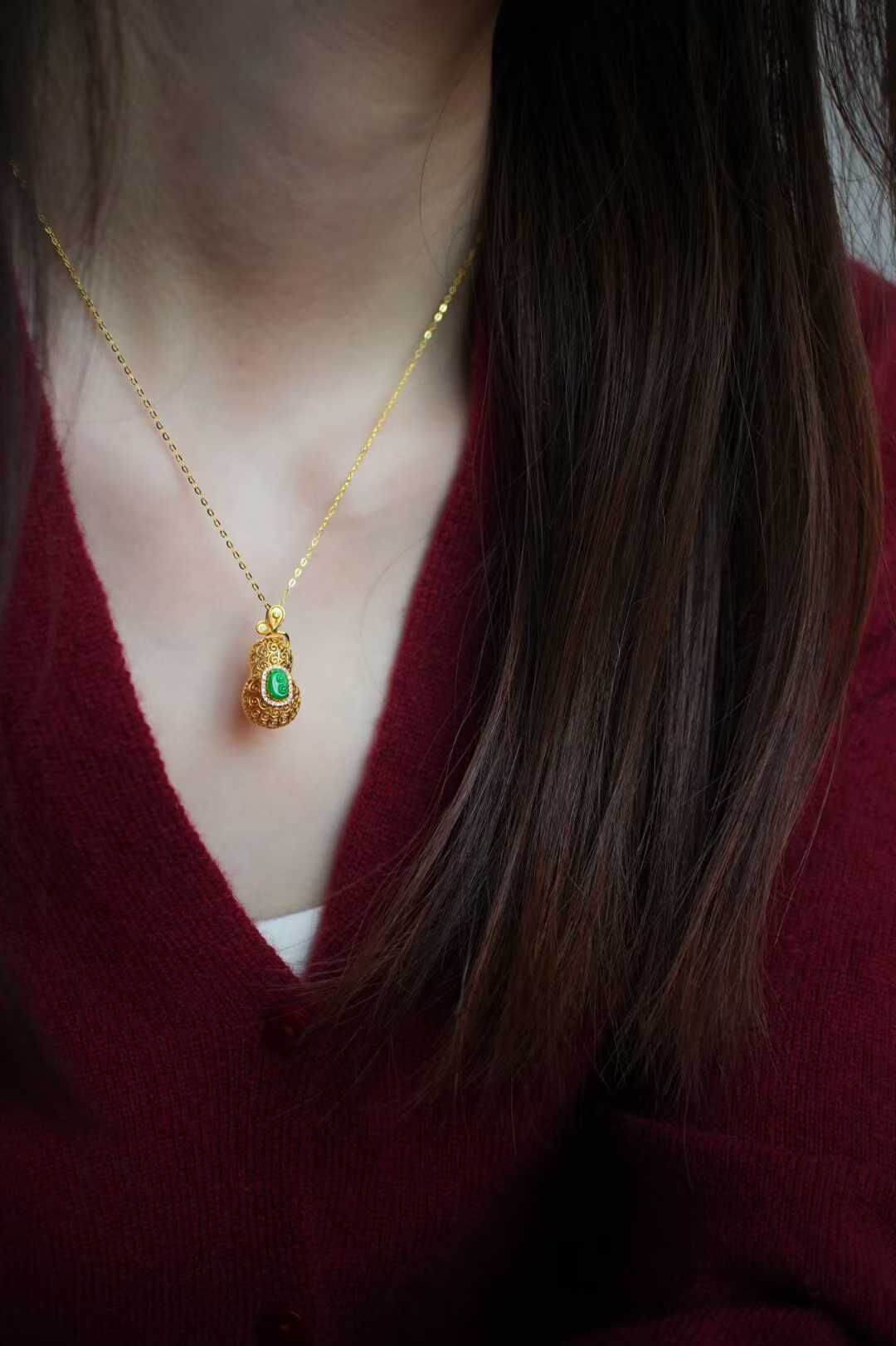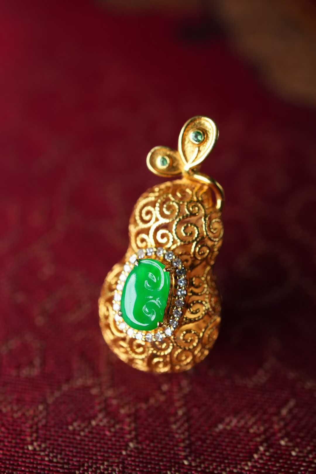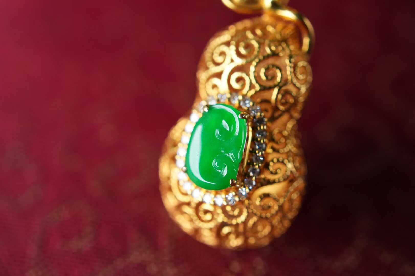 天然翡翠A玉,緬料,金縷纏葫,福祿隨身,緬料陽綠翡翠如意,種色俱佳,小而精,葫蘆的造型藏著納福的心意