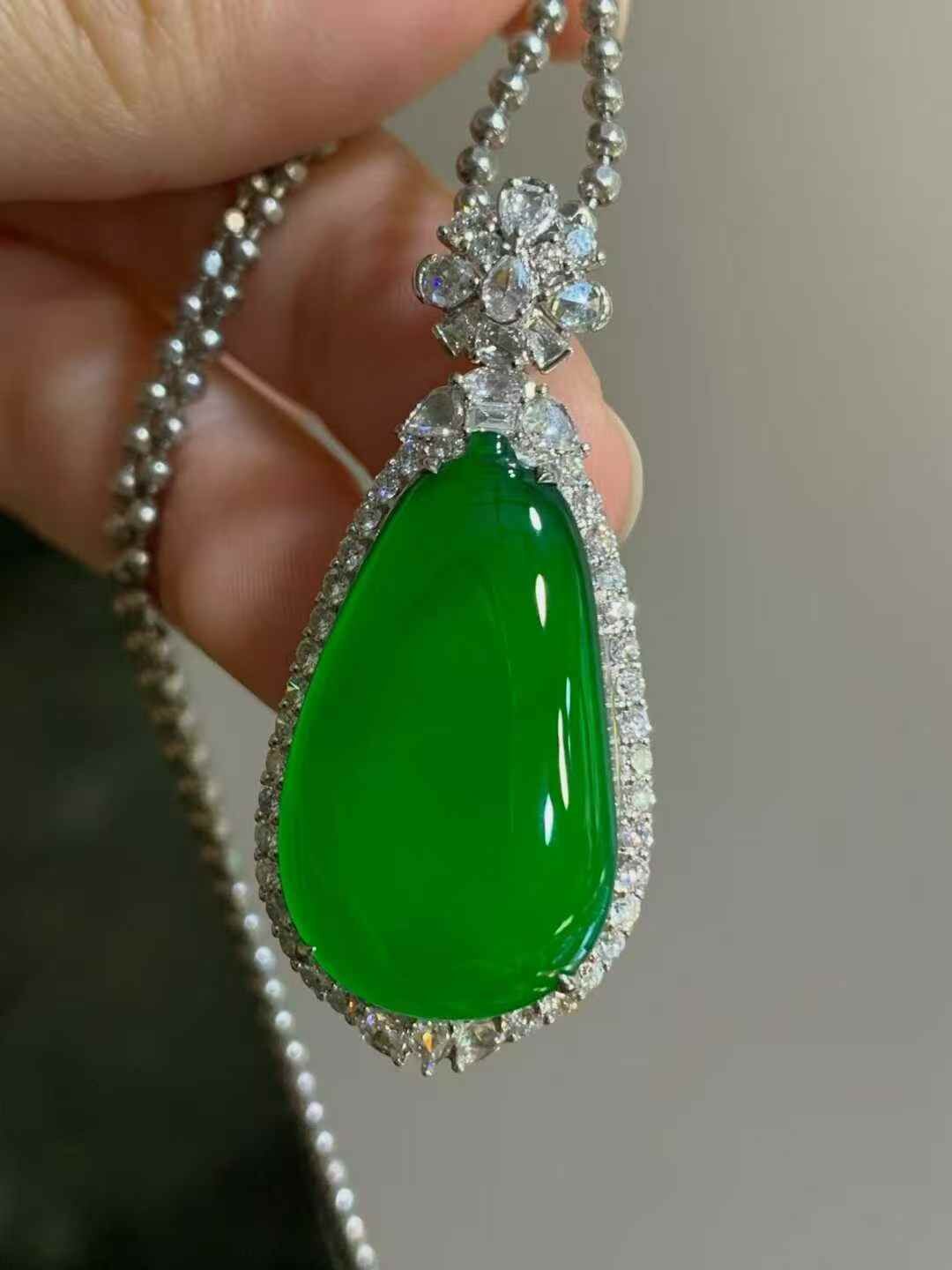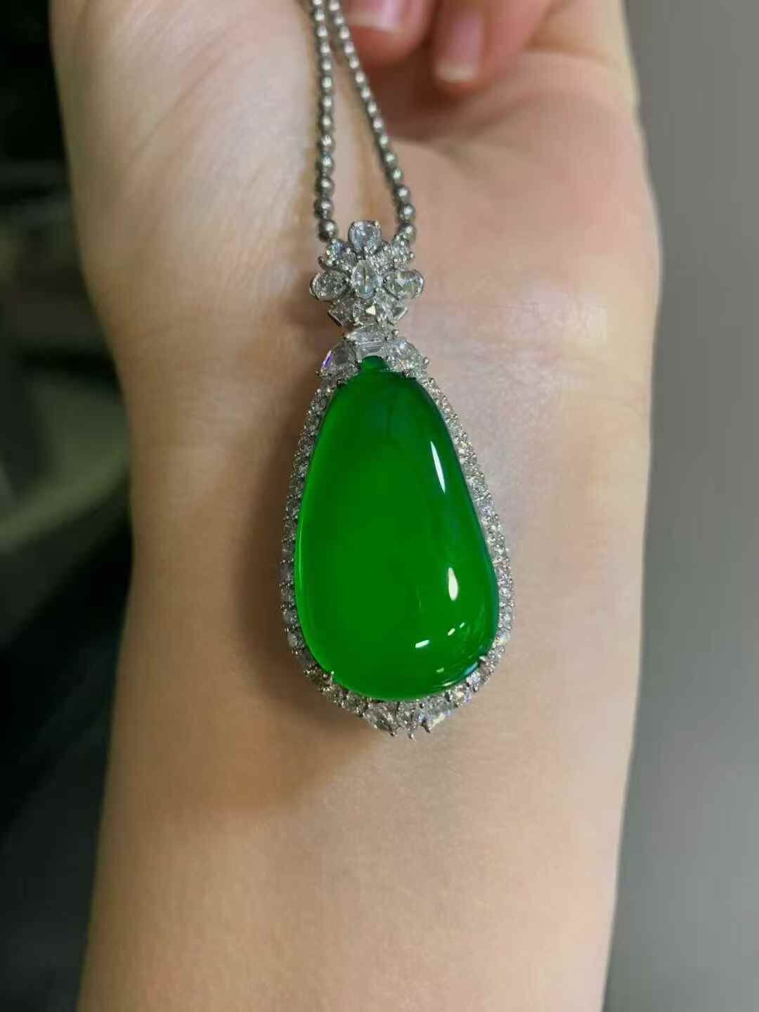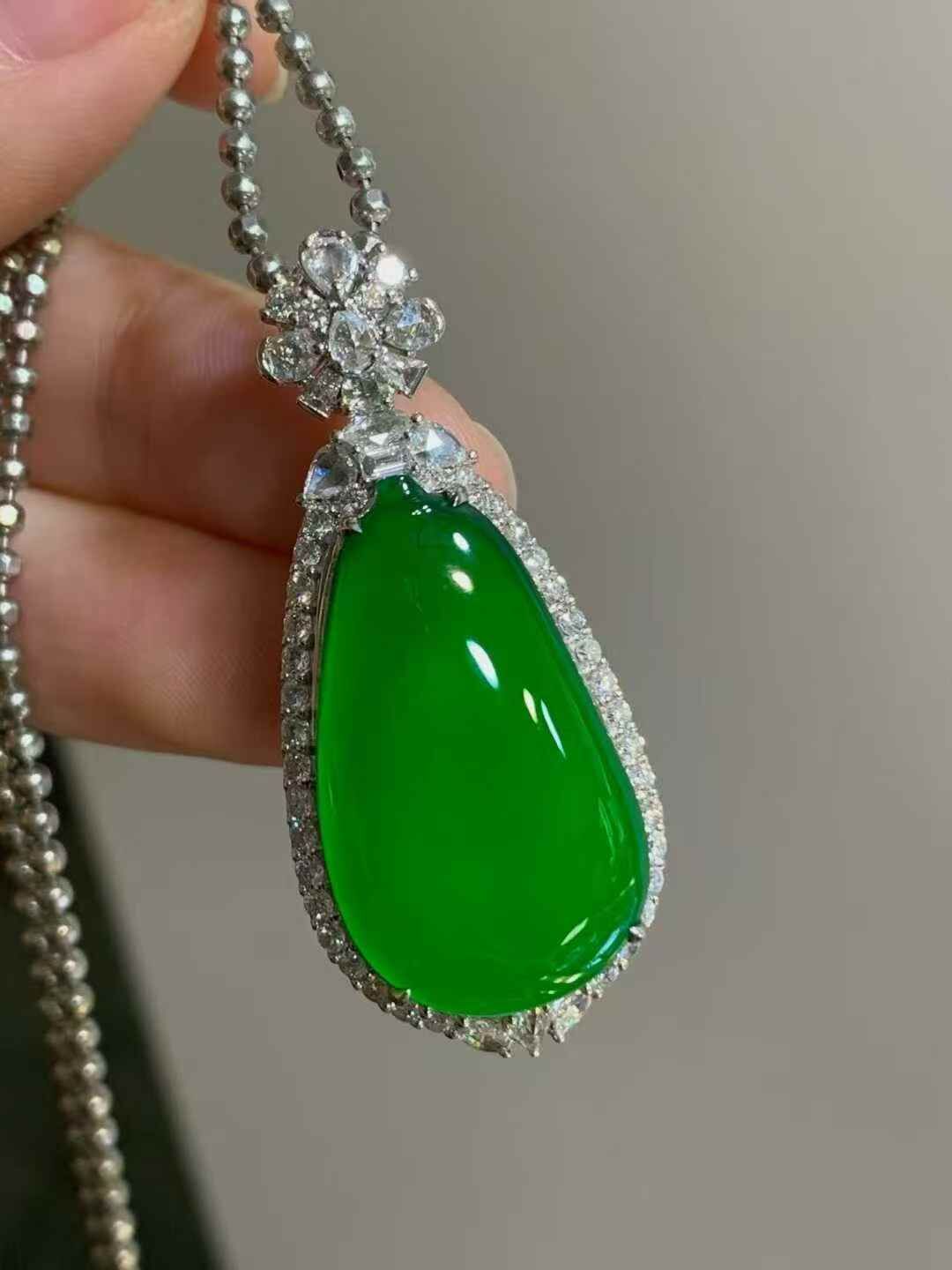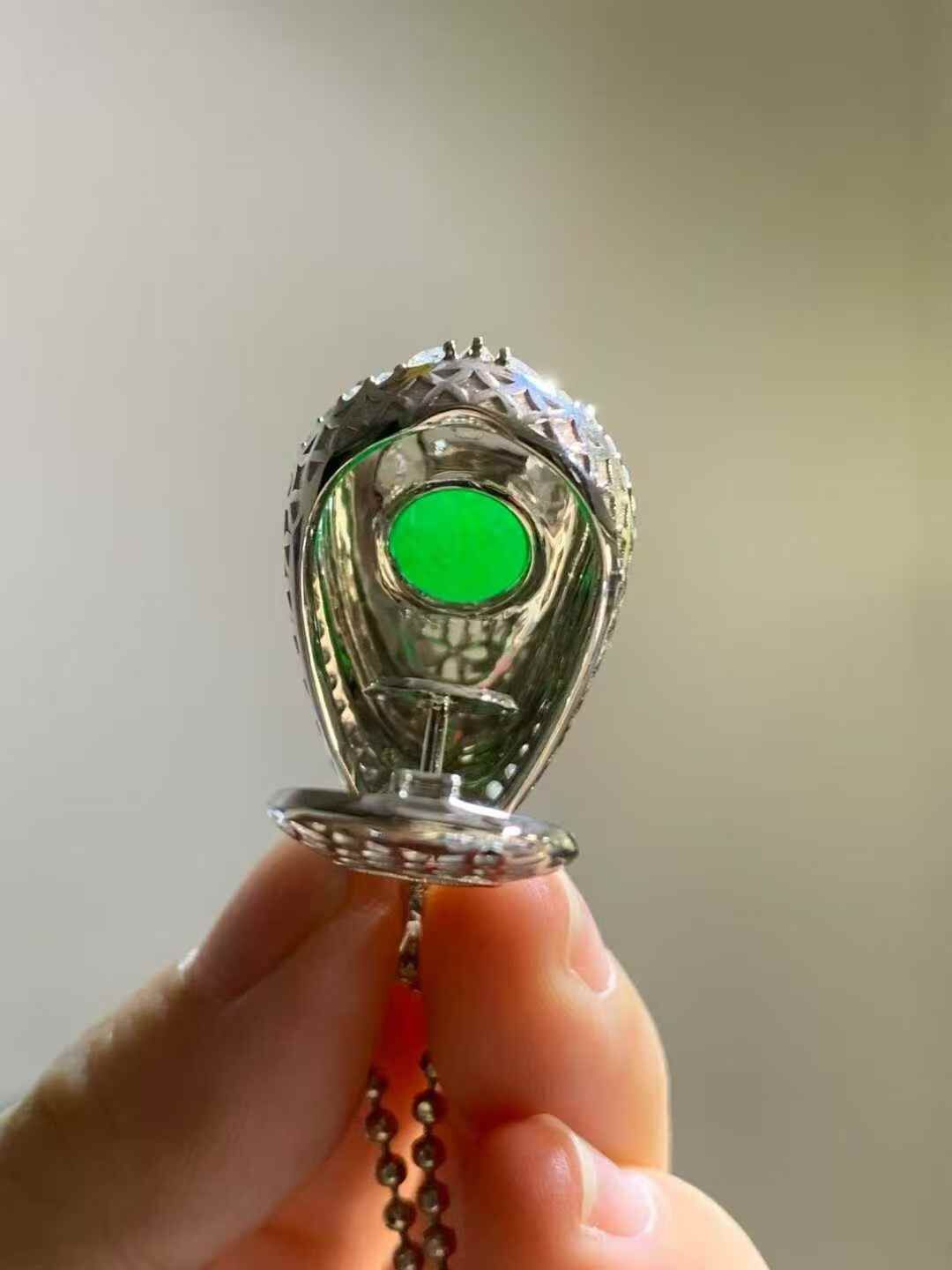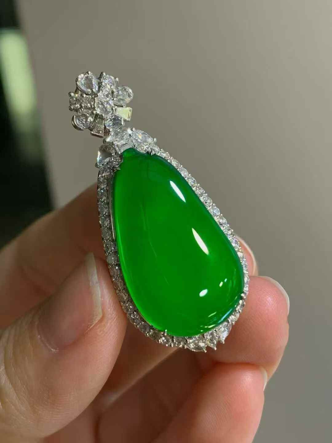 天然翡翠A玉,種老細膩,色陽濃郁起膠,18k金鑲嵌。