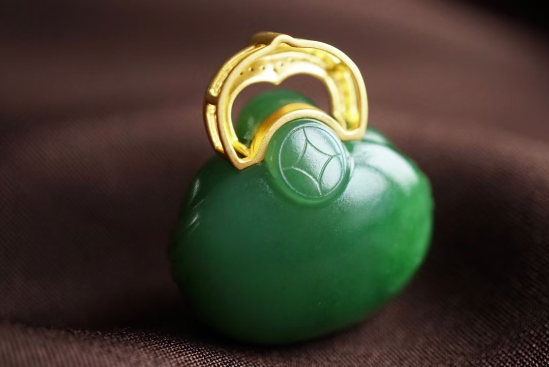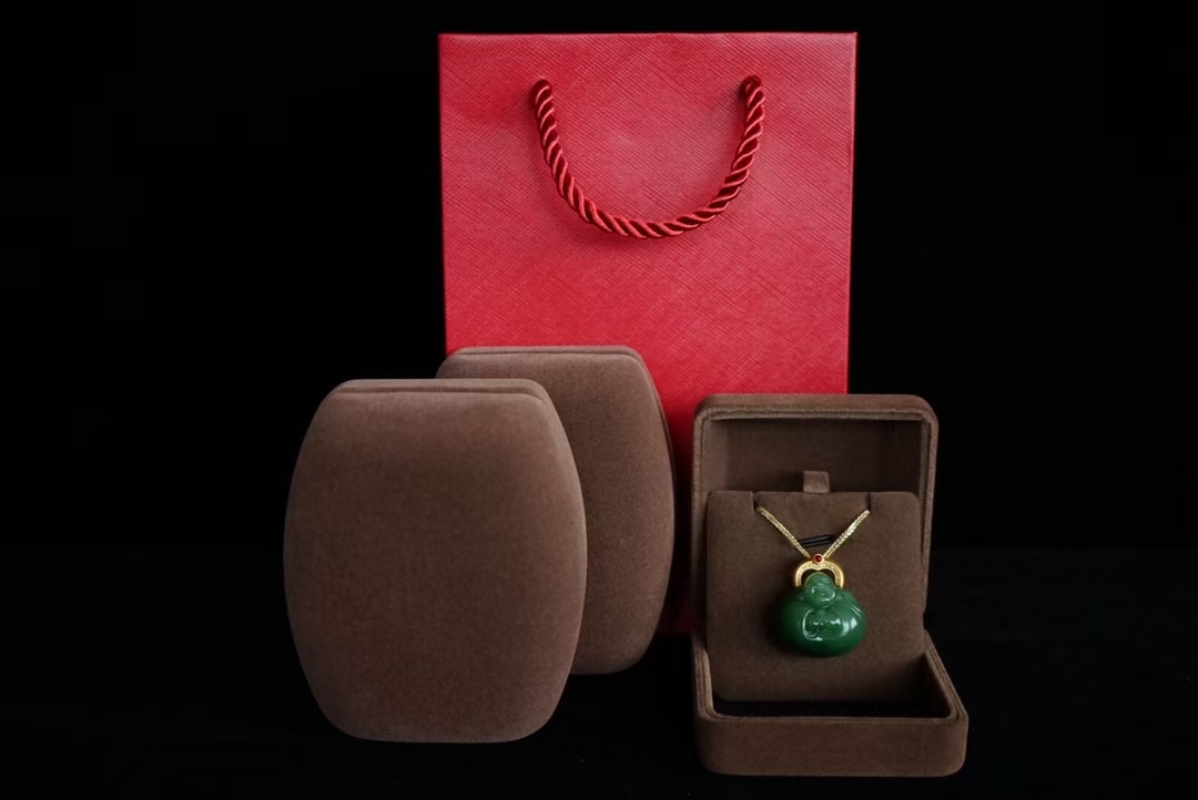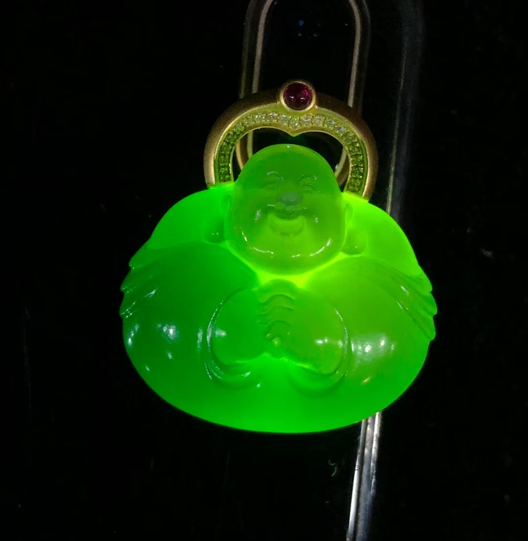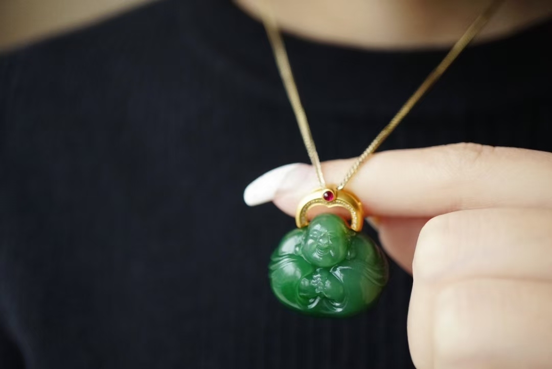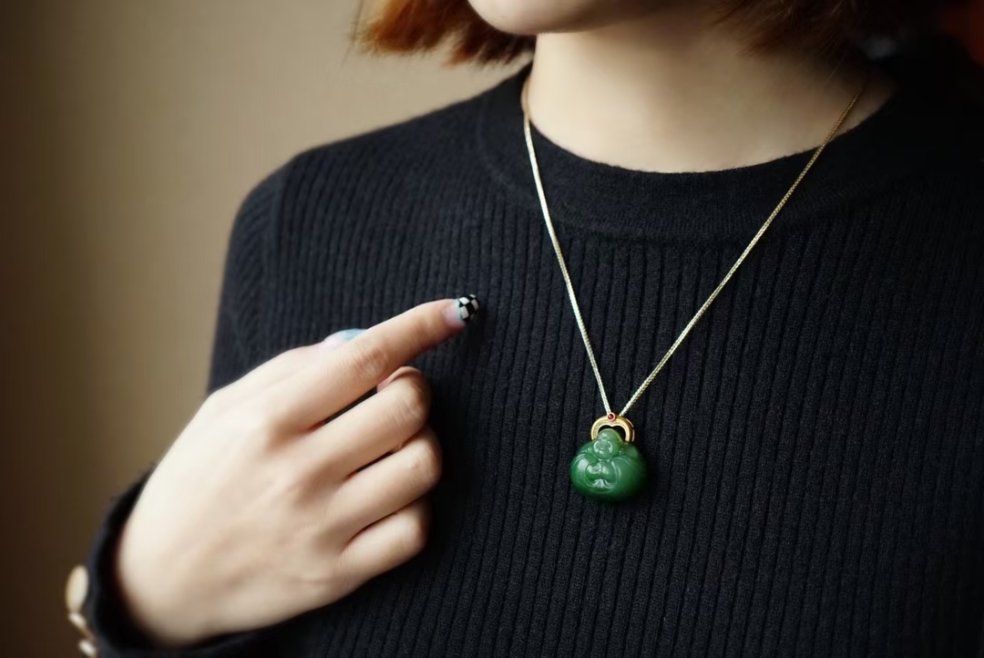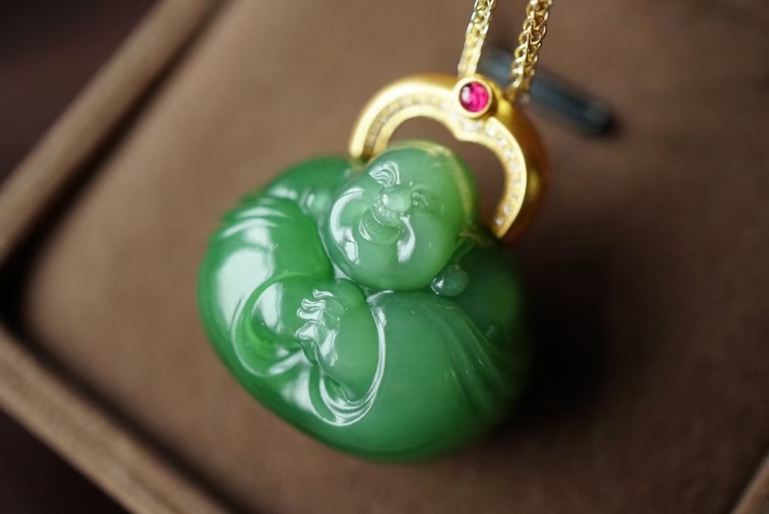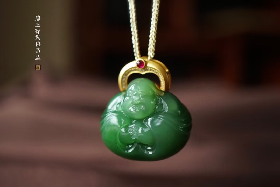 和田玉碧玉果綠,濃鬱果綠漸變色,顏色濃鬱,料子密度高油性好,質地細膩,過燈乾淨,肉眼幾乎無棉無水線,無雜無裂完美品相。型體圓潤飽滿,蘇工立體精雕彌勒佛一尊,佛公開臉喜氣憨態可掬,雕刻生動,線條流暢圓潤,衣褶五官等纖微畢現,細節精緻形象,寓意大肚能容笑口常開。18K金厚金鑲嵌,扣頭鑽石圍鑲,紅寶石點綴,設計別致,如佛光普照,佩戴典雅大方。