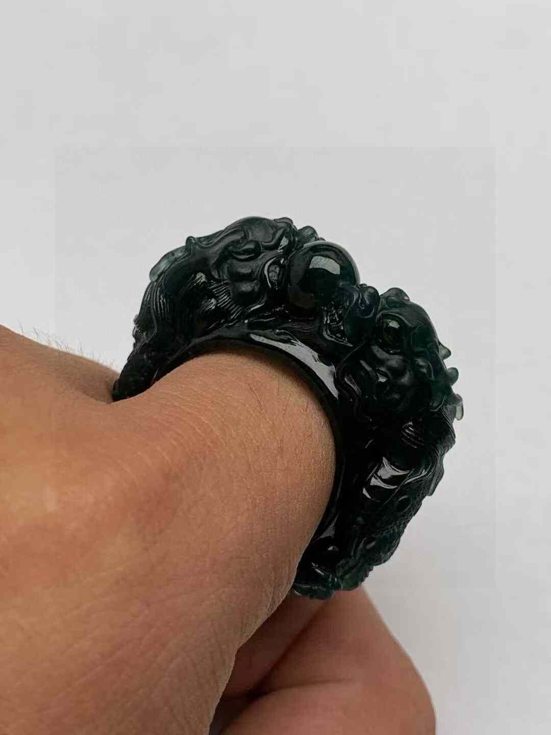 • 翡翠墨翠雙龍戲珠指環,天然翡翠A玉, 緬甸玉, Jade, Jadeite