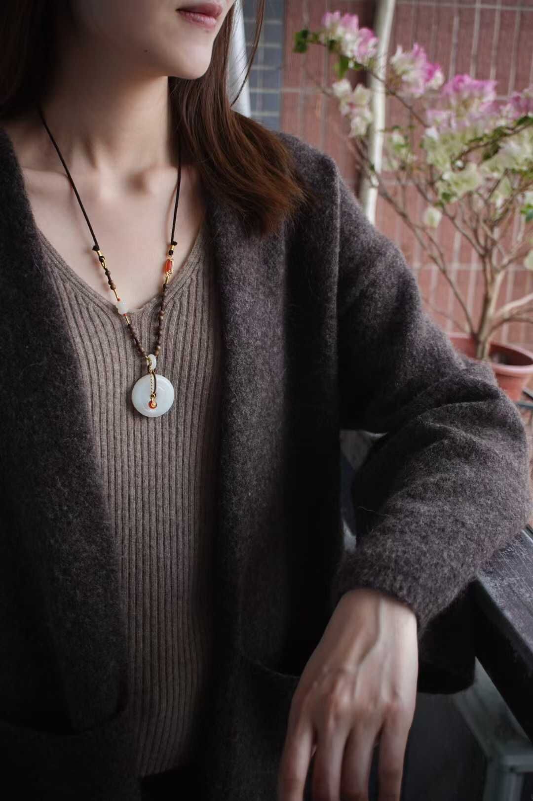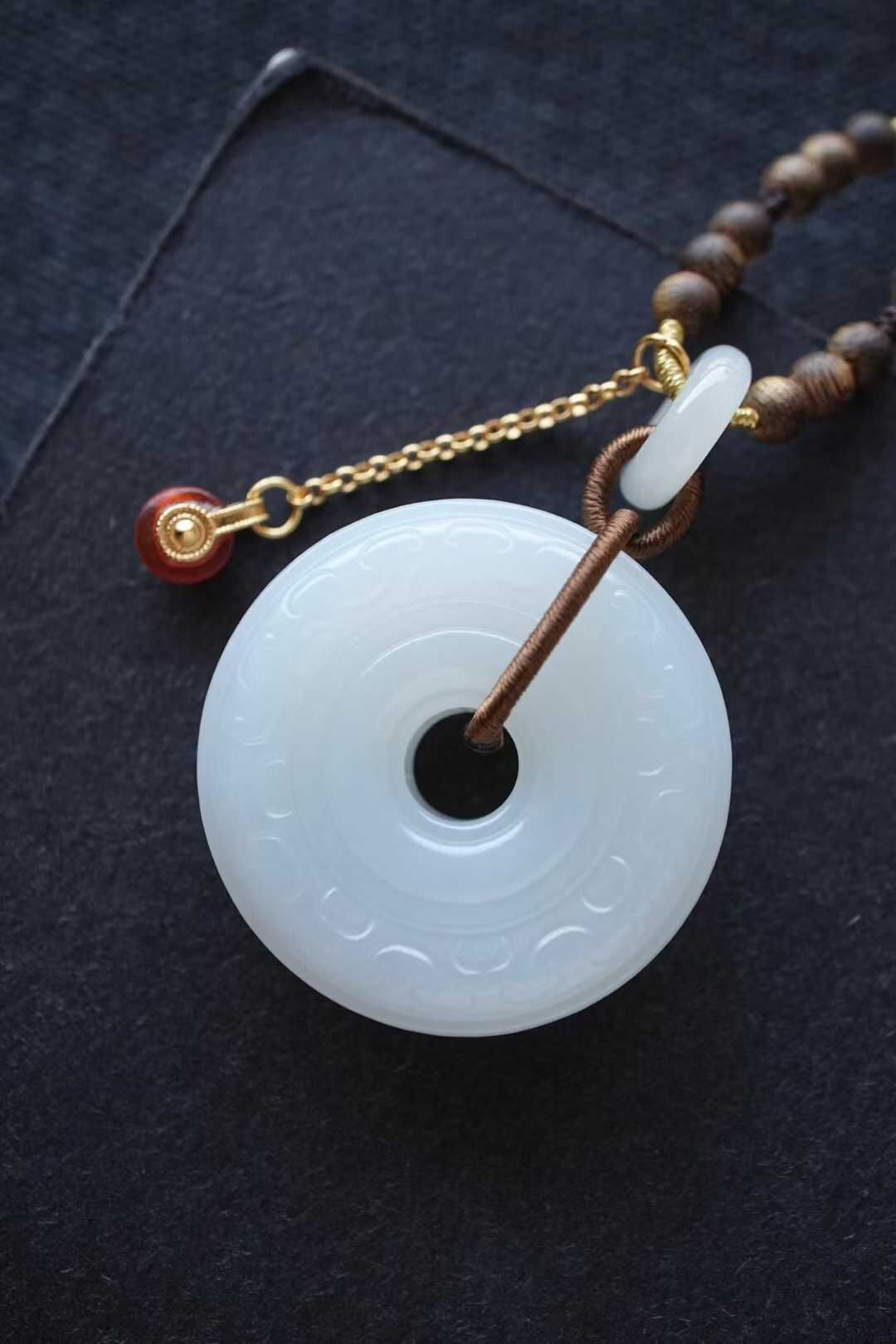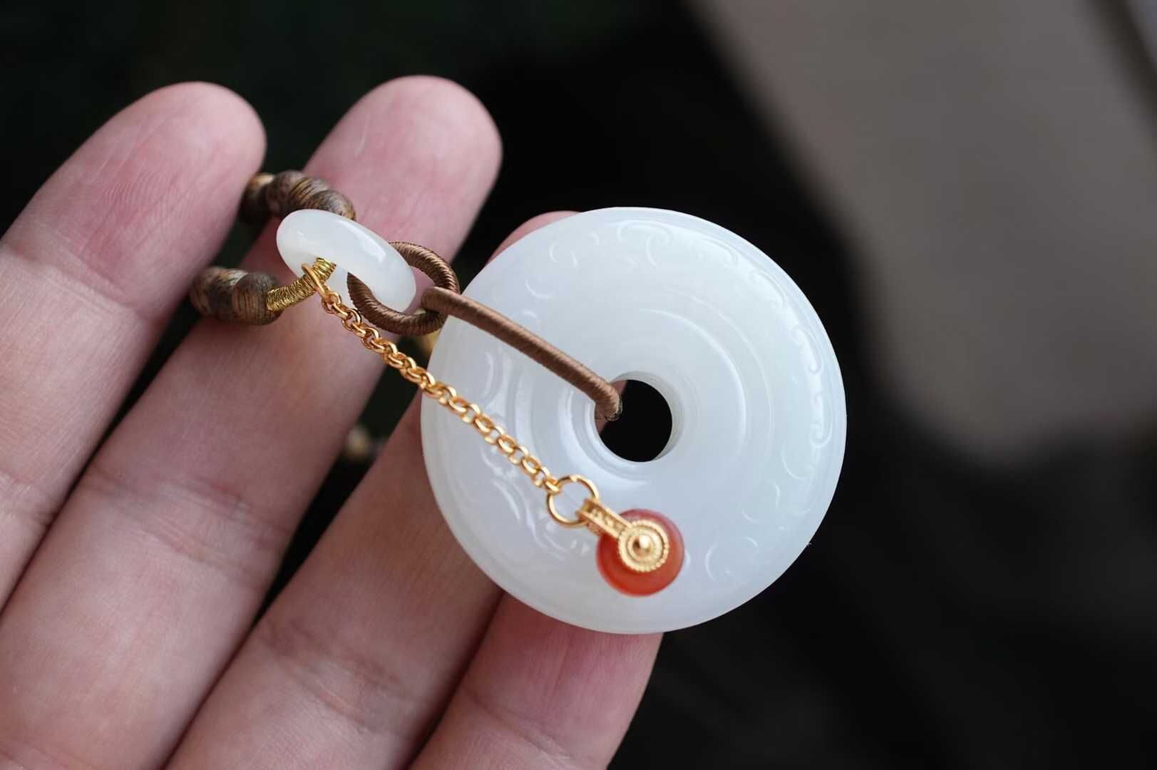 平安扣外圈圓融,內圈圓滿,純手工雕刻連綿祥雲紋,線條婉轉流暢,如雲霧舒卷。純手工製作進口調節繩,點綴天然沉香、白玉並蒂蓮、白玉甜甜圈、純銀鍍金配飾,寓意「吉祥如意、福運綿延」,淡淡雅香,自戴或送禮皆是心意之選。金屬部分均為925純銀鍍金。