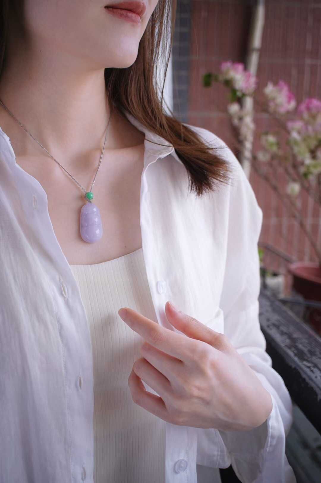 天然翡翠A玉,緬料,老坑種,淡紫調溫柔清新,質地細膩瑩潤,三粒福豆飽滿圓潤,品相佳,實物好好看,自然光下不失色,實力裸鑲。