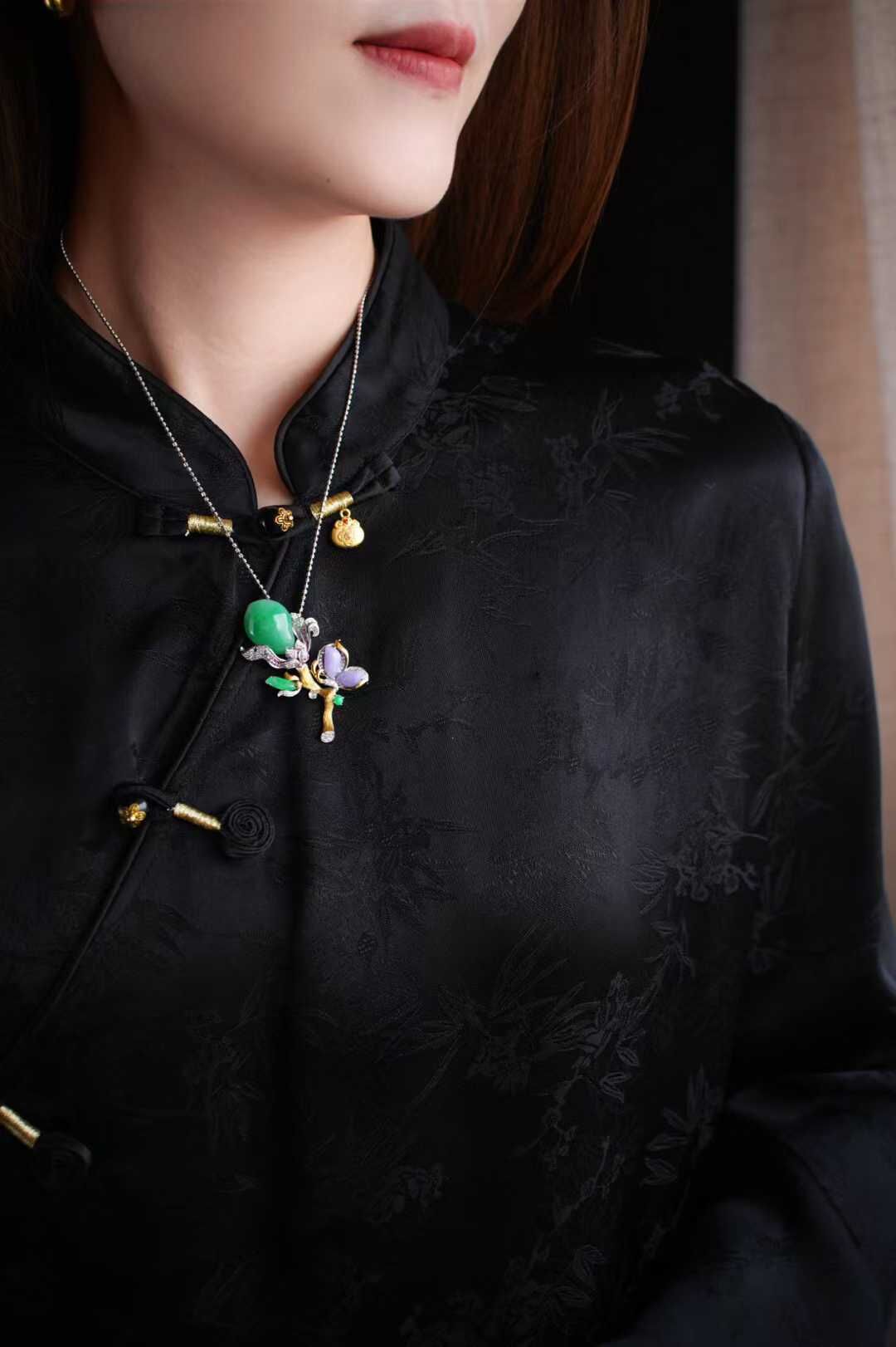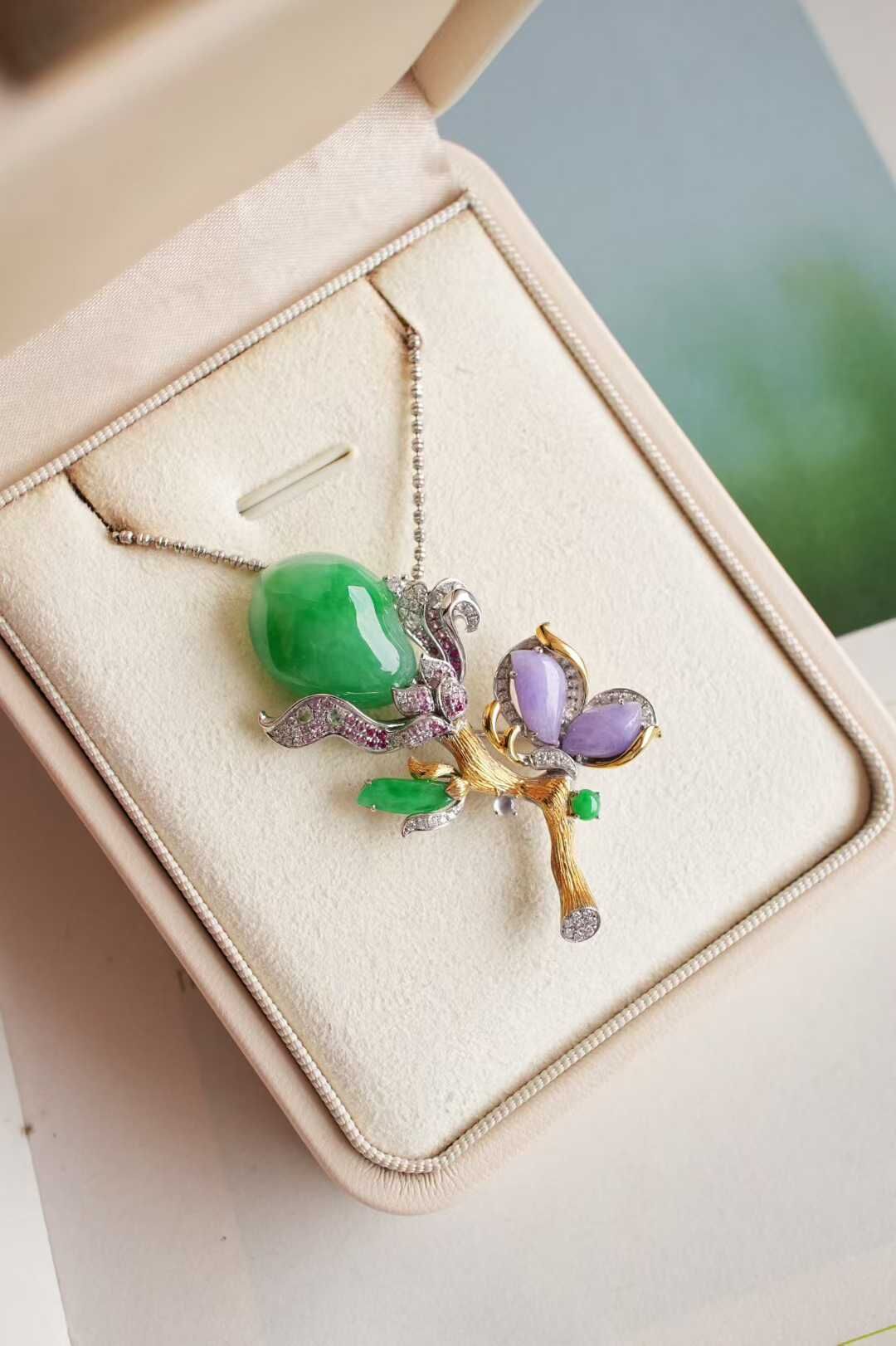 正陽綠翡翠的濃艷,撞上紫羅蘭翡翠的溫婉,妥妥的「春帶彩」名場面,一眼淪陷。翠紫撞色濃烈卻不失雅致,現代工藝與東方意象交融,華貴中透著溫婉。