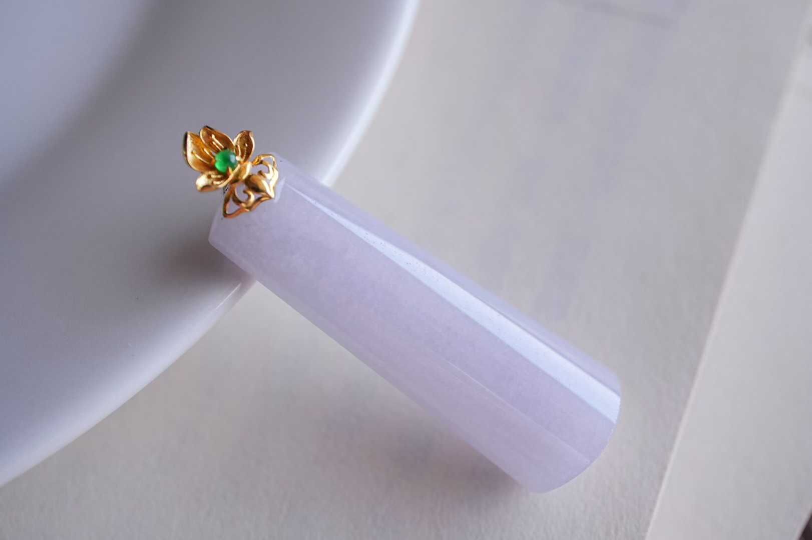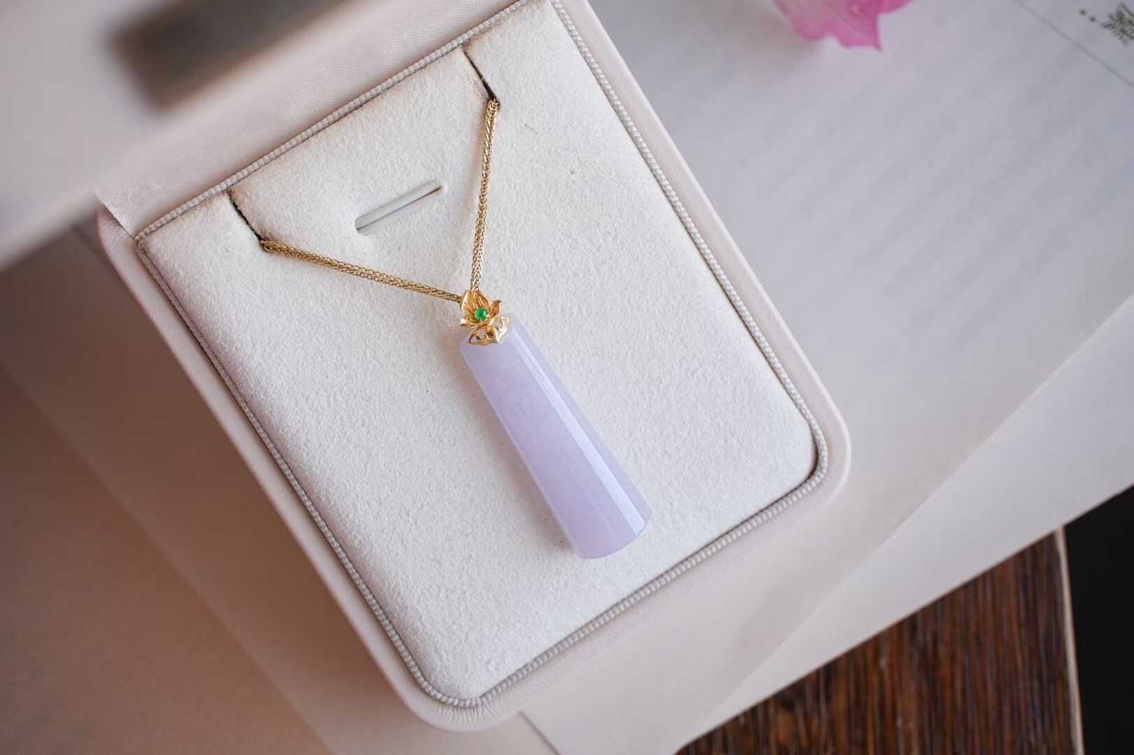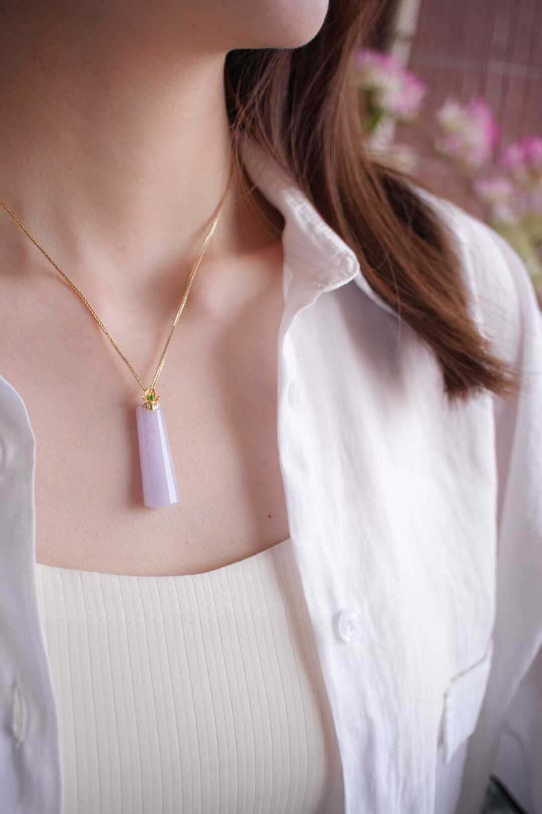 天然翡翠A玉,緬料,老坑種,冰透起光感,水潤細膩,品相漂亮。紫羅蘭本身嫵媚,溫柔,做成長形的無事牌,立馬中和了嫵媚氣質,顯得更大方。