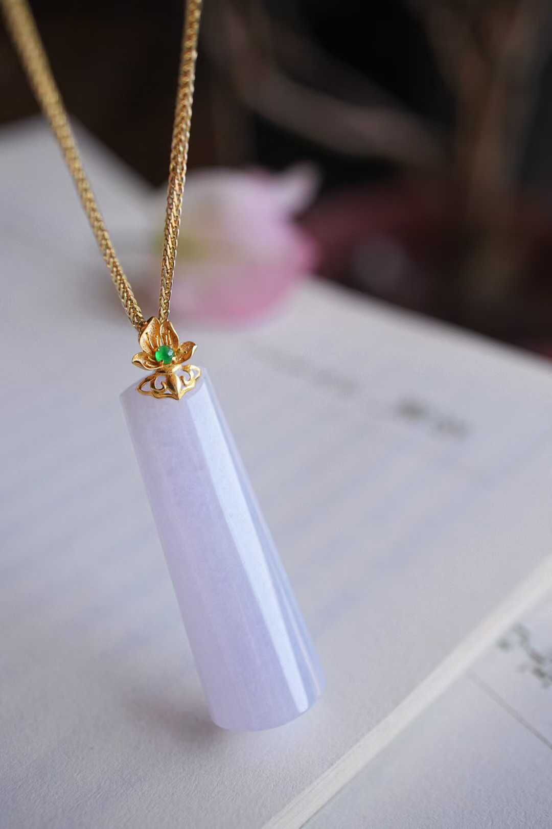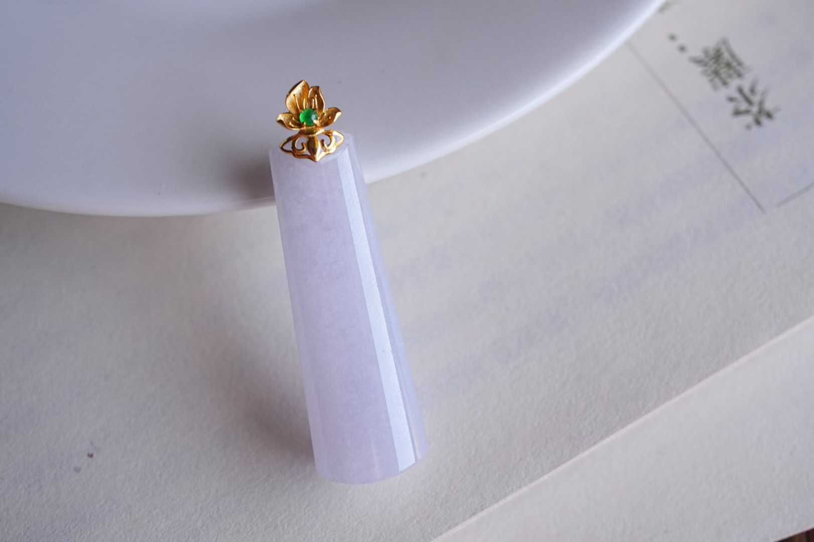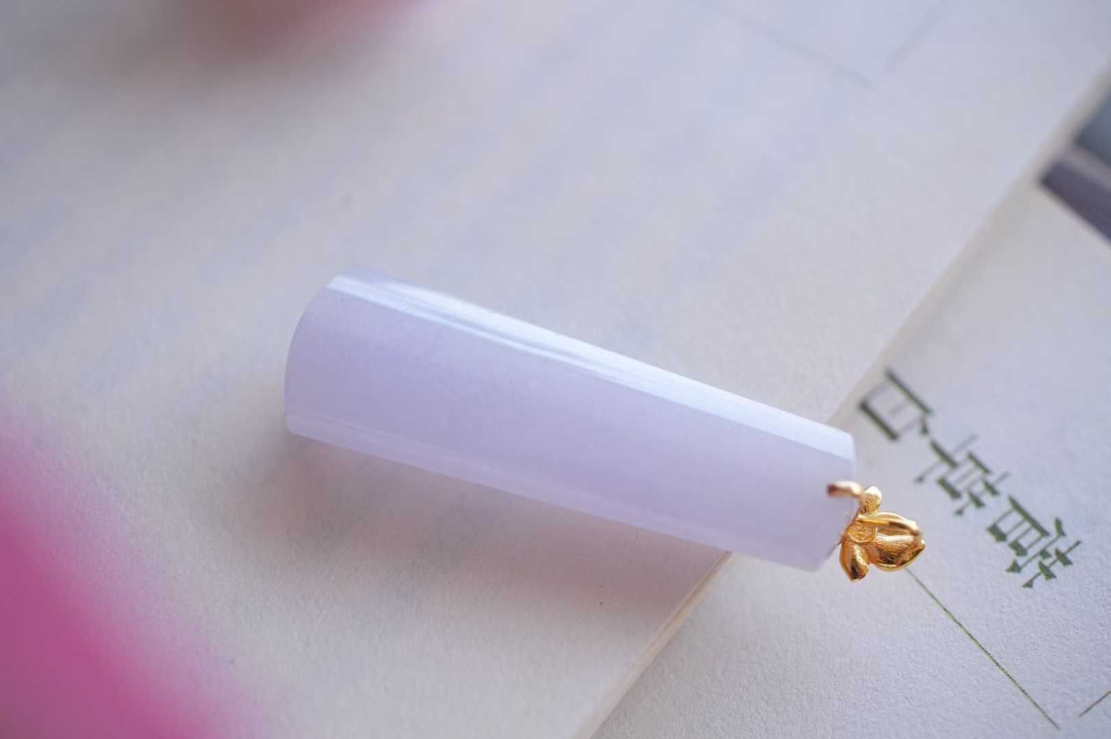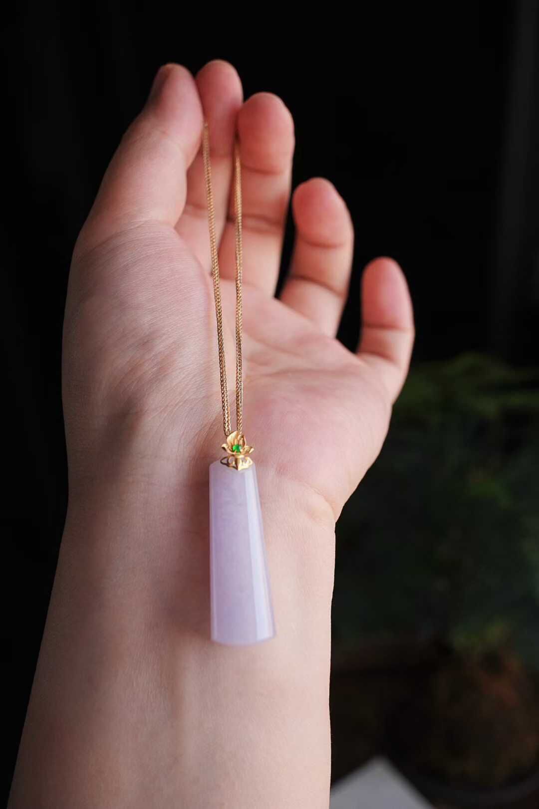 天然翡翠A玉,緬料,老坑種,冰透起光感,水潤細膩,品相漂亮。紫羅蘭本身嫵媚,溫柔,做成長形的無事牌,立馬中和了嫵媚氣質,顯得更大方。