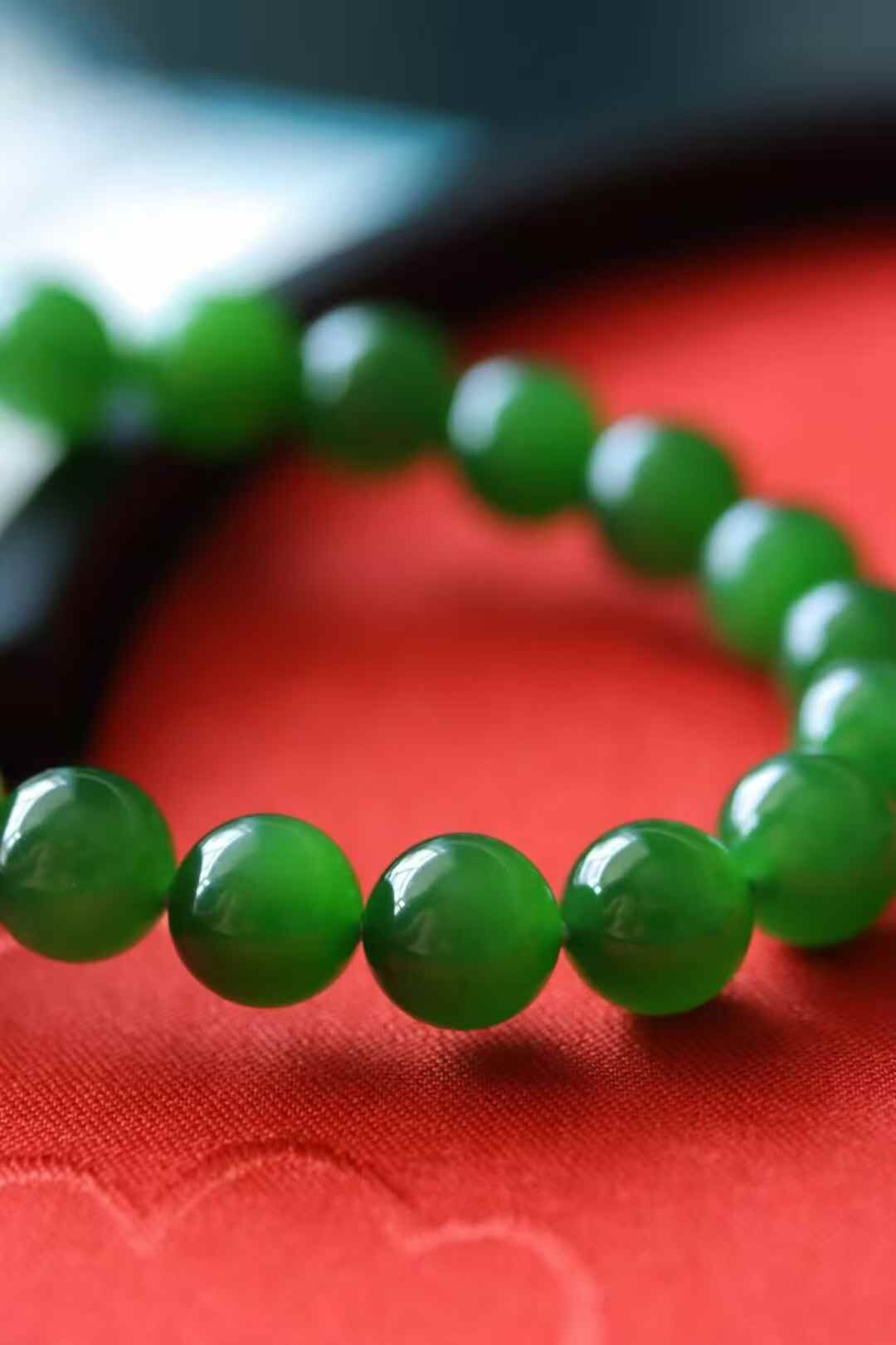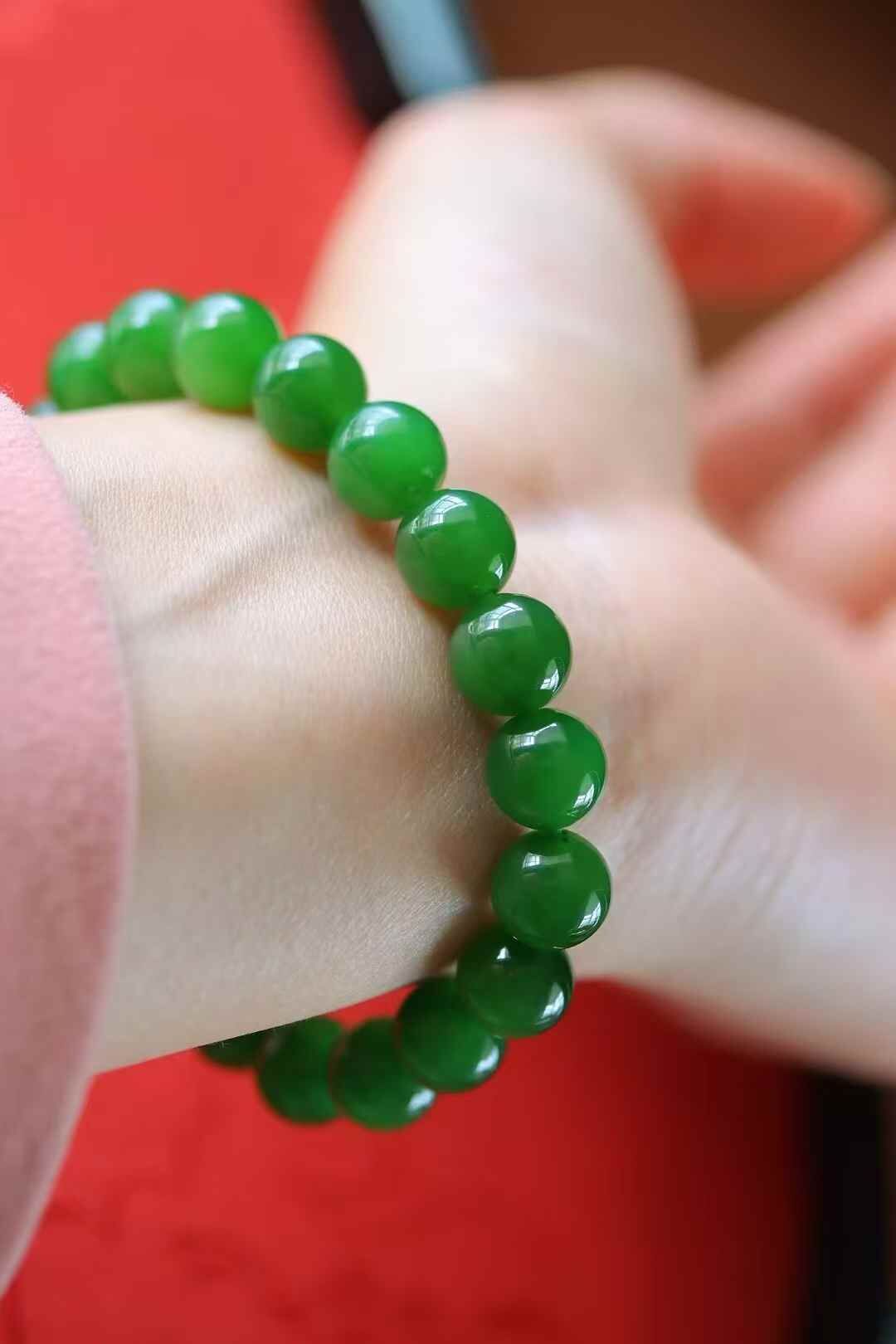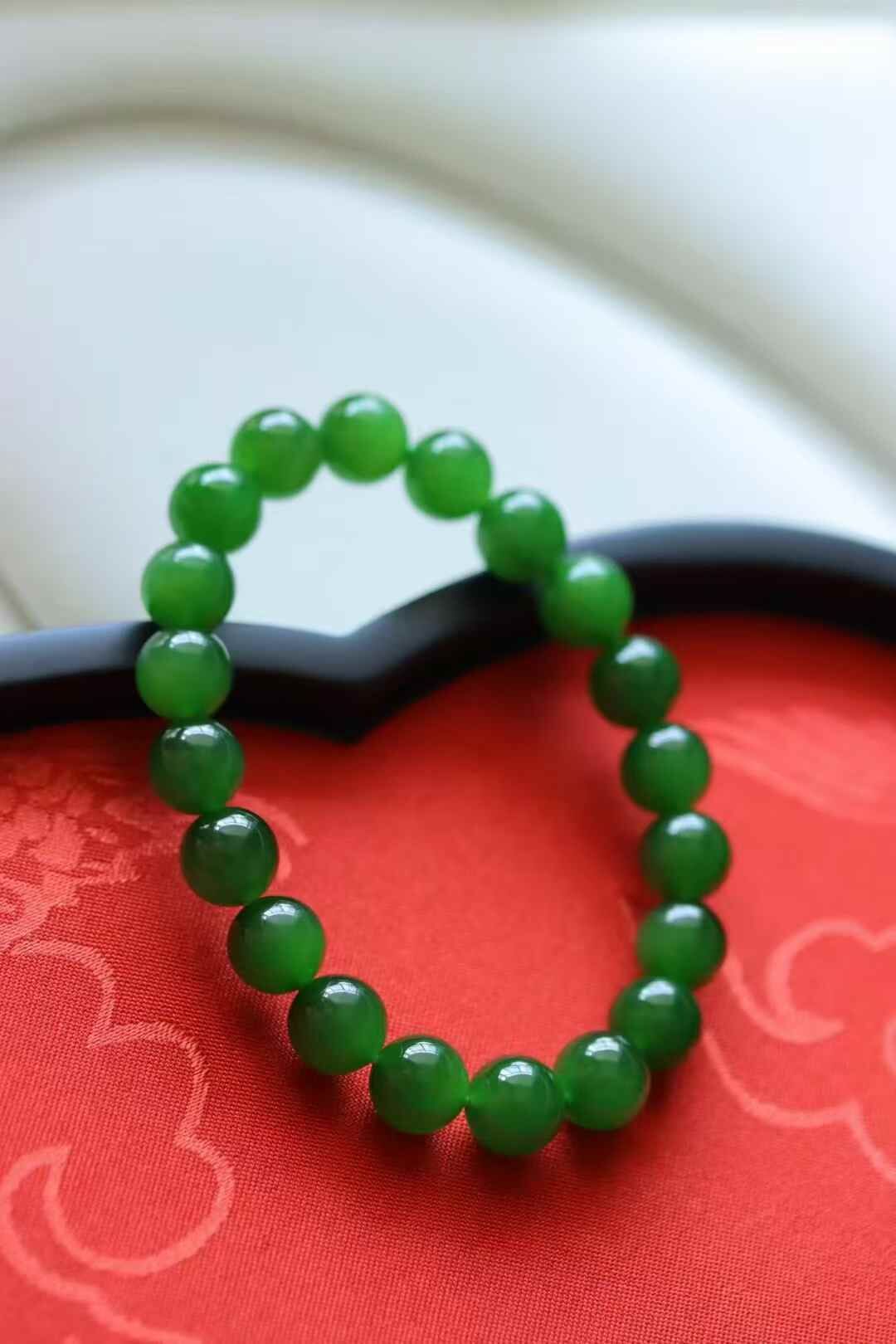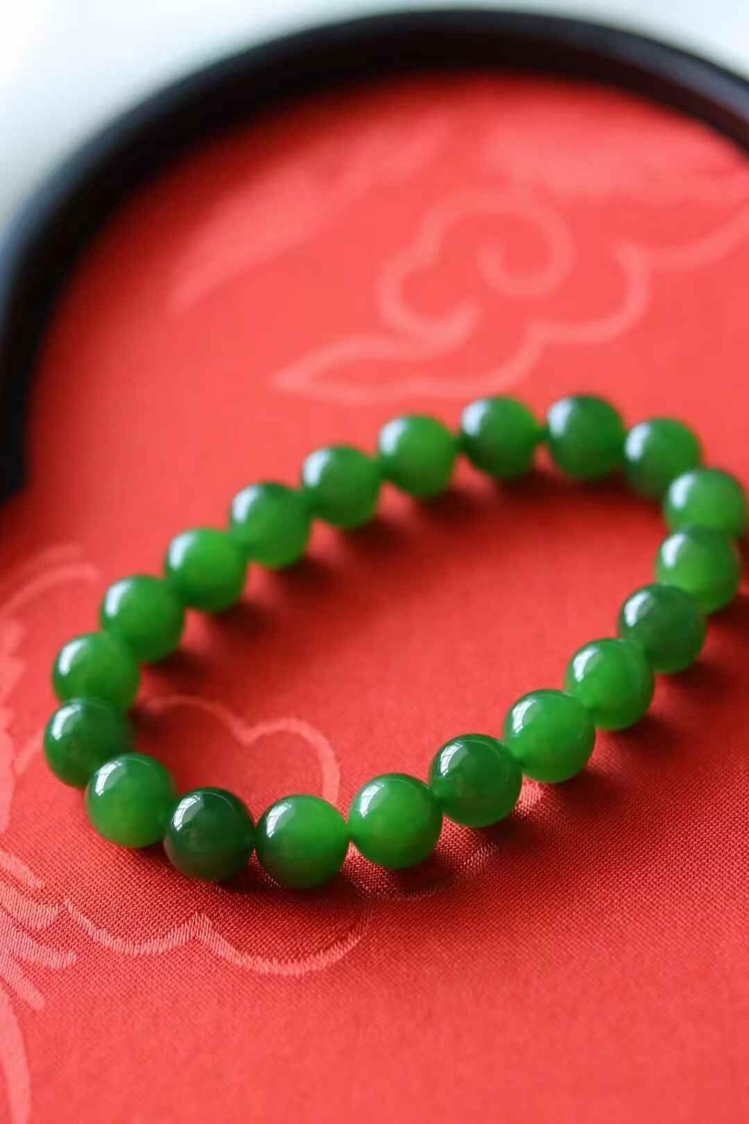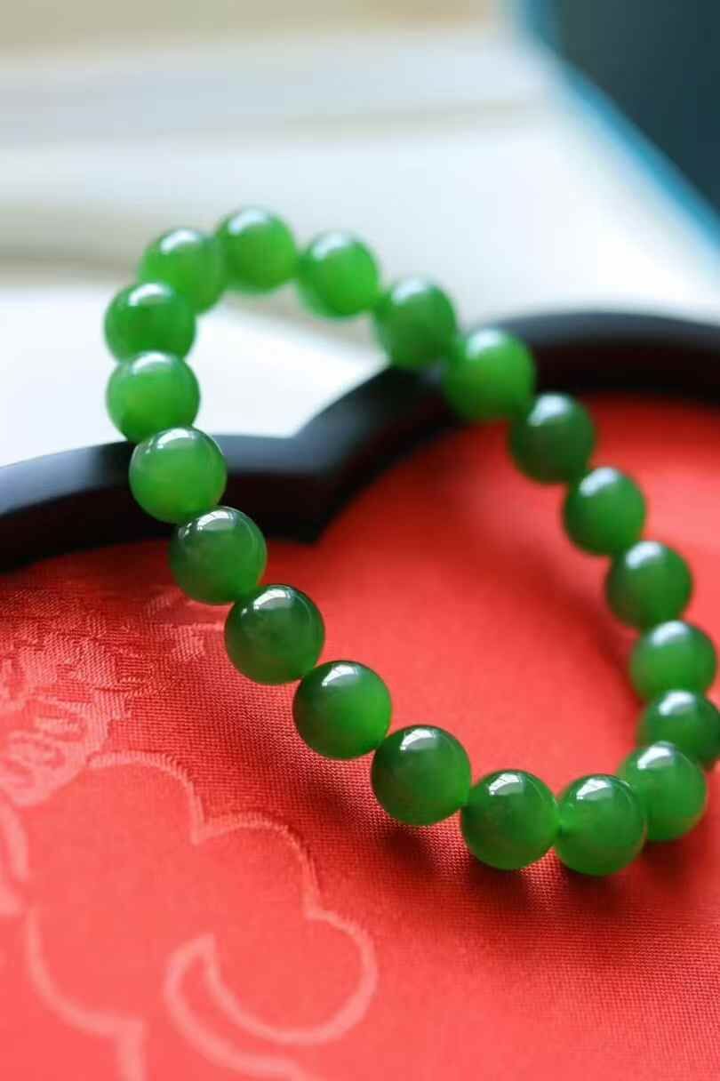 天然和田玉,老坑冰陽綠碧玉手串,俄碧老坑料,標準的正陽綠色,濃艷飽和,色調純正,明亮艷麗,不發灰。