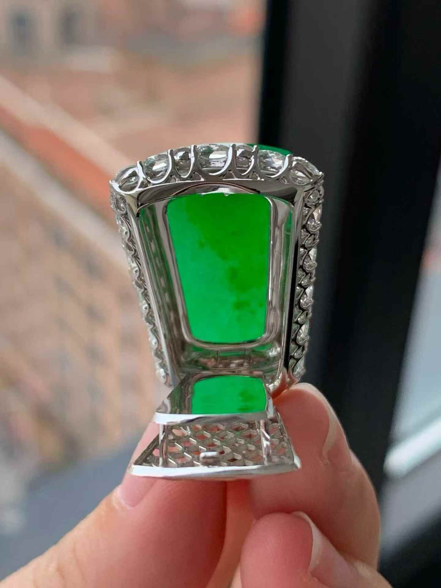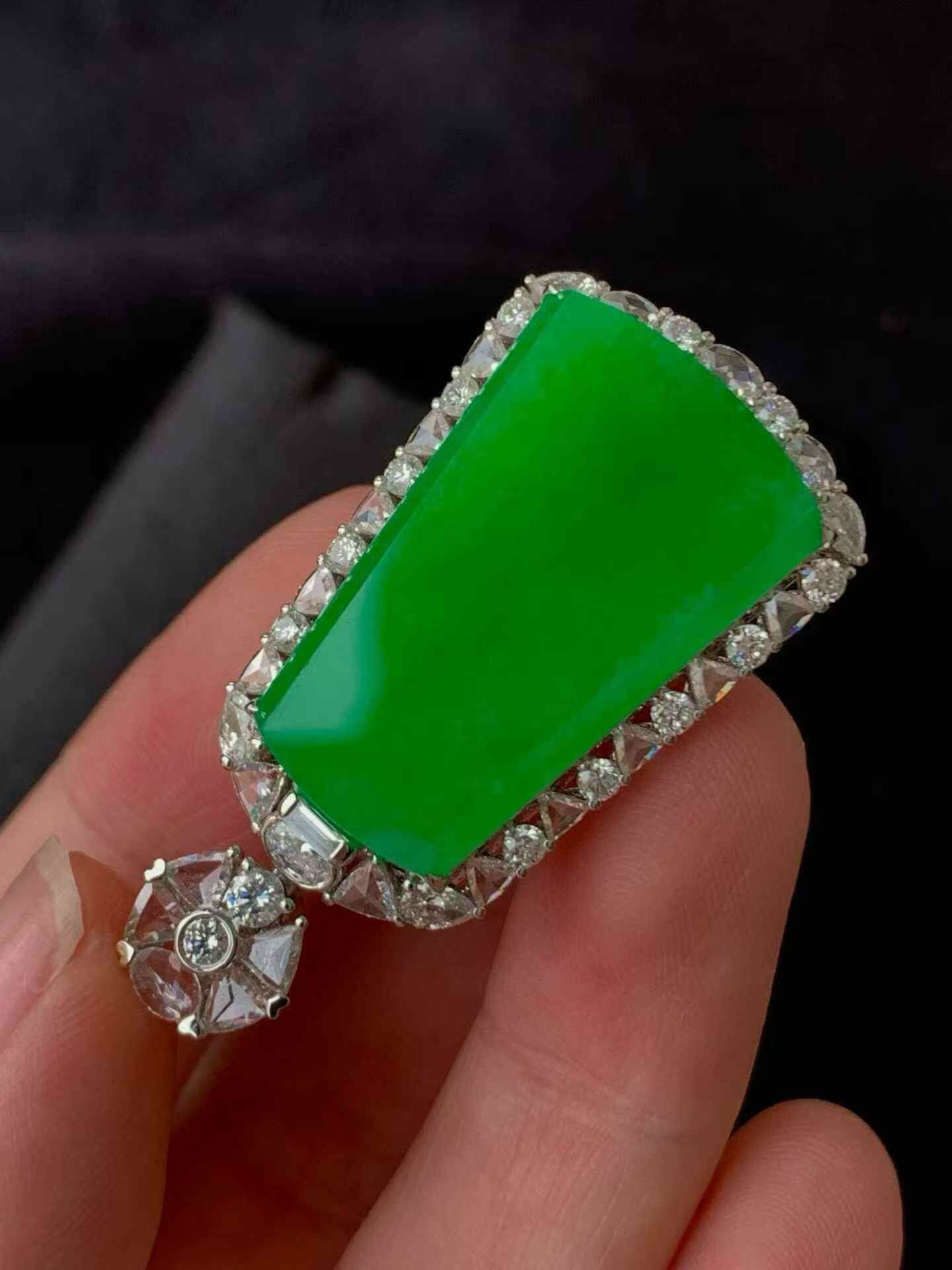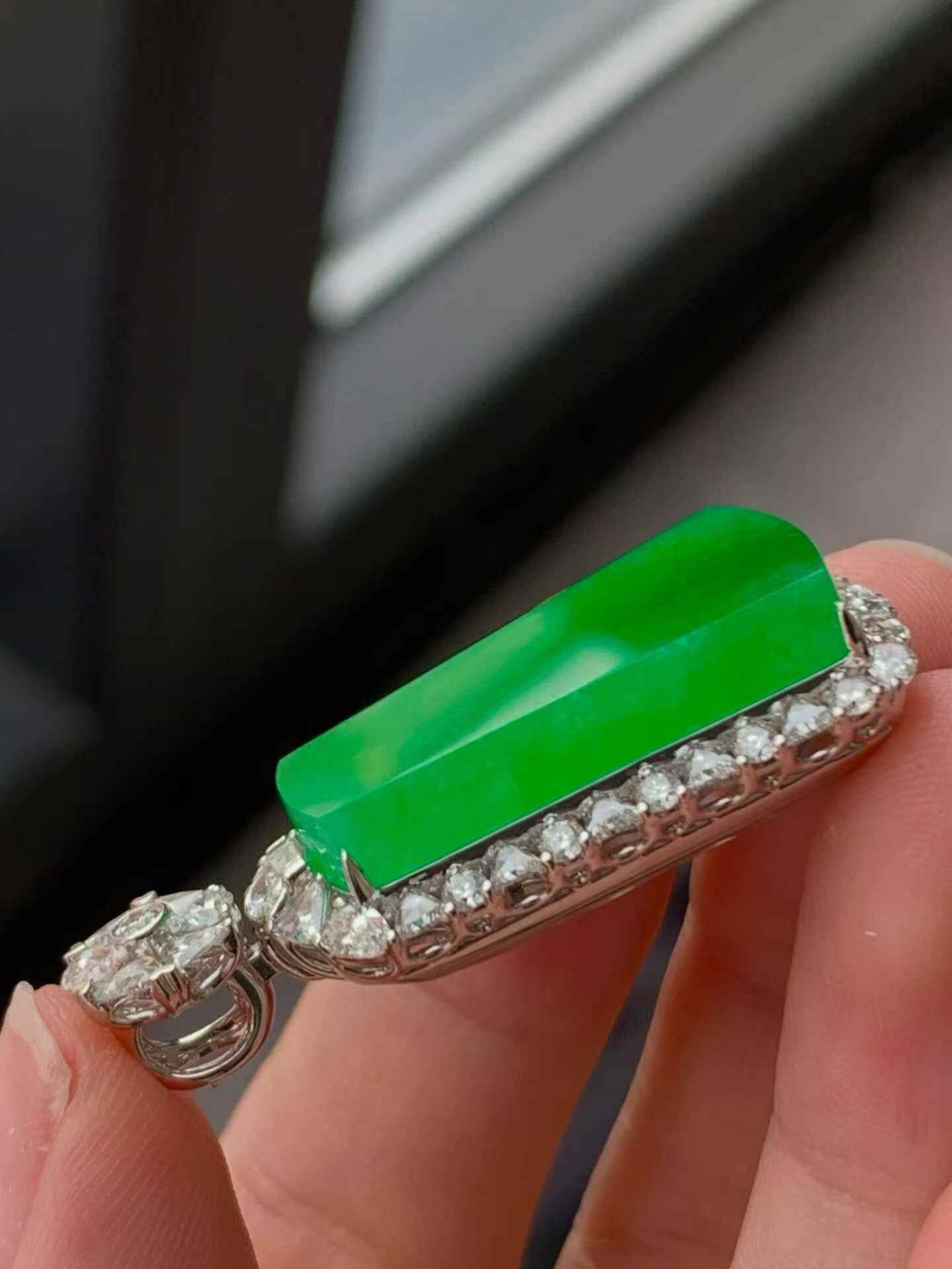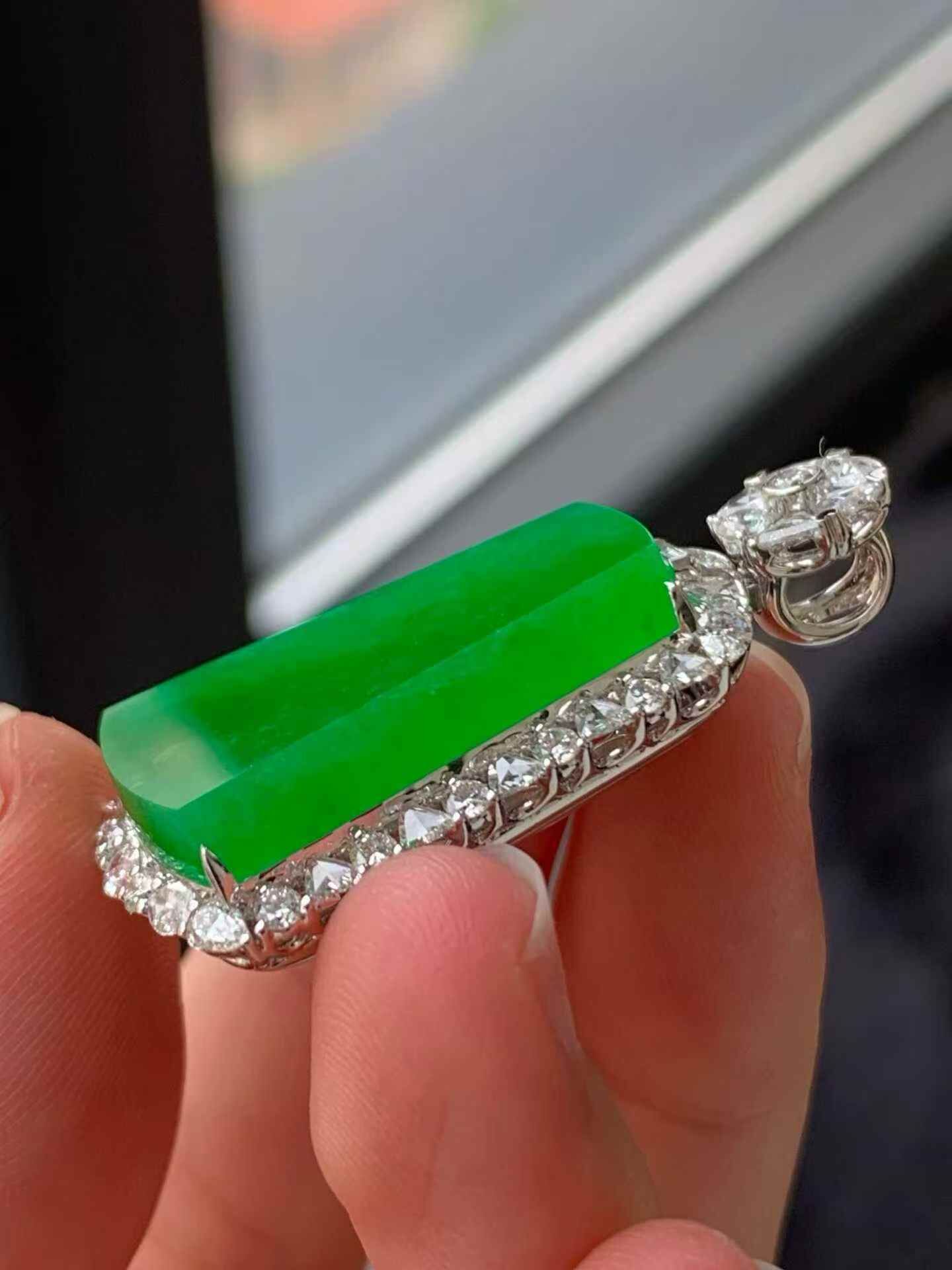 天然翡翠A玉,種老細膩,色陽濃郁起膠,18K金鑲嵌。