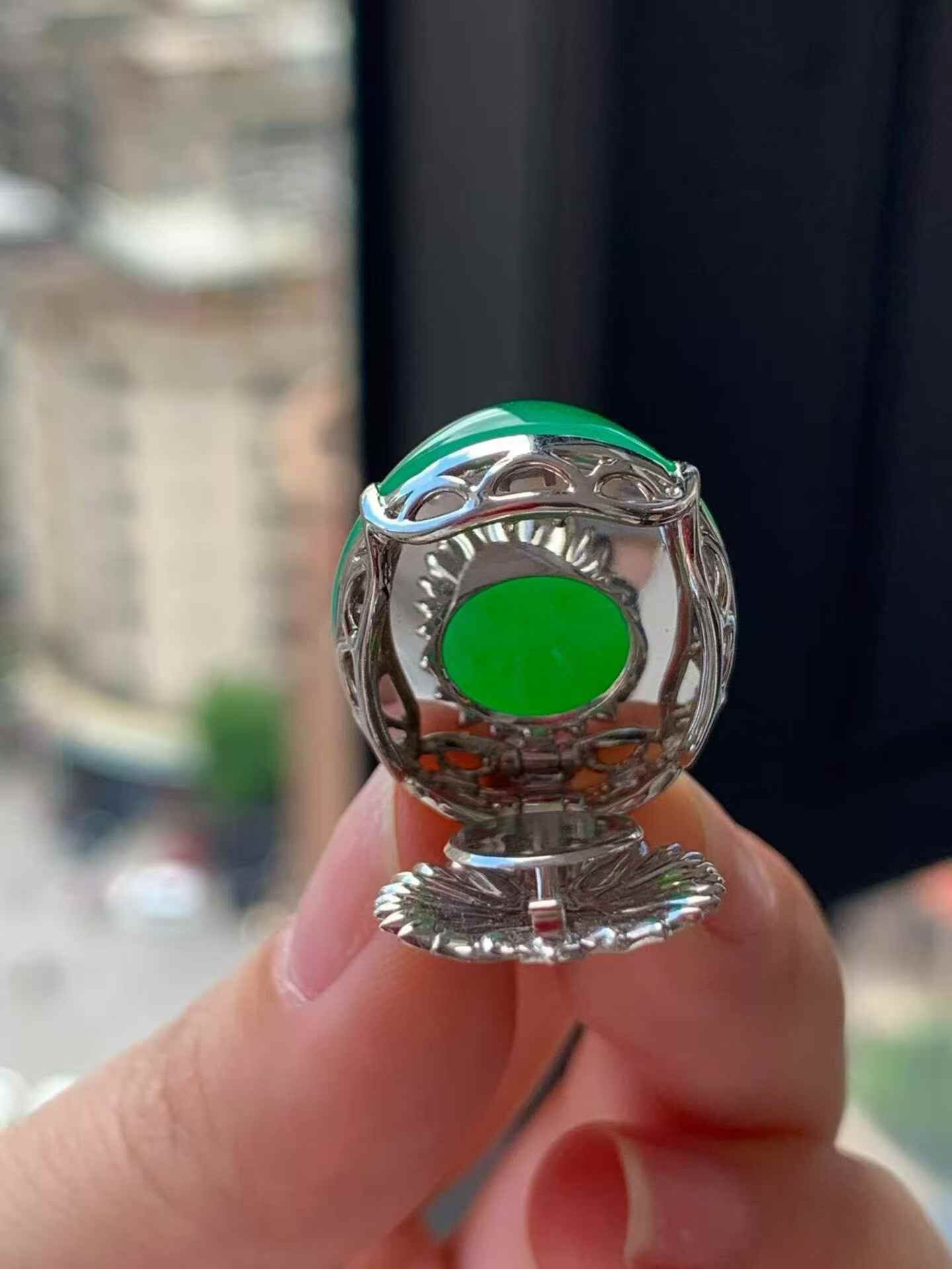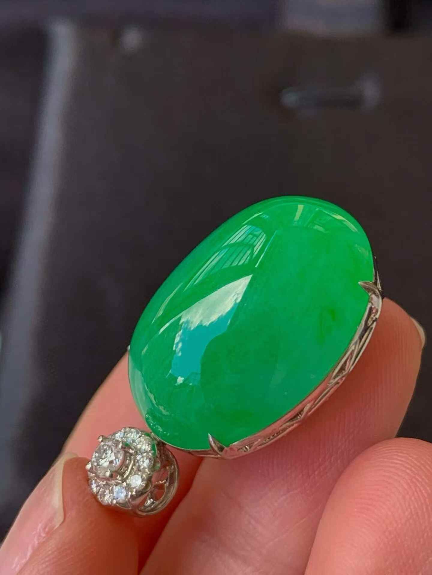 天然翡翠A玉,種老細膩,色陽濃郁起膠,18K金鑲嵌。