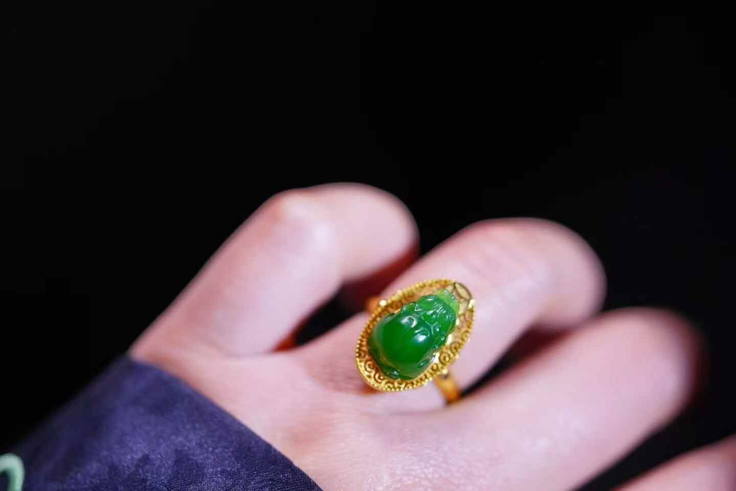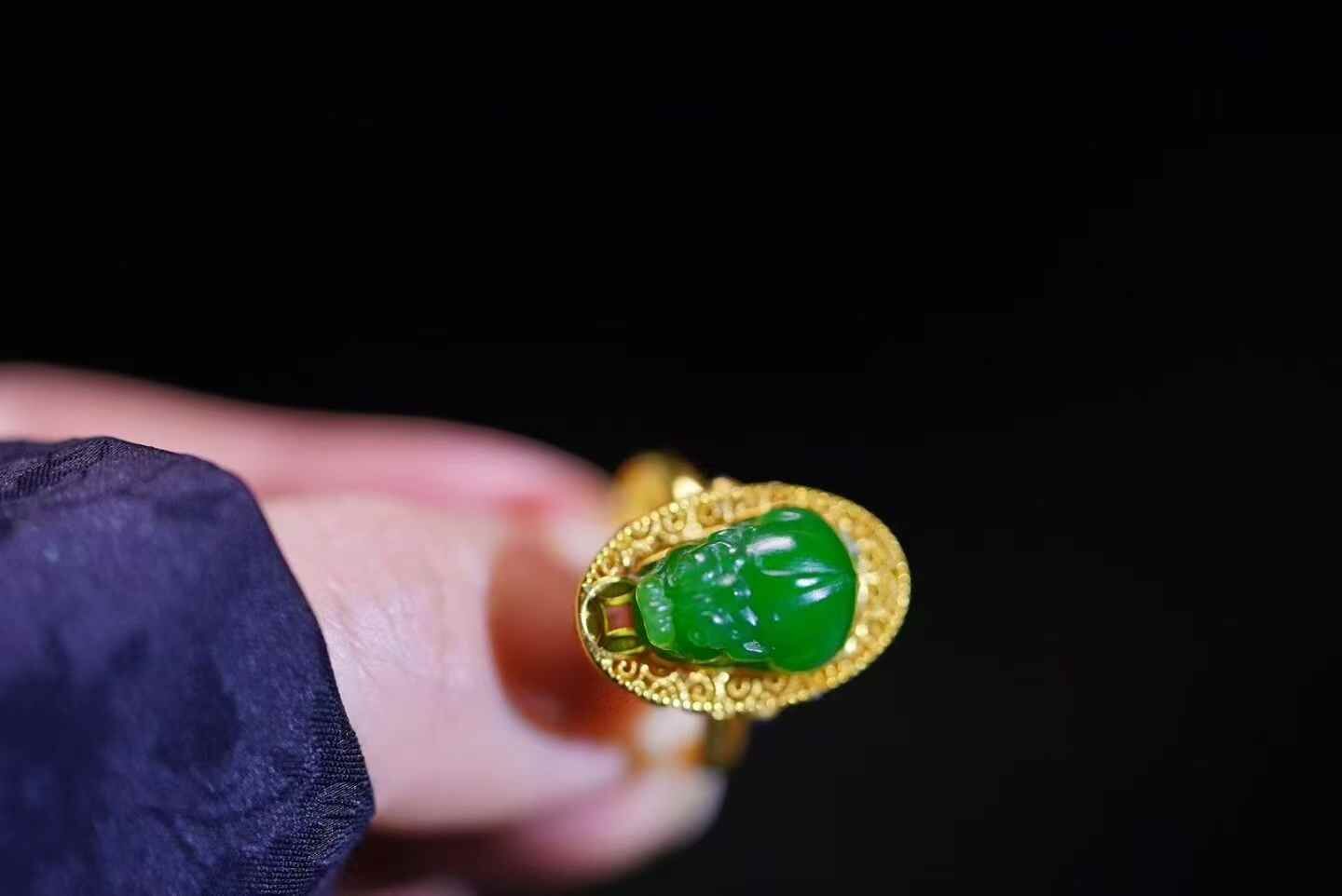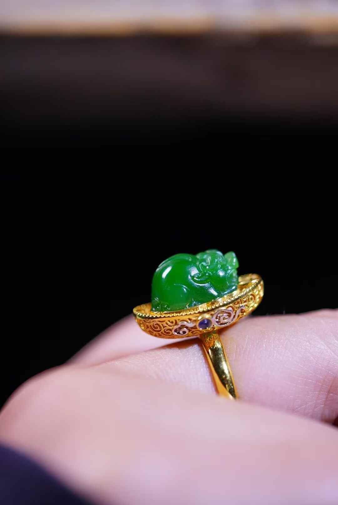 天然翡翠A玉,招財進寶,陽綠貔貅戒指。18K金花絲鑲嵌,寶石點綴,元寶銅錢祥雲元素、招財財。貔貅元素的珠寶一向都比較討喜,這枚誰來接回家吧。