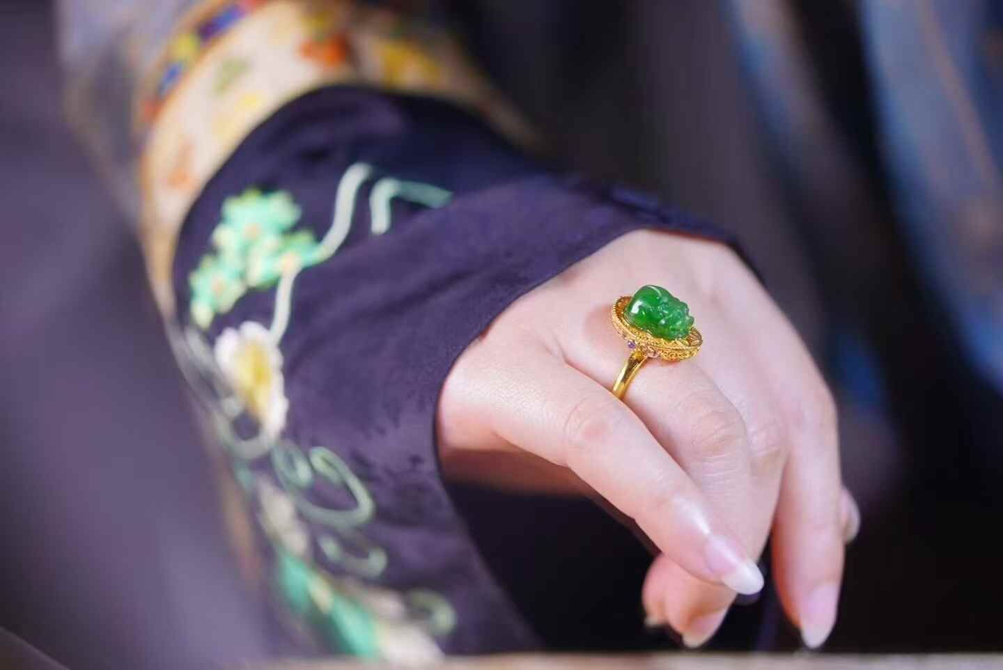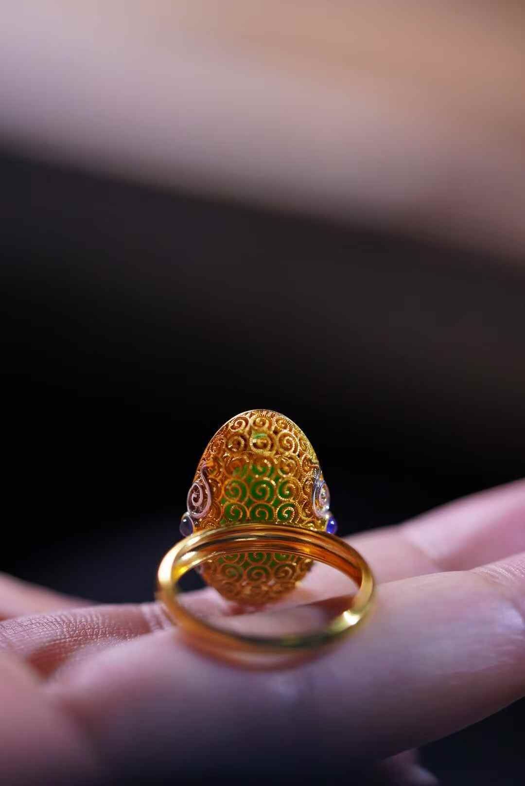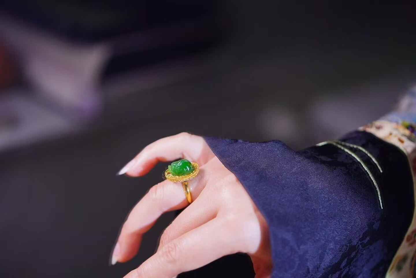 天然翡翠A玉,招財進寶,陽綠貔貅戒指。18K金花絲鑲嵌,寶石點綴,元寶銅錢祥雲元素、招財財。貔貅元素的珠寶一向都比較討喜,這枚誰來接回家吧。