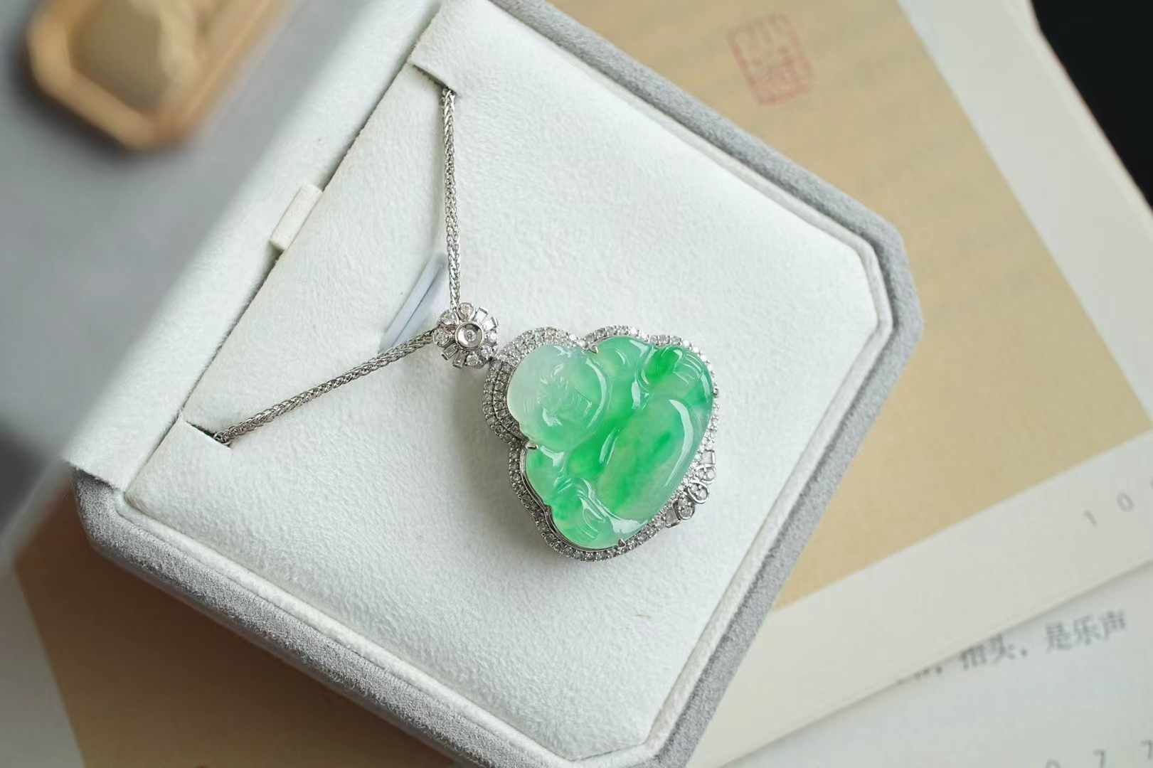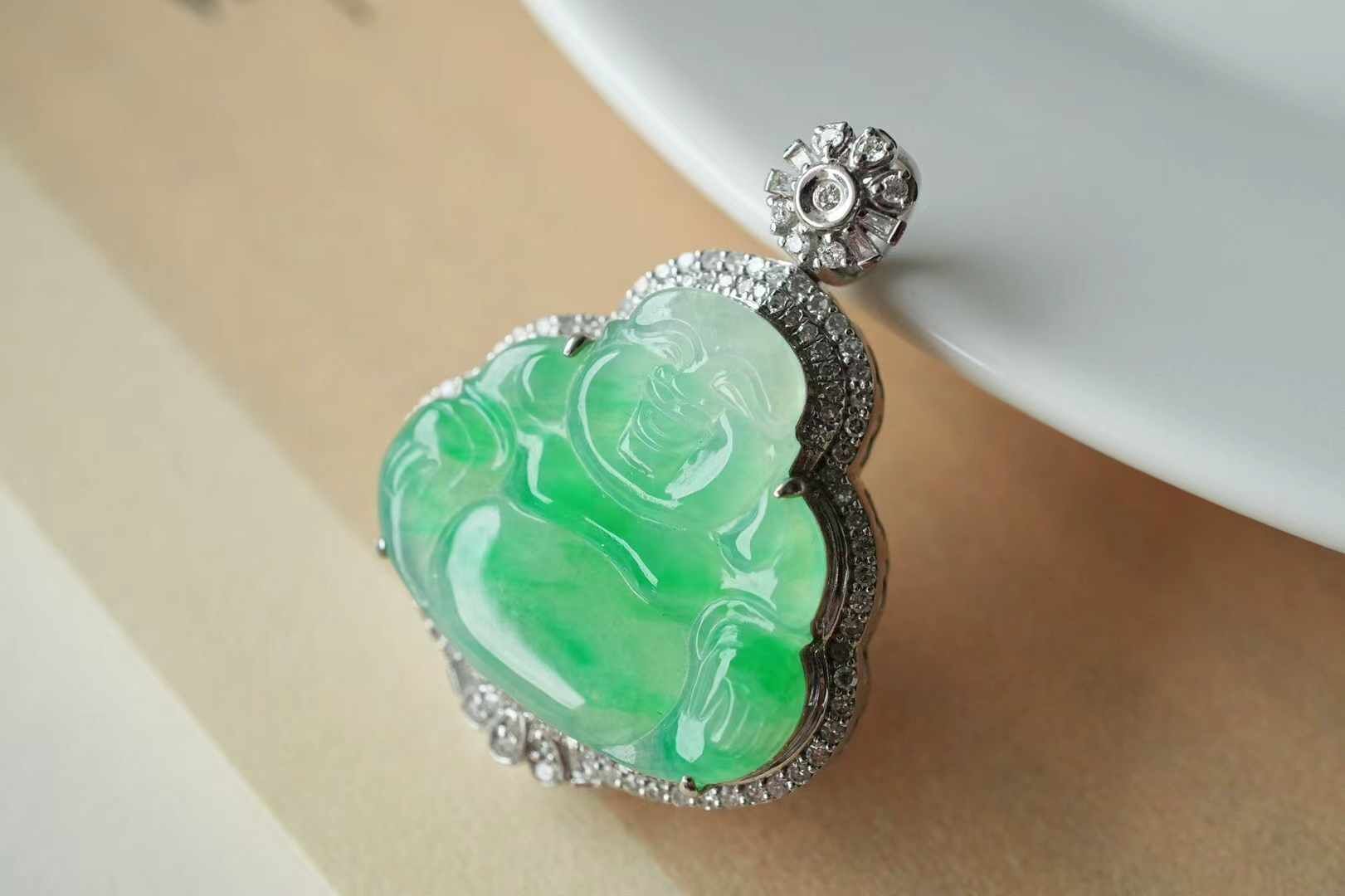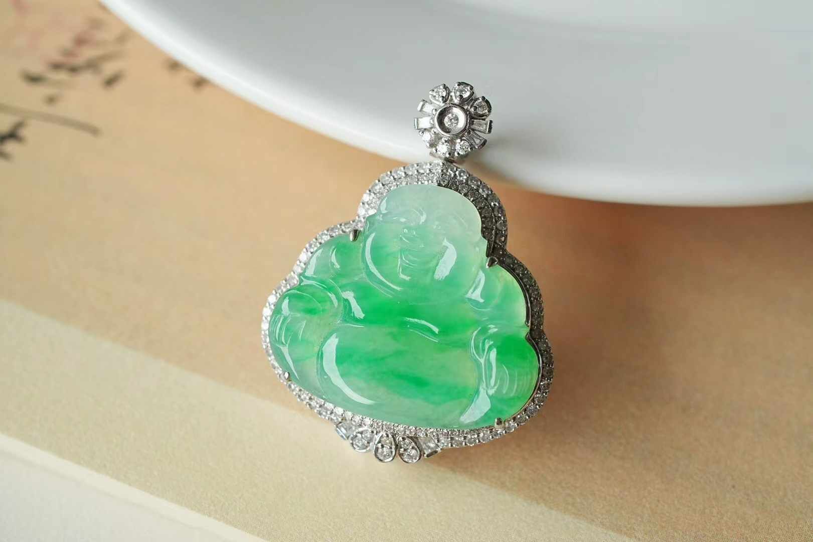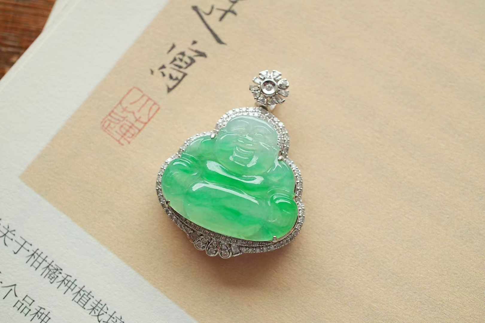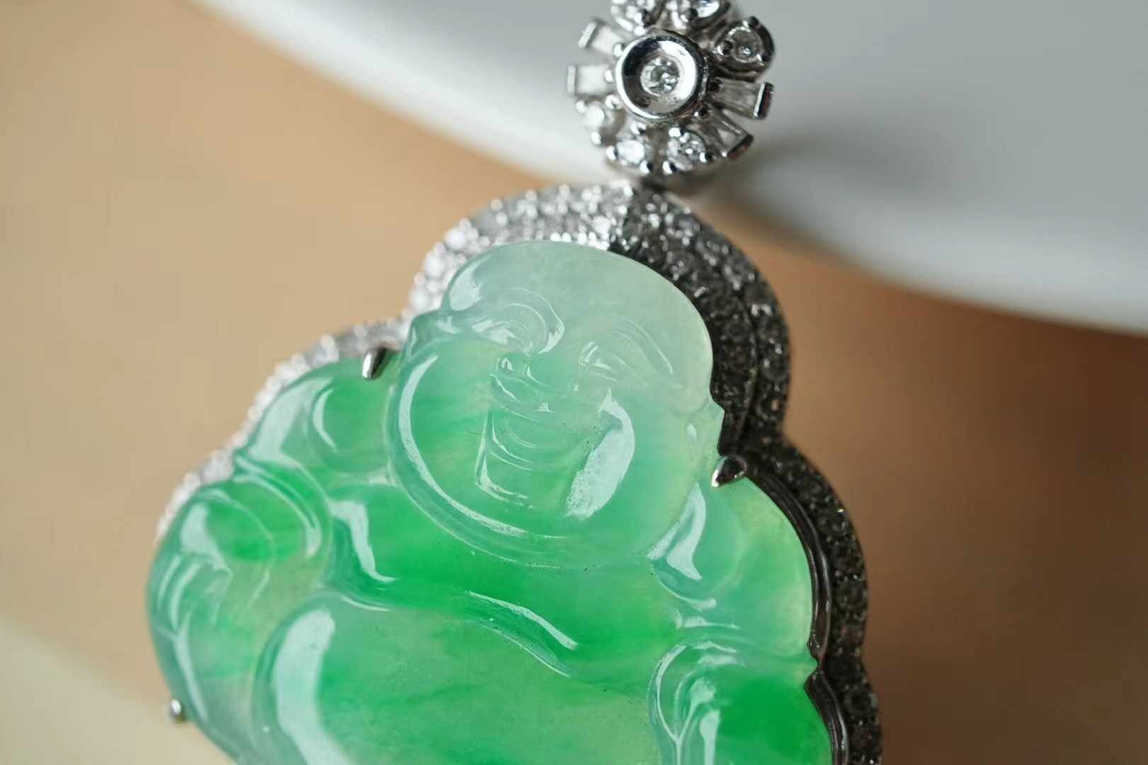 “以佛納福” 天然翡翠A玉,緬料老坑種,冰飄鮮陽綠,質地溫潤細膩,水頭充盈,飄色陽綠鮮艷靈動,種色一絕。佛公雕工精湛,開臉喜慶,眉眼含笑,體態飽滿圓潤。