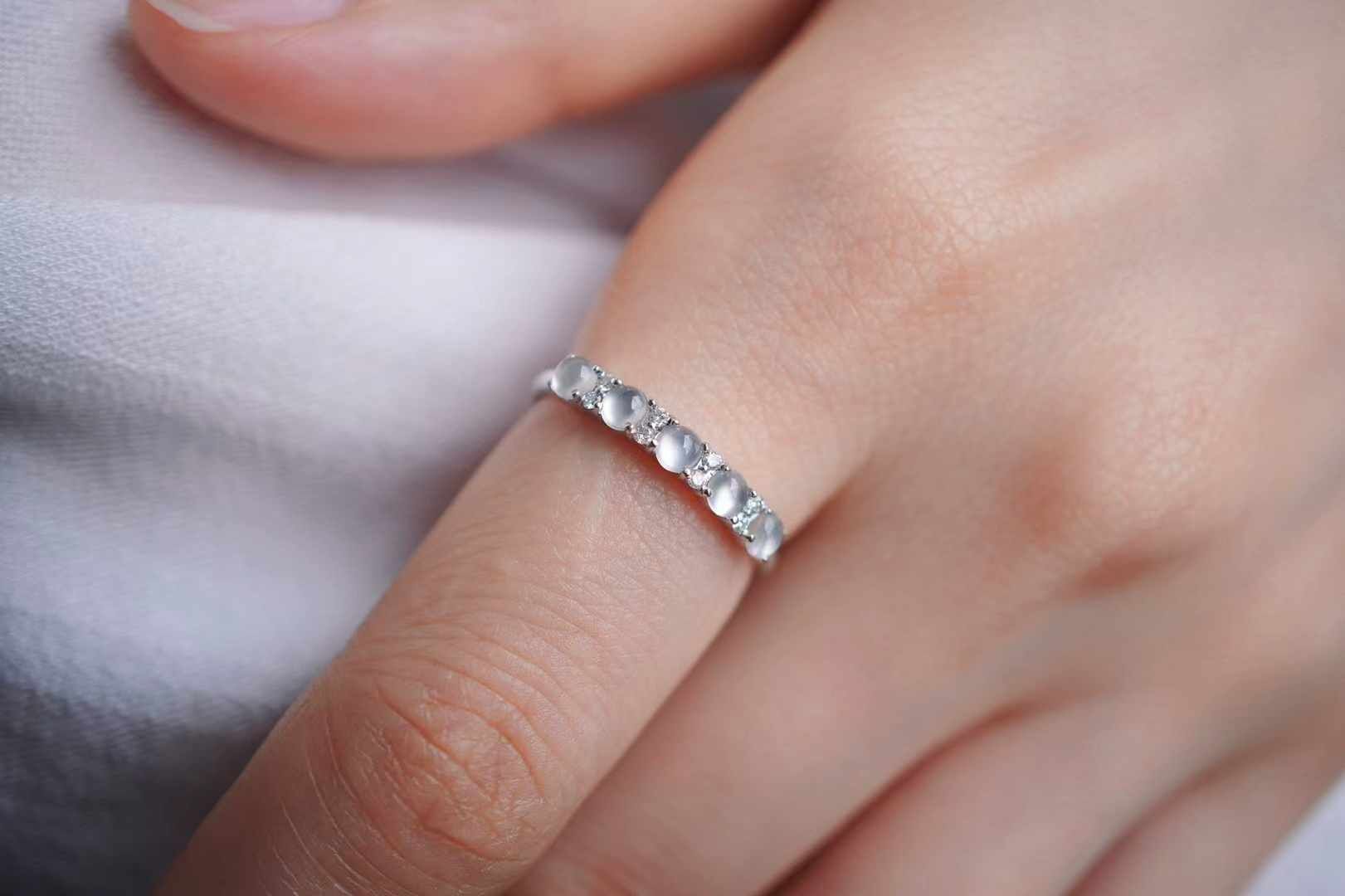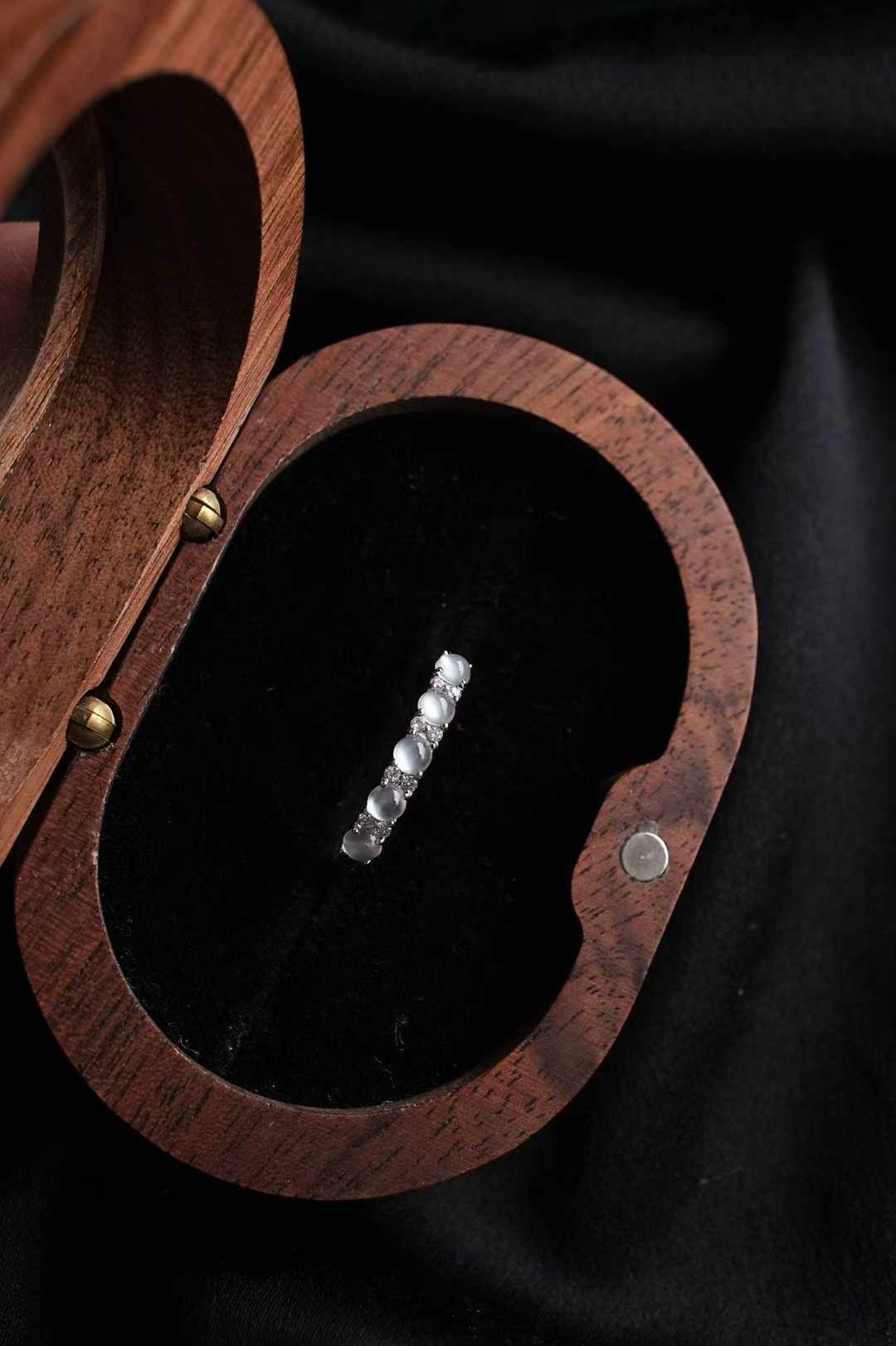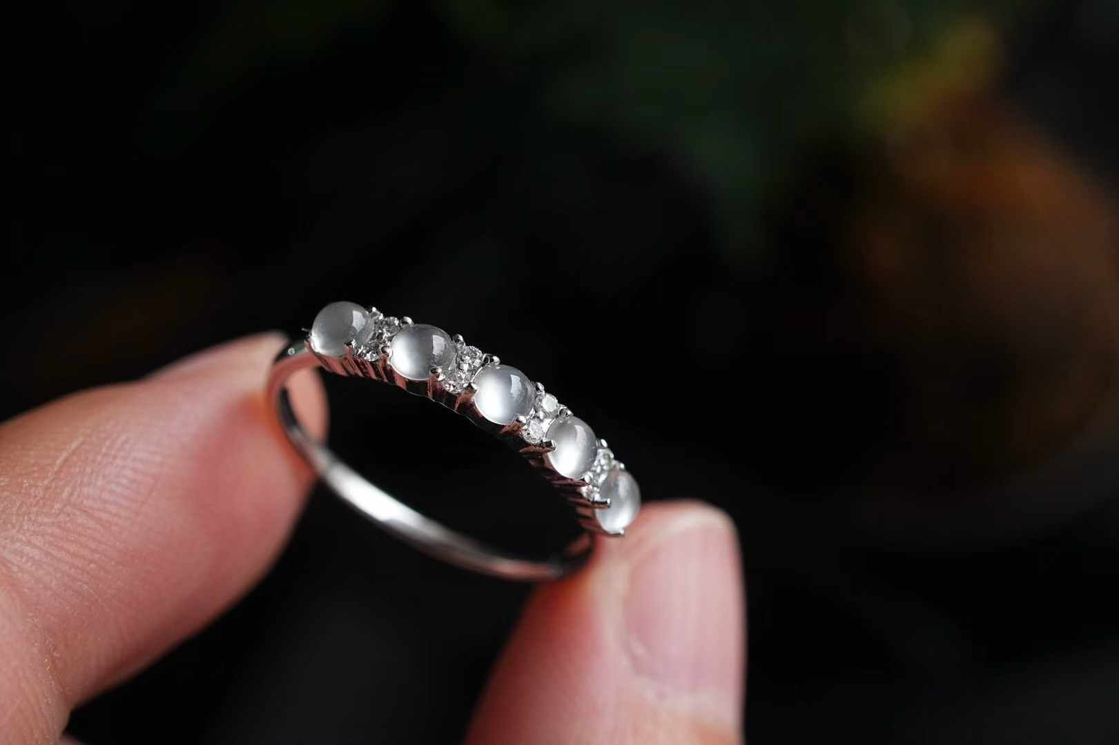 天然翡翠A玉,緬料,老坑種,五顆玻璃種翡翠小蛋面串聯成排,冰透瑩潤,又亮又鼓,光感好強。一定要擁有的一枚!360度無死角的美,上手很仙氣。18K金鑽石鑲嵌,上手貴氣精致。