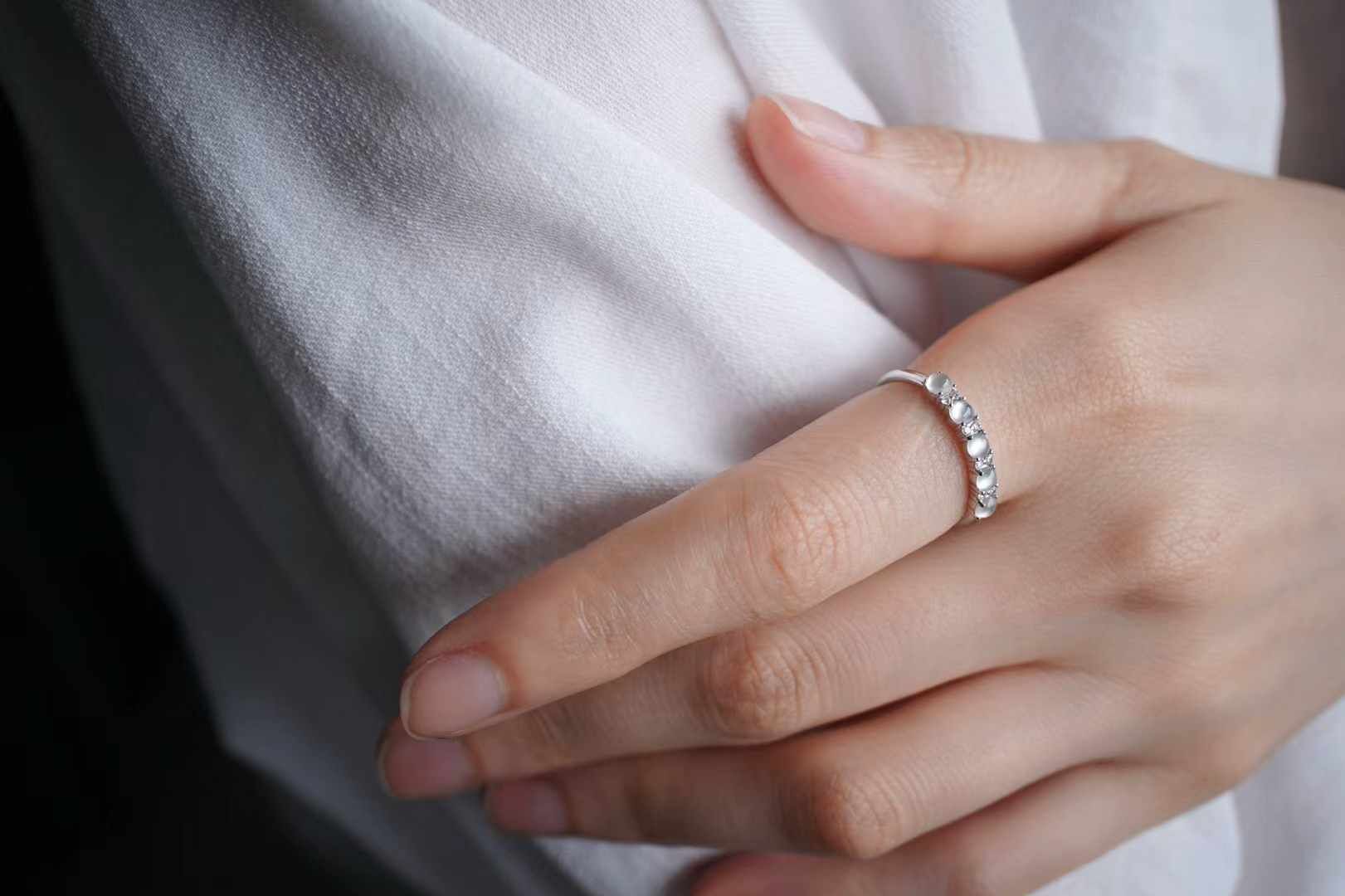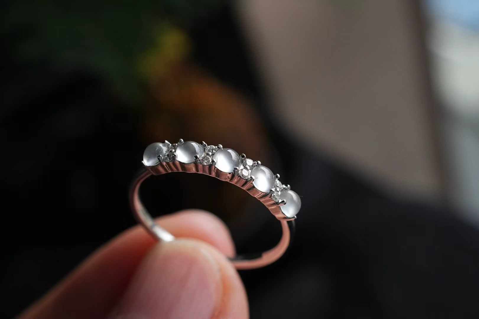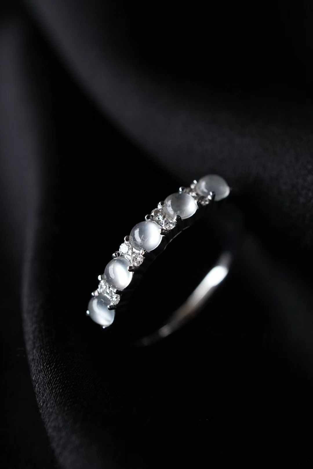 天然翡翠A玉,緬料,老坑種,五顆玻璃種翡翠小蛋面串聯成排,冰透瑩潤,又亮又鼓,光感好強。一定要擁有的一枚!360度無死角的美,上手很仙氣。18K金鑽石鑲嵌,上手貴氣精致。