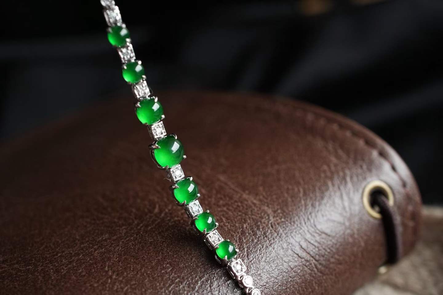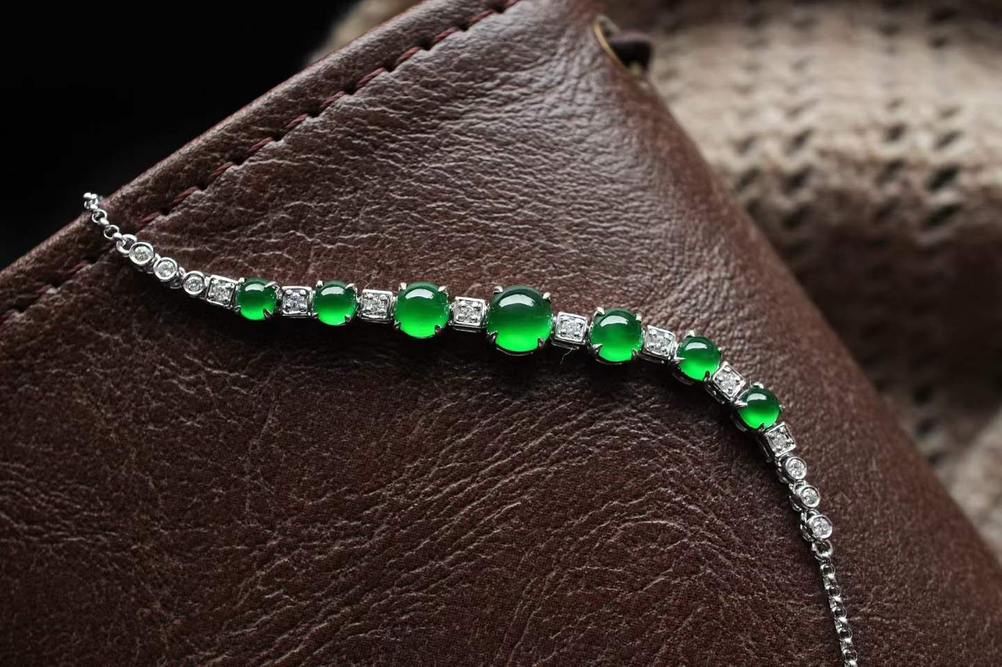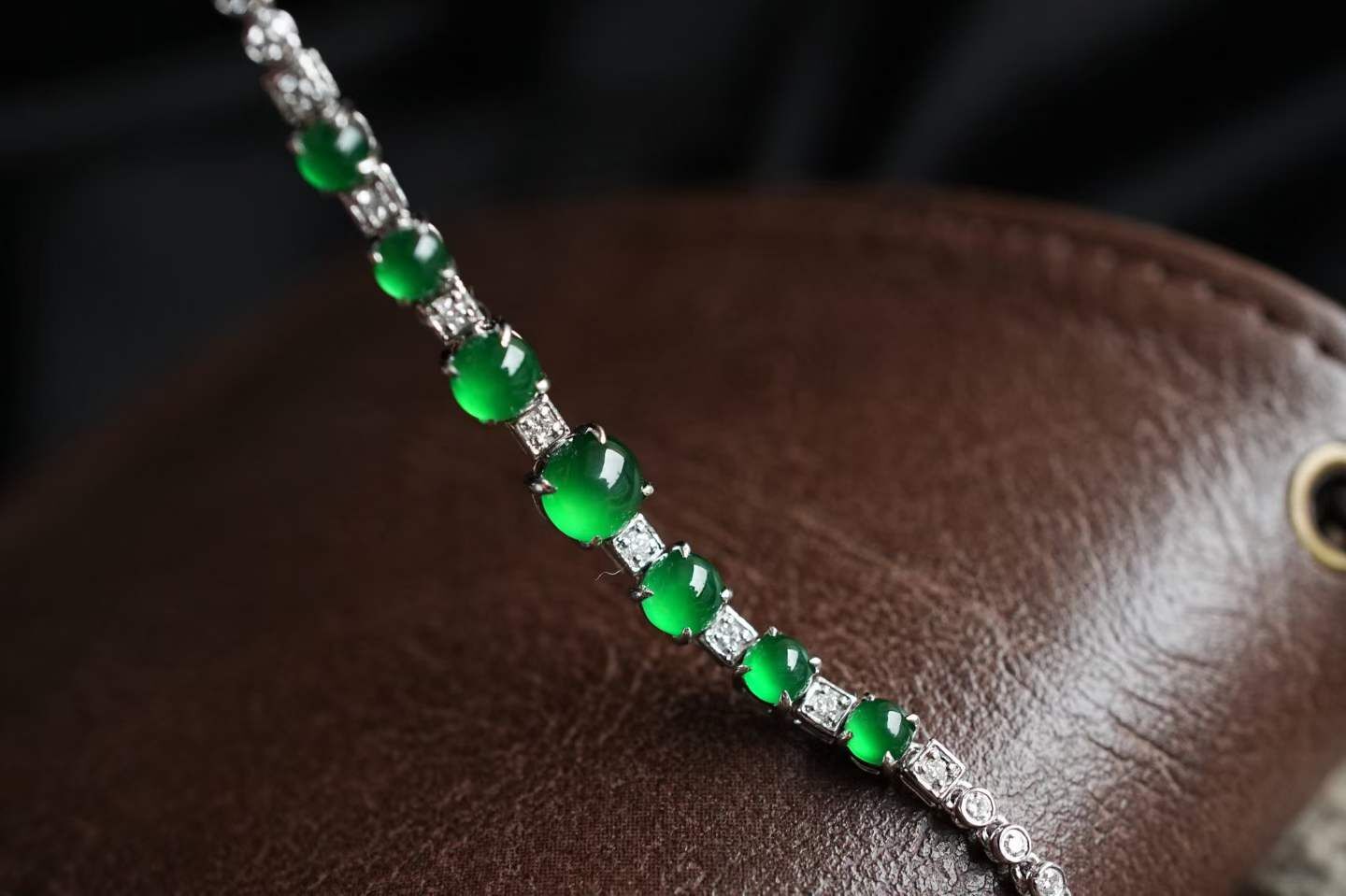 天然翡翠A玉,這才是奢華珠寶感啊!七顆蛋面色澤濃郁,高冰種,濃陽綠,整體冰透起光,流光溢彩的感覺,太美好了!種色兼備的精品!超級難得的品相。