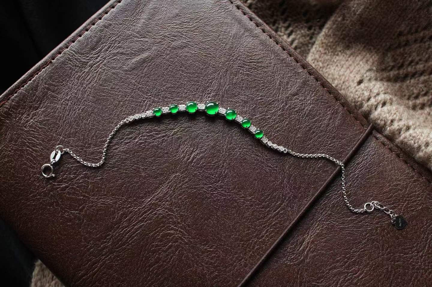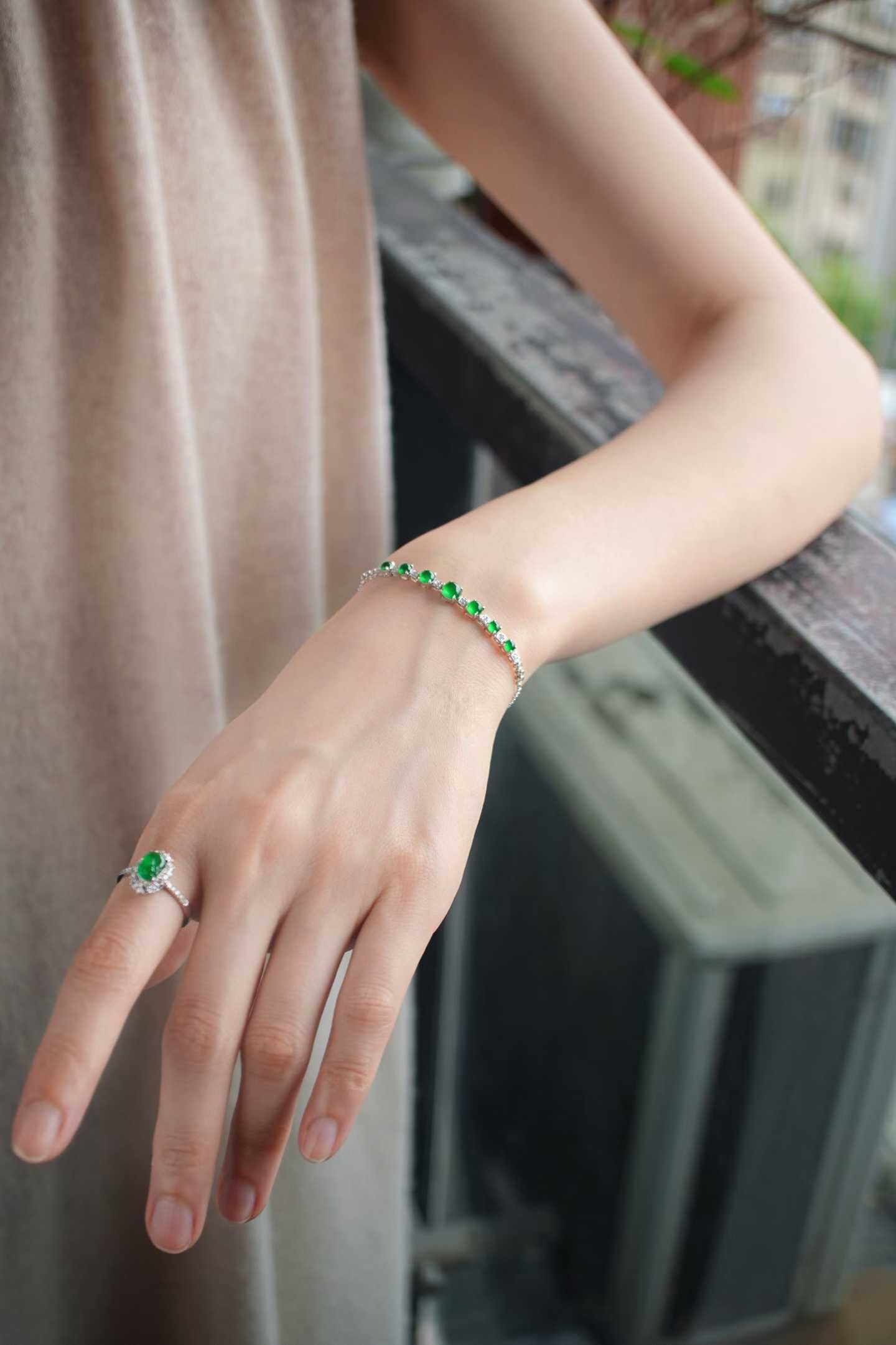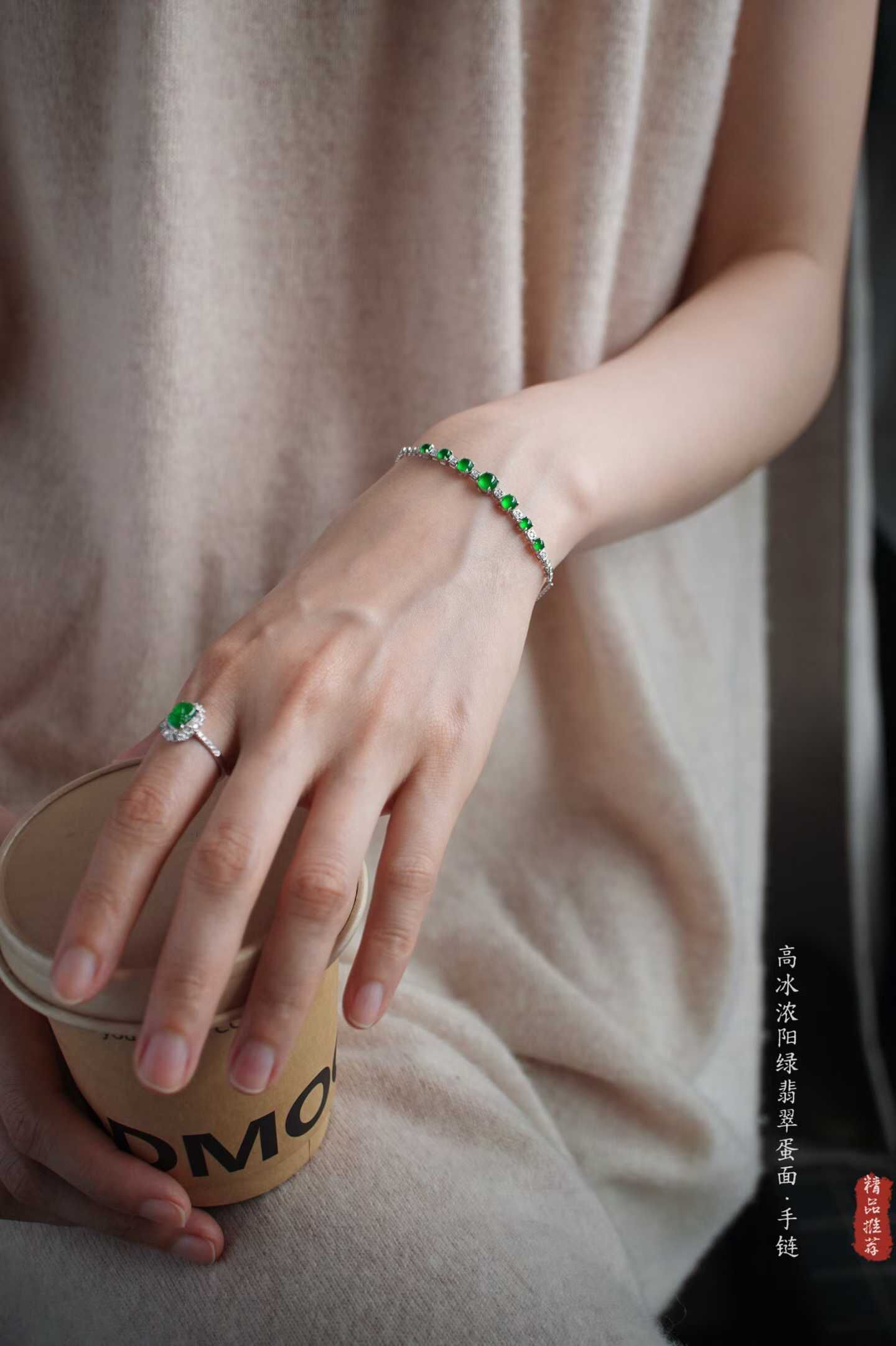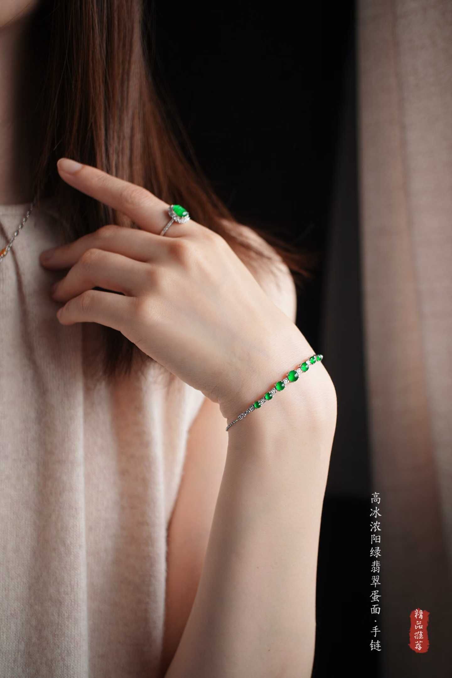 • 翡翠高冰濃陽綠蛋面手鏈,天然翡翠A玉, 緬甸玉, Jade, Jadeite