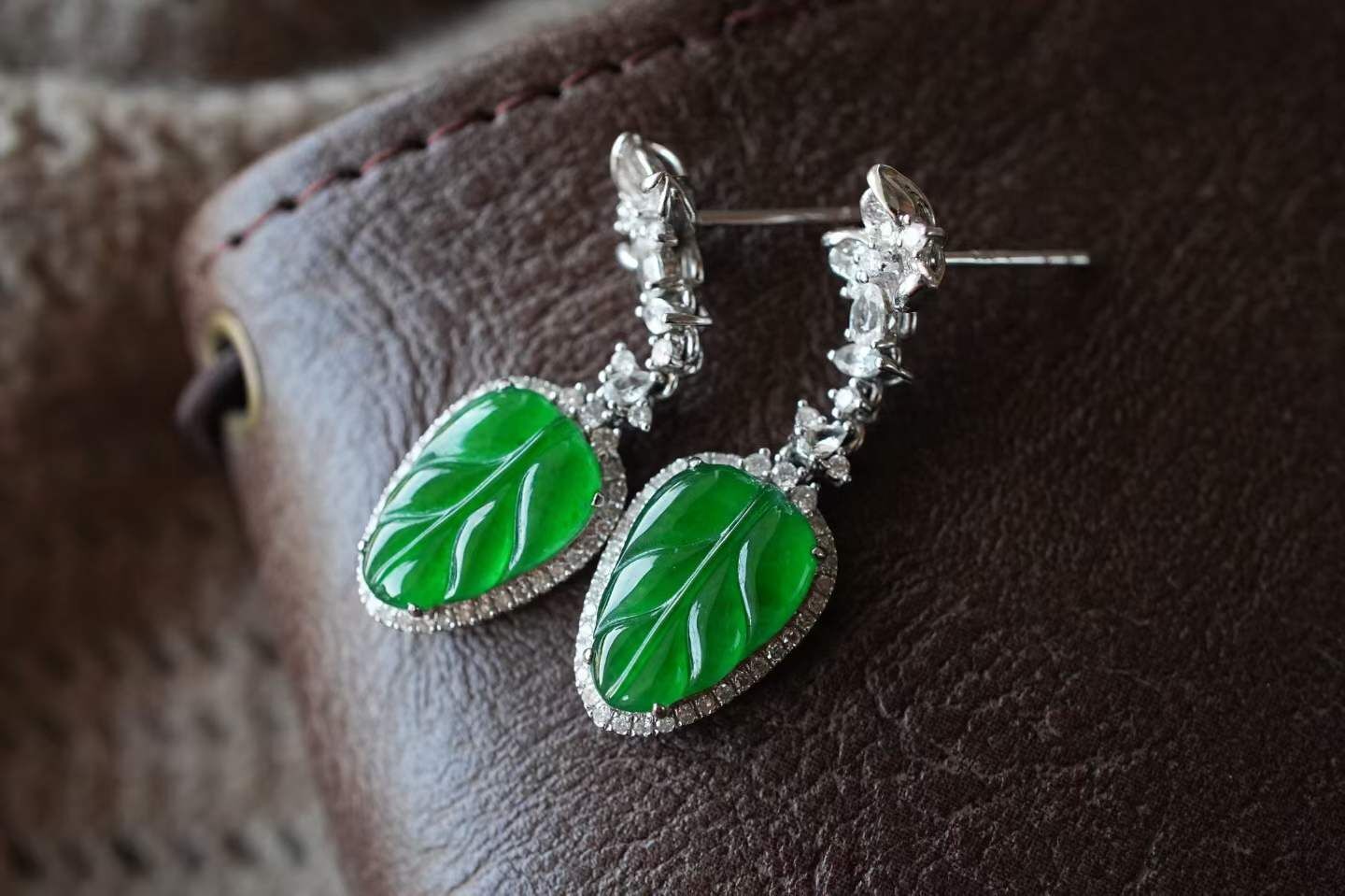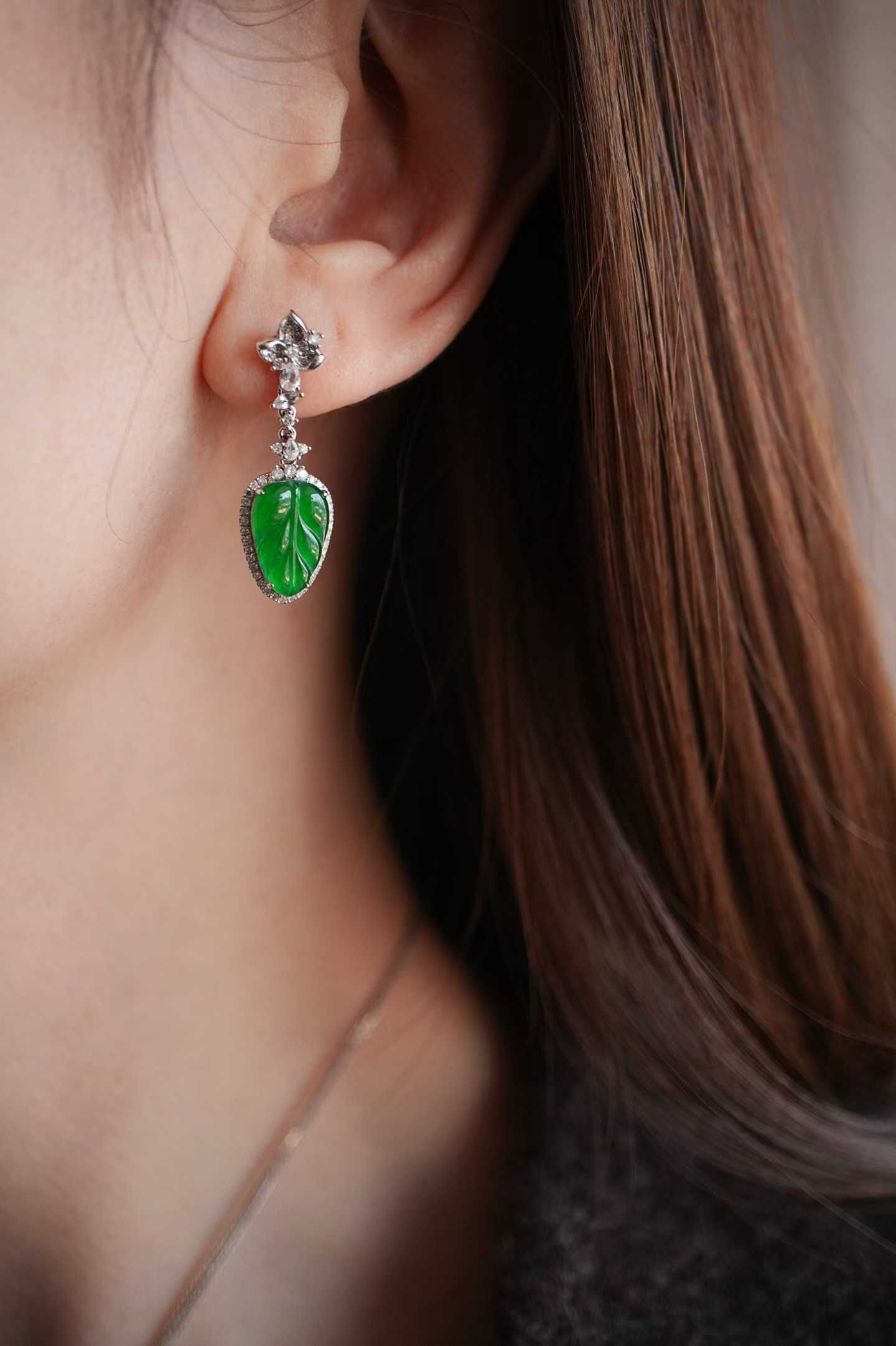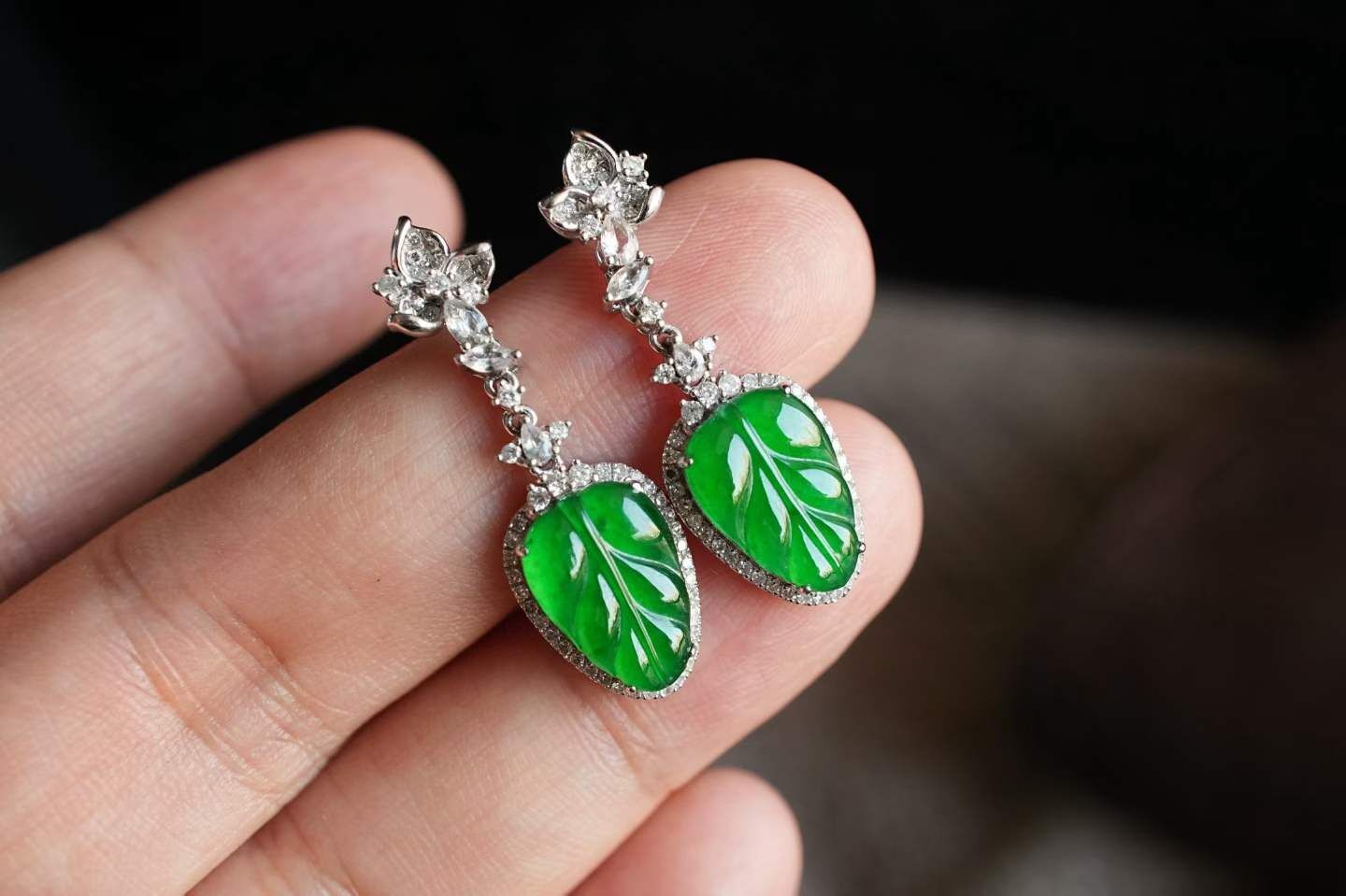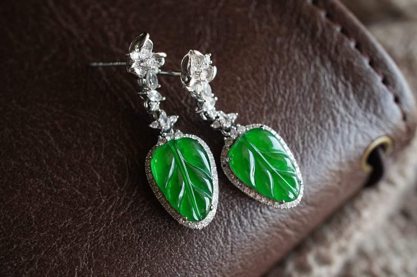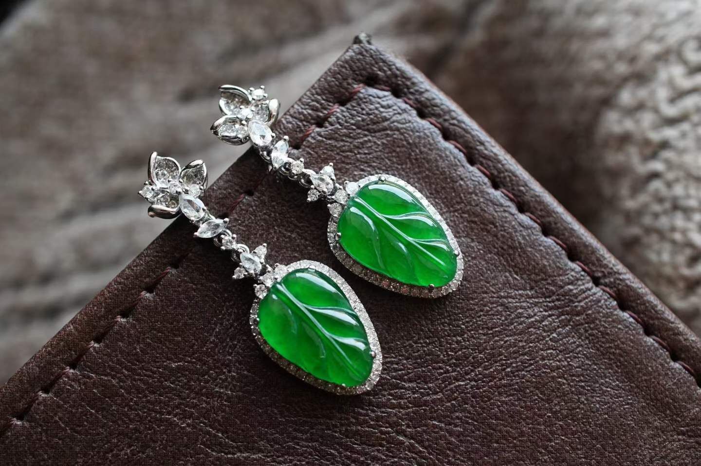 • 翡翠高冰辣陽綠葉子耳墜,天然翡翠A玉, 緬甸玉, Jade, Jadeite