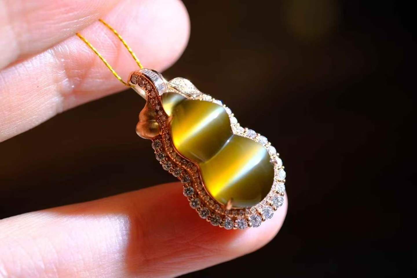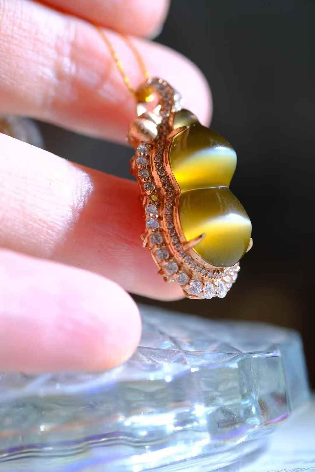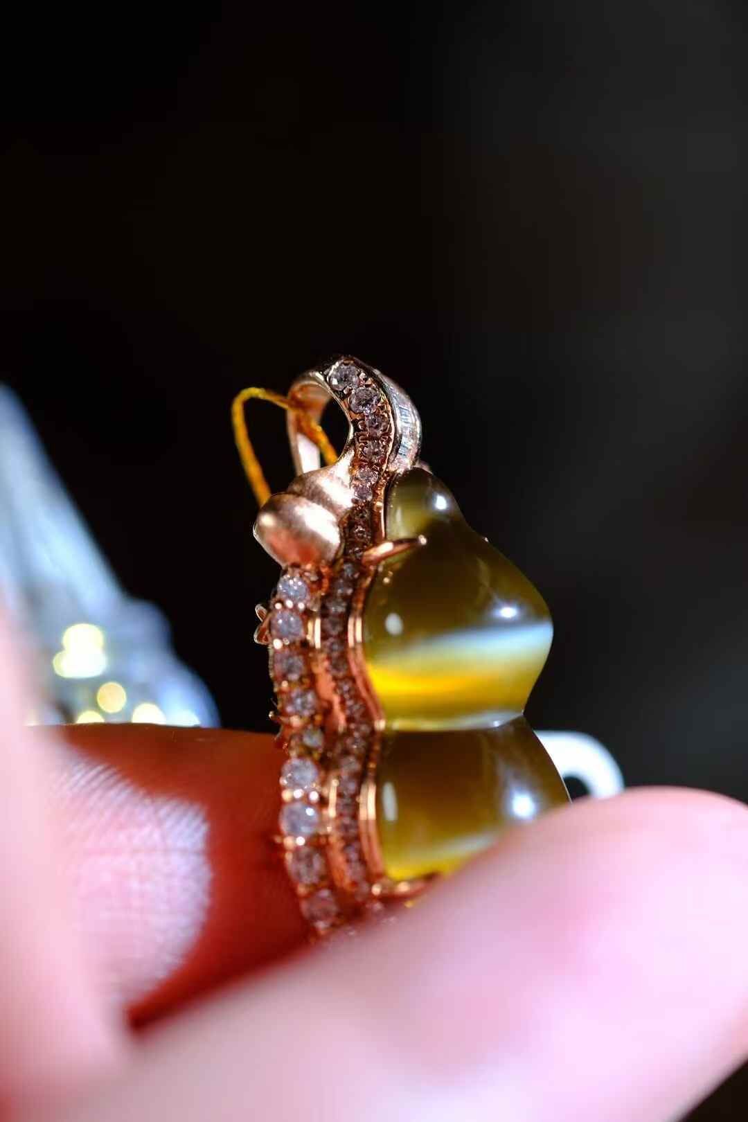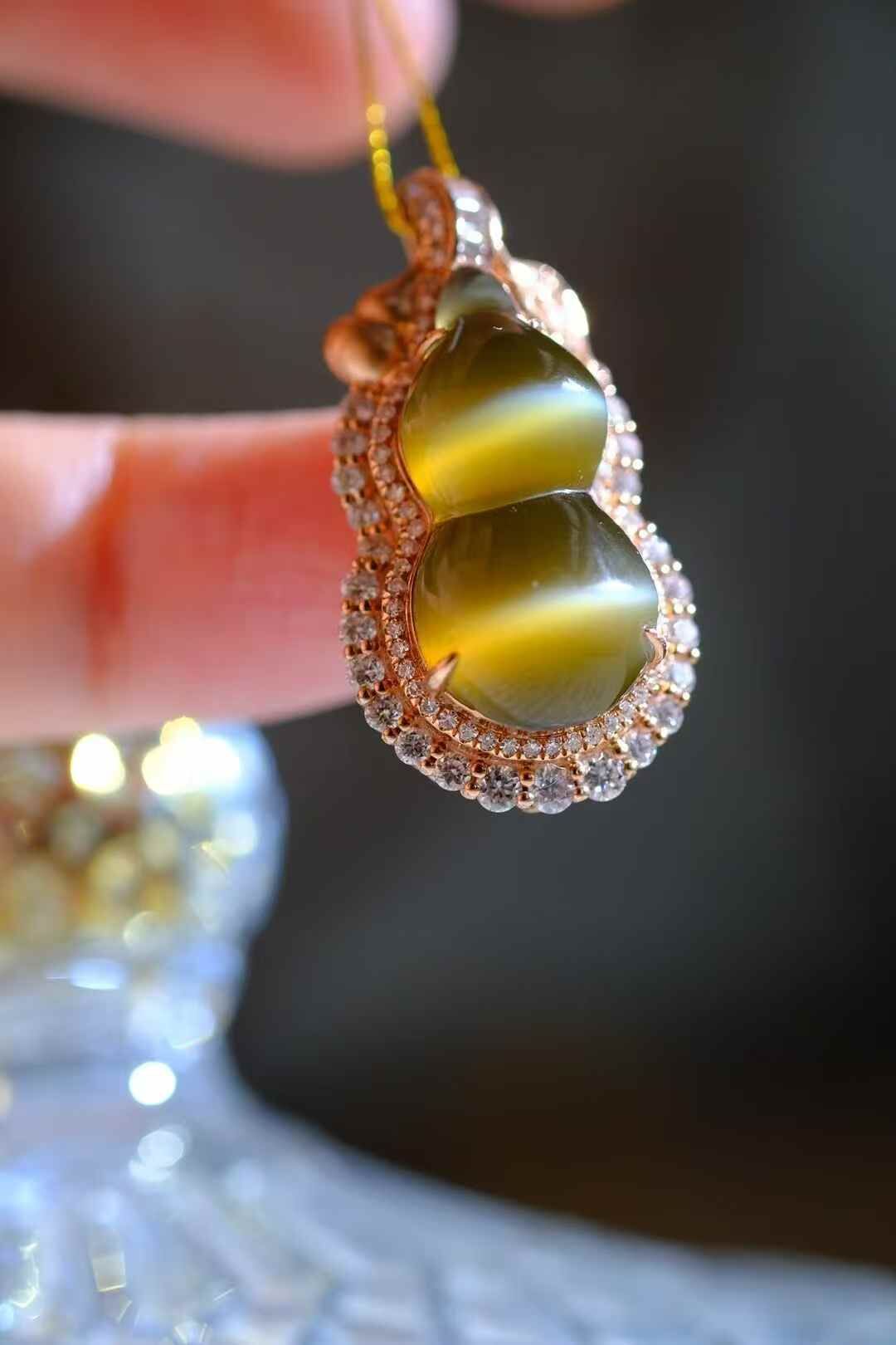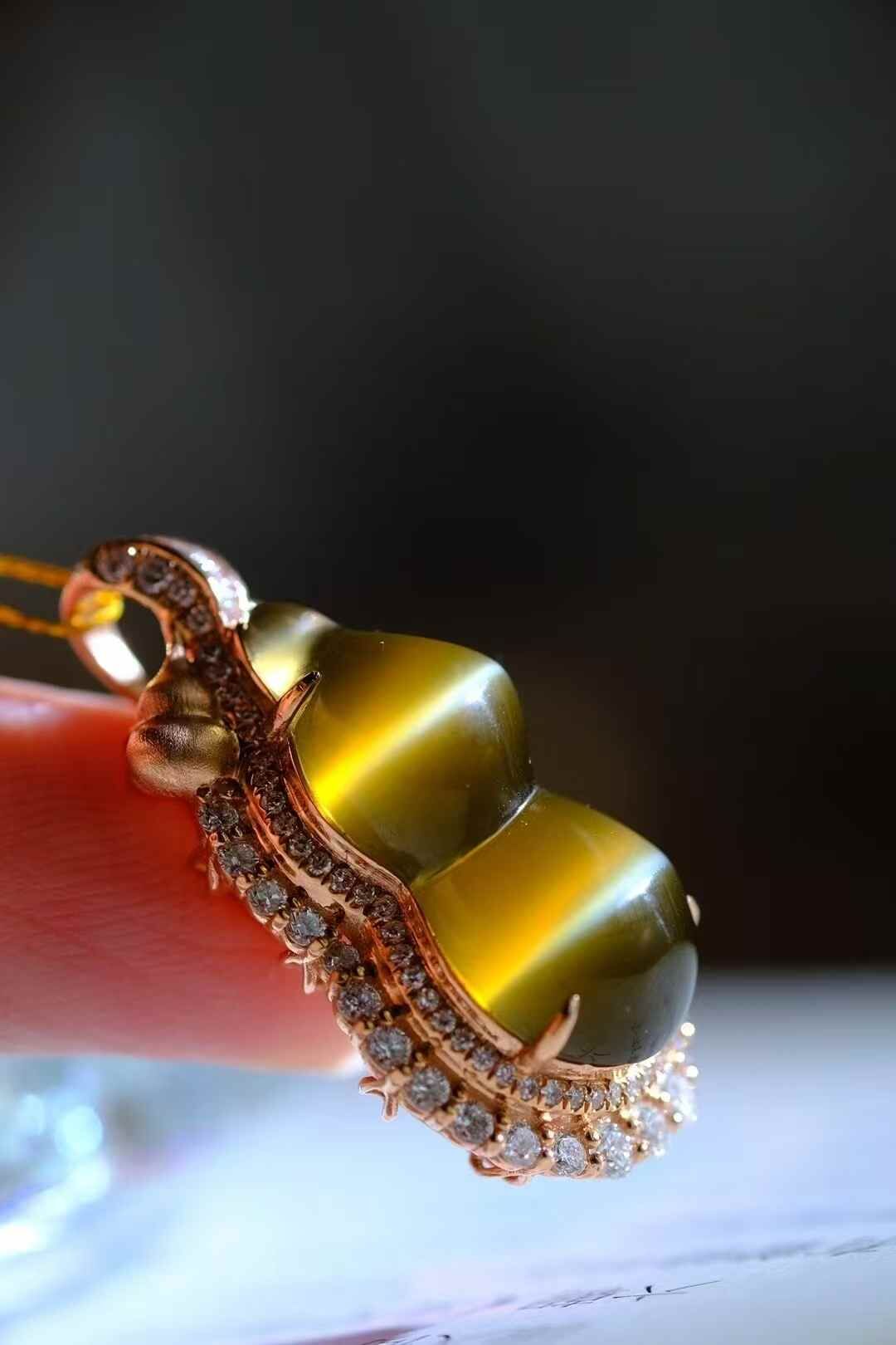 天然和田玉,極品碧玉金貓葫蘆吊墜,肉質細膩,貓眼活靈活現,18K金鑽石鑲嵌,葫蘆飽滿圓潤,寓意福祿康瑞,財源滾滾,珍藏美物。