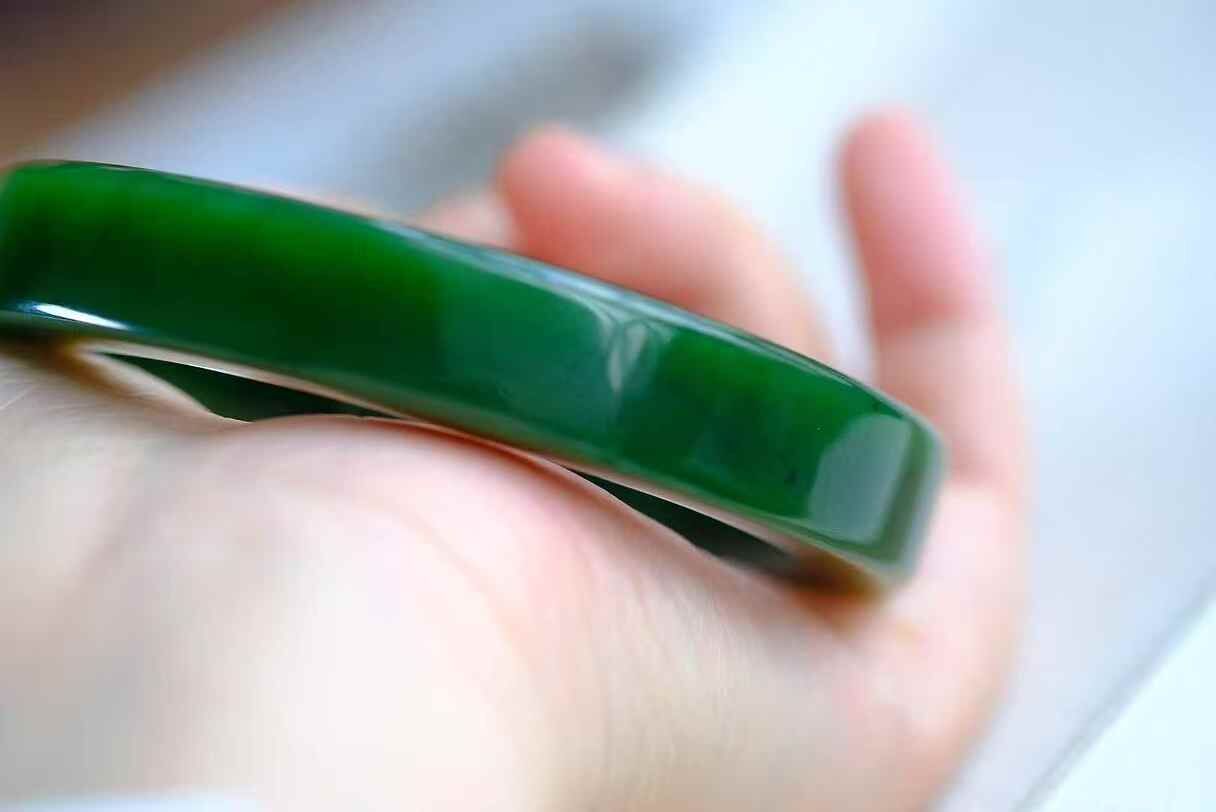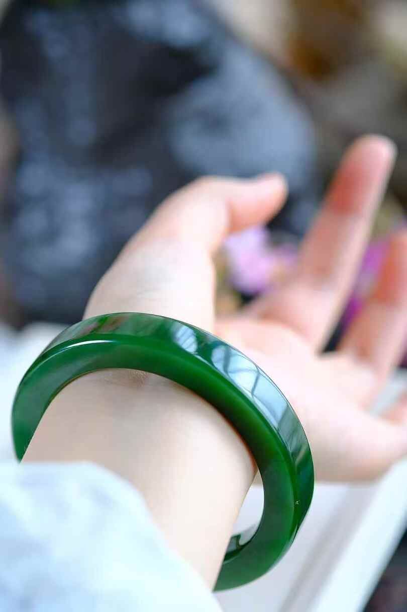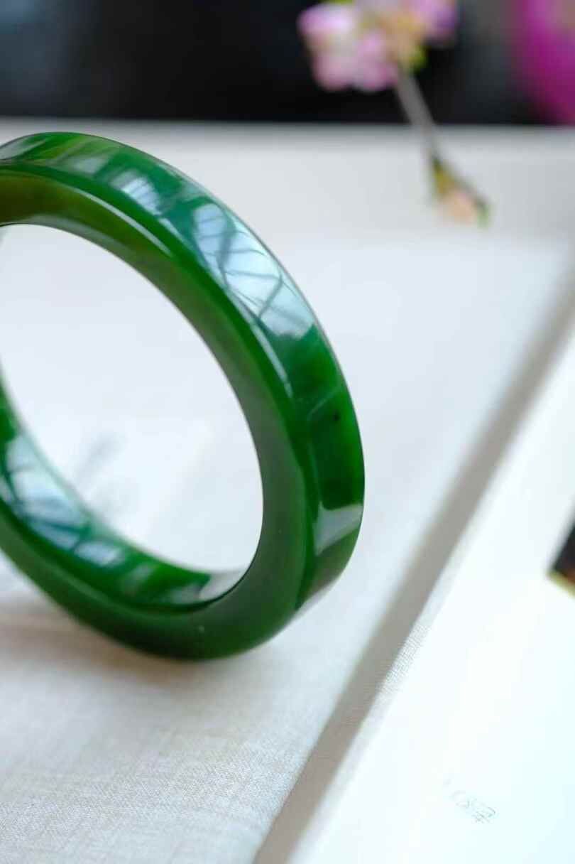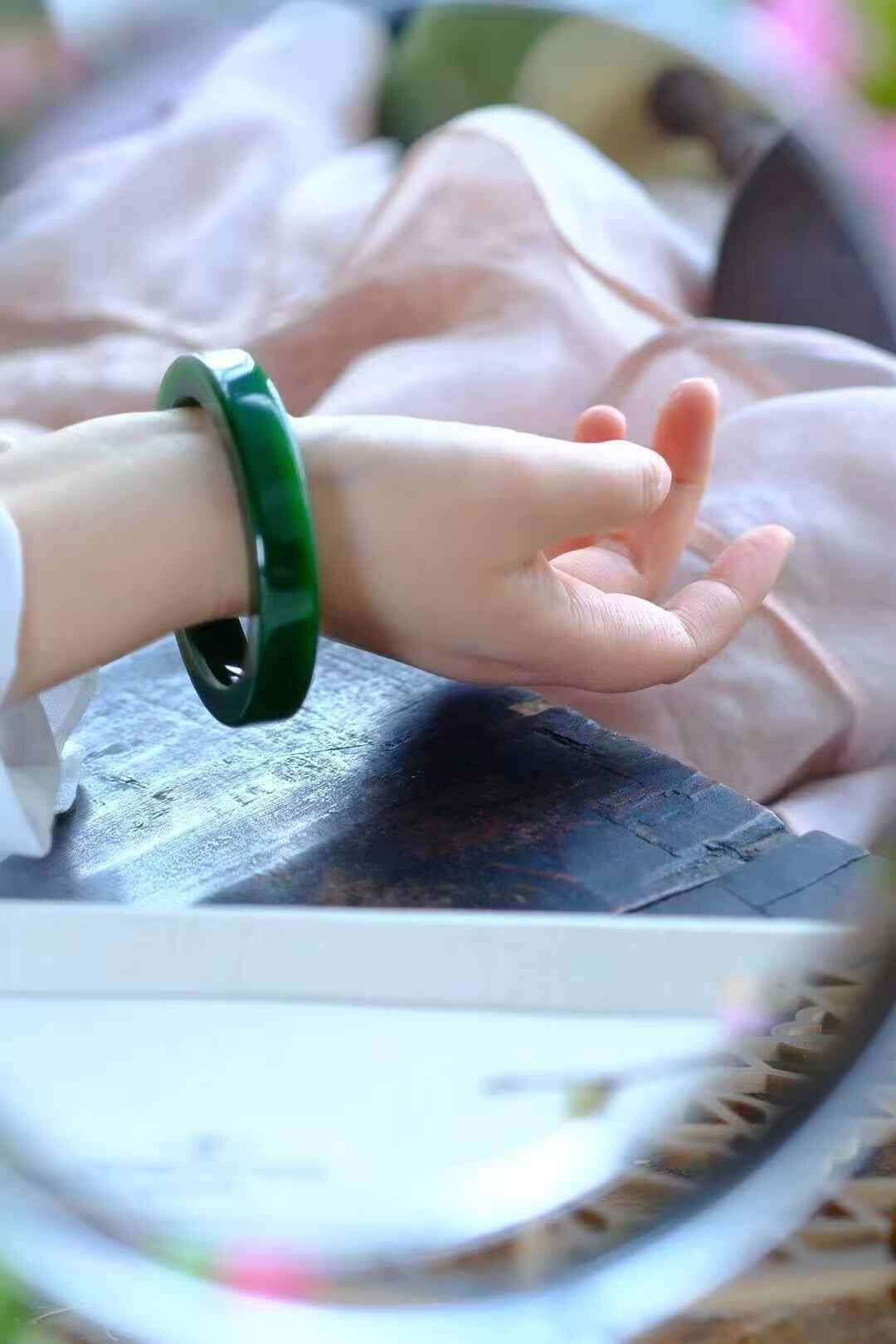玉質細膩得像凝脂,綠色是那種高級的沉潤碧綠,上手溫溫的。戴在腕間瞬間有了東方韻味,歲月靜好的感覺這不就來了嘛!