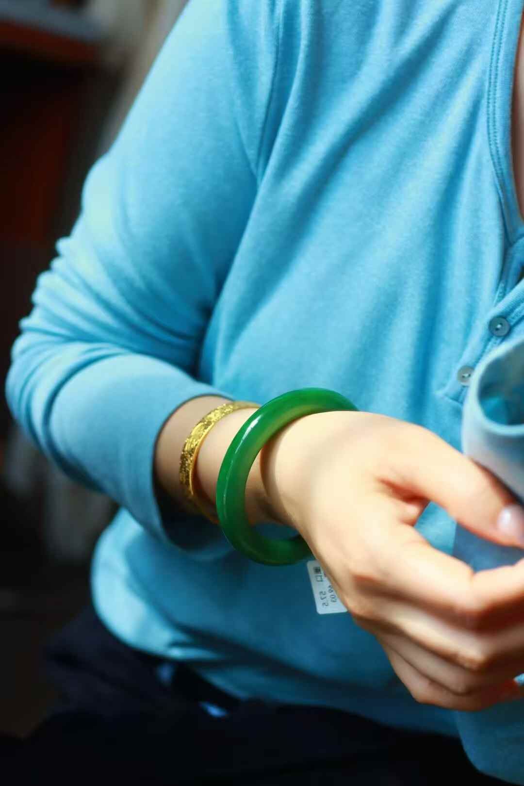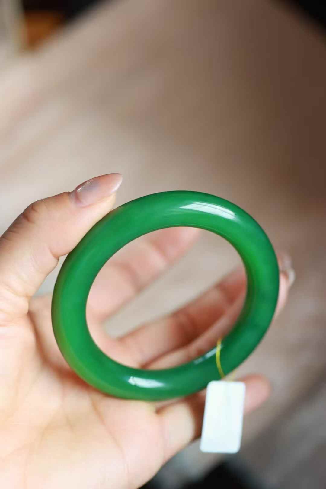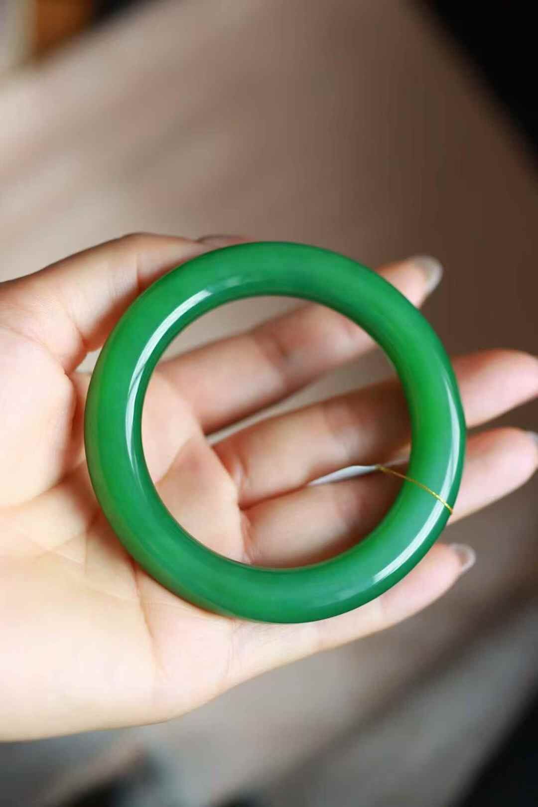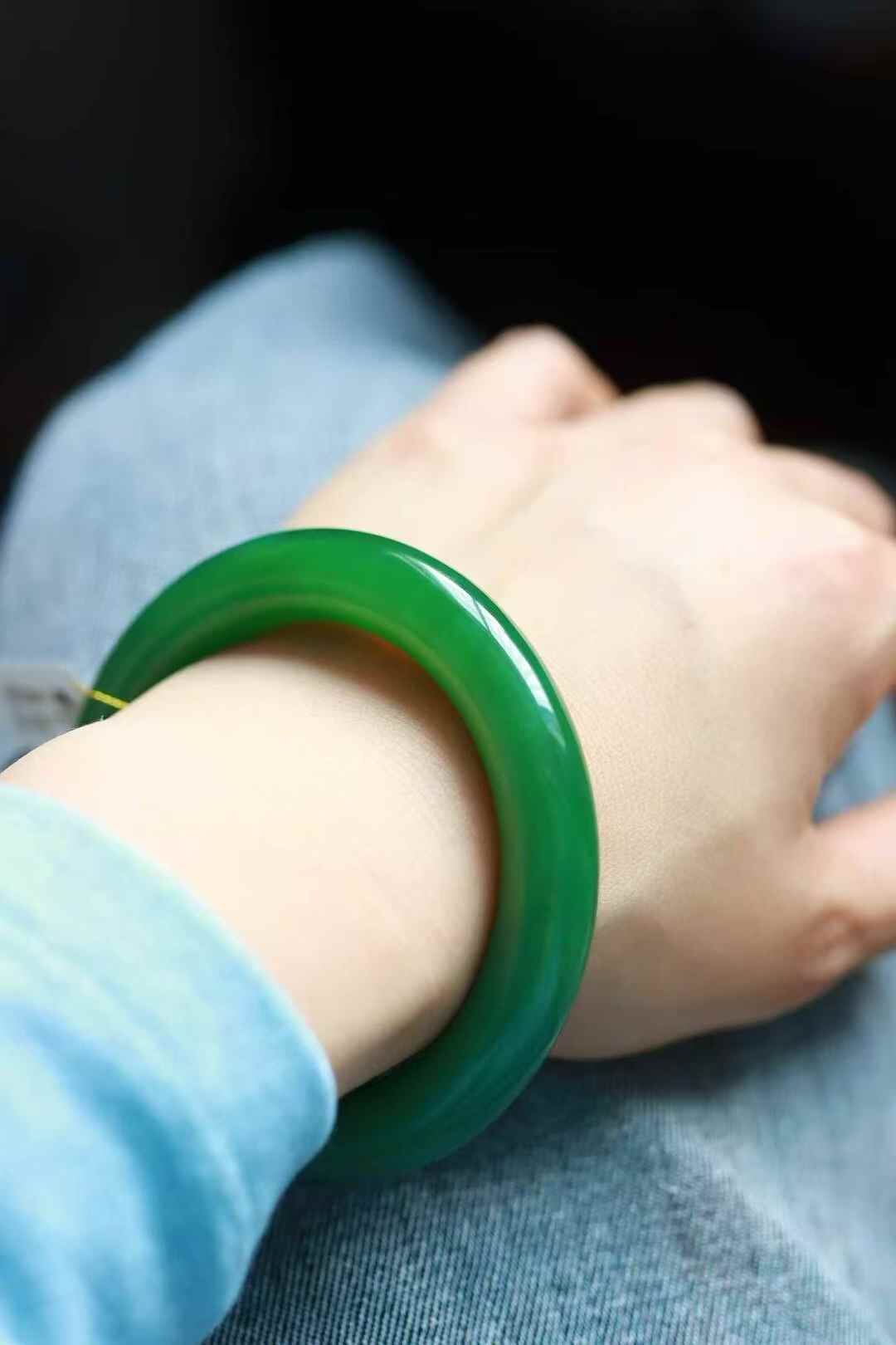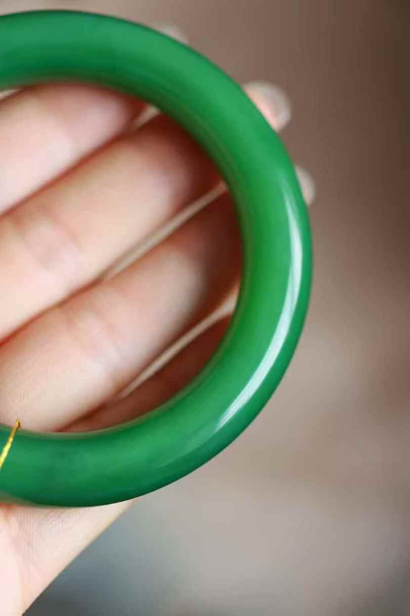 天然和田玉,收藏級俄羅斯碧玉濃陽綠圓條手鐲,滿陽綠色,色調老辣。局部微結構。整體顏色極美。