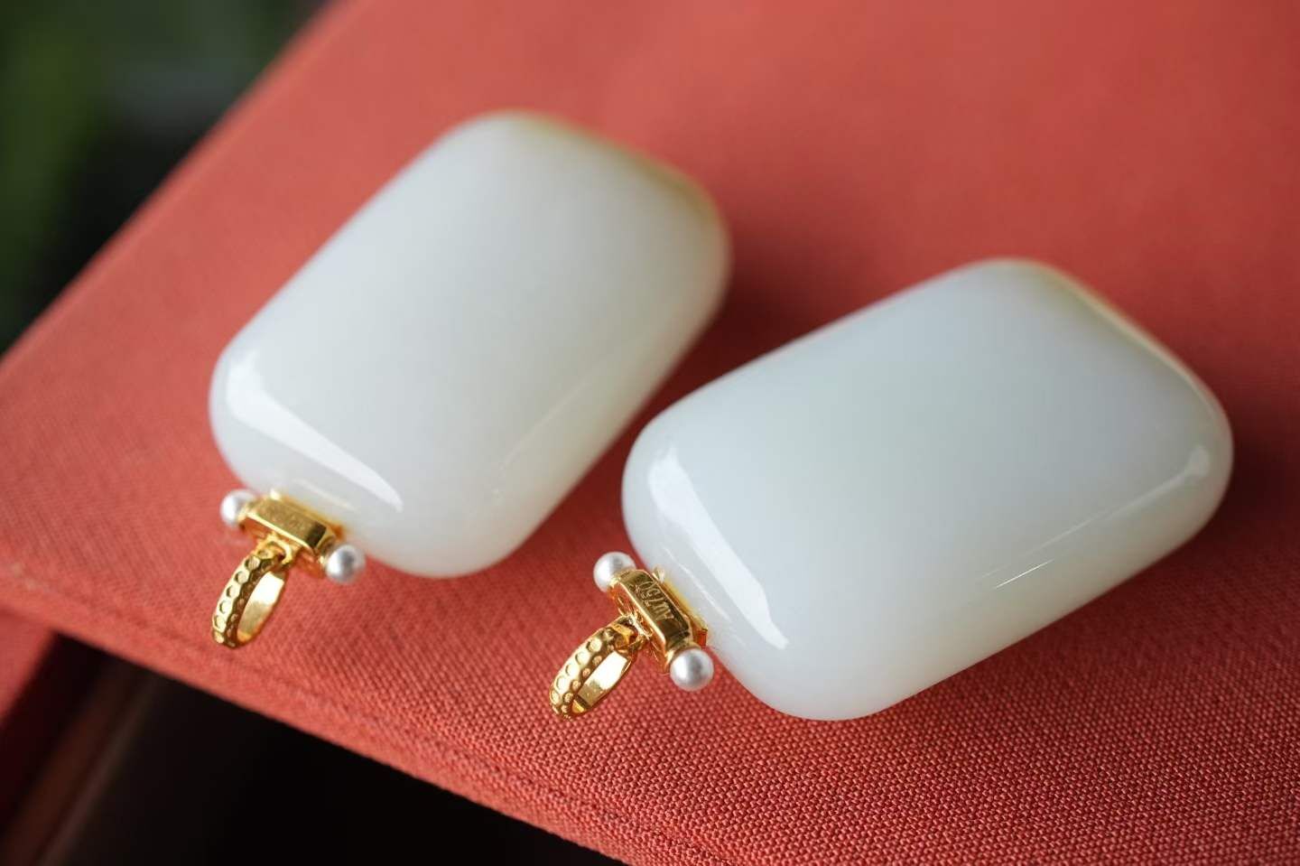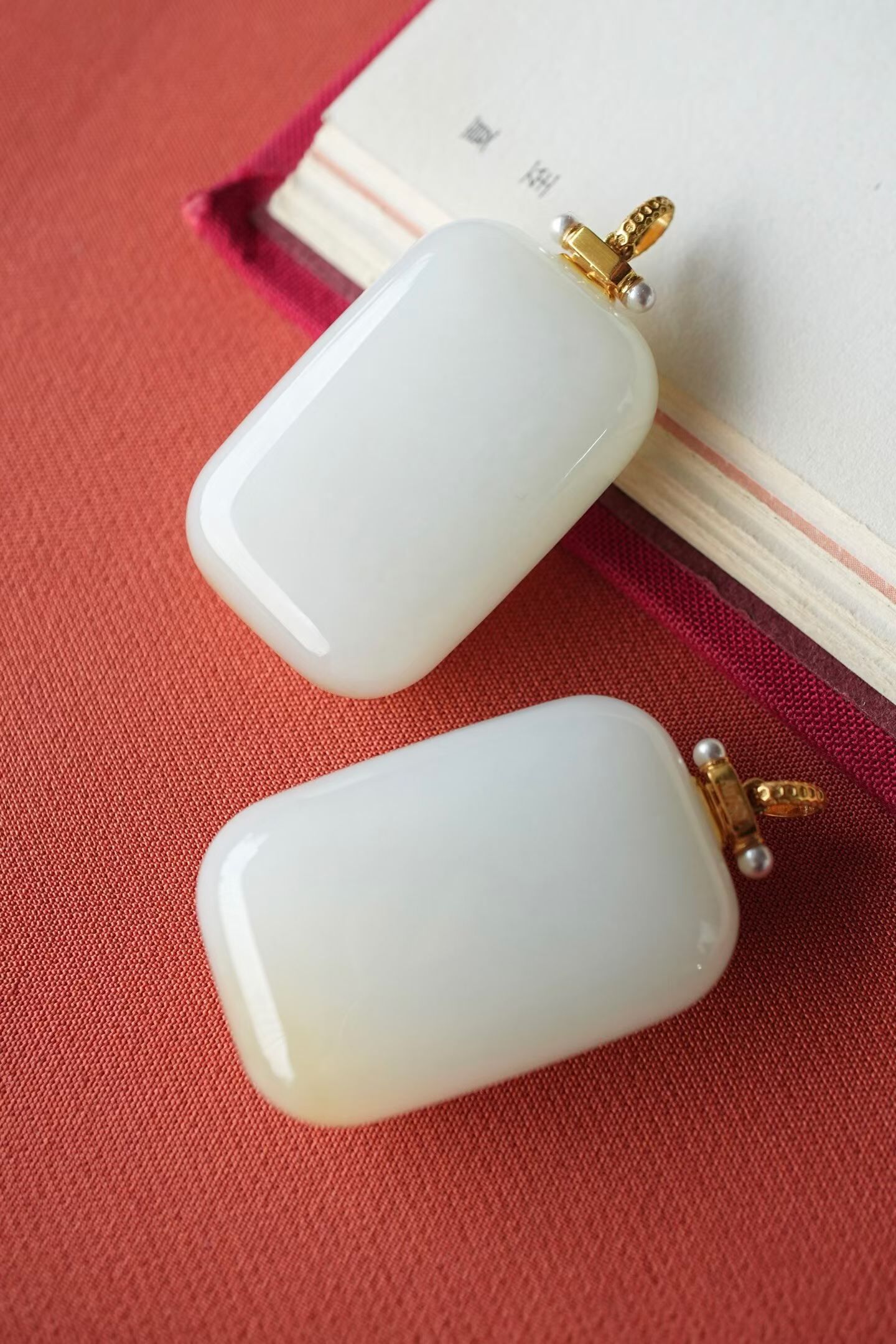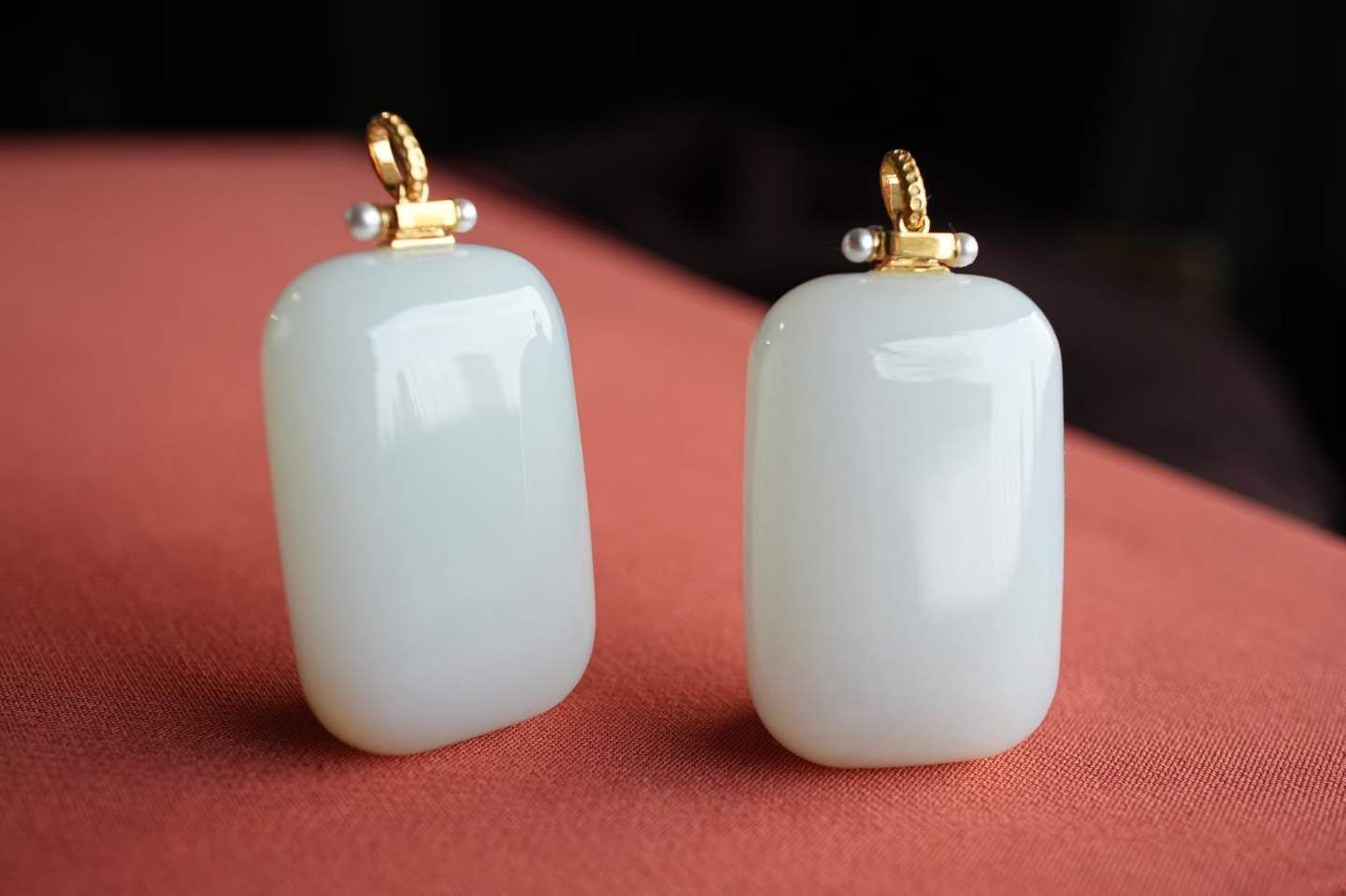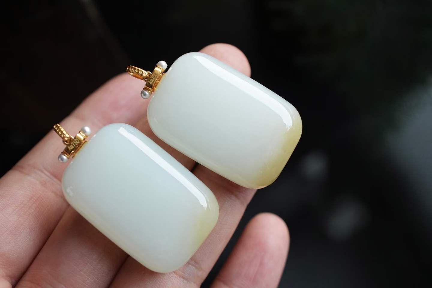 天然和田玉,油亮亮的一對玉牌,厚實飽滿,白肉部分細膩乾淨,一抹暖糖色聚於底部,如落金藏福,兩色分明,底子細膩,邊角打磨圓潤,過燈純淨,無棉紋無水線。