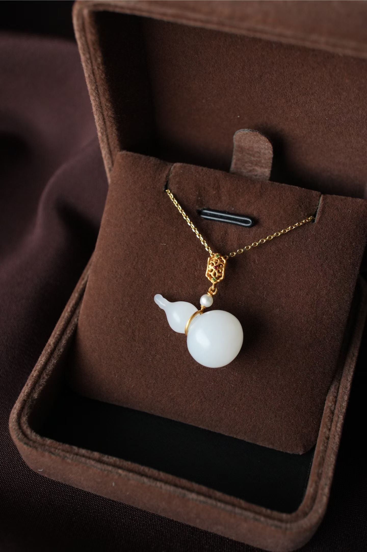 18K厚金鏤空扣頭,點綴沙弗來/紅寶石、天然珍珠,復古精致。葫蘆形體飽滿圓潤,玲瓏可愛,葫蘆寓意“福祿”,送人自戴都特別好。