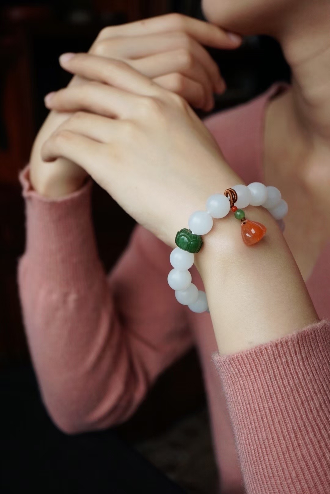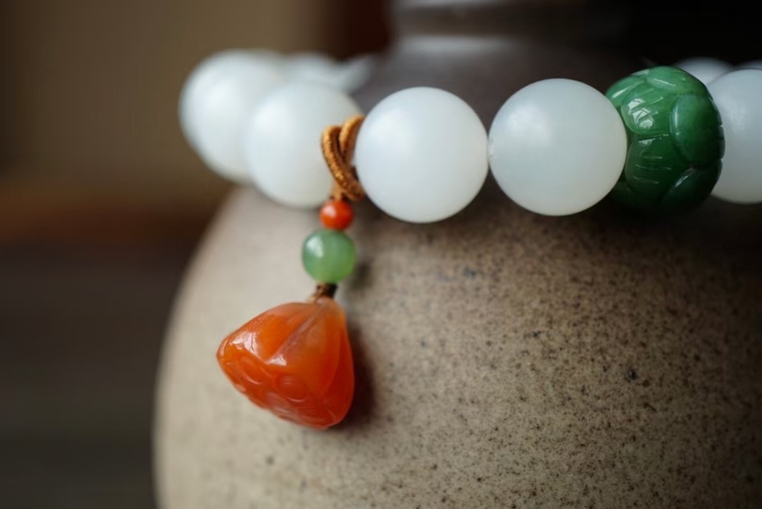 老料和田玉羊脂白玉,白度佳,顆顆精挑細選,料子凝實,油性十足,玉質細膩,無雜無裂完美品。獨家原創設計,碧玉雕刻立體蓮花珠(尺寸約 9 × 13.5mm)點綴,南紅小圓珠,碧玉圓珠連接冰飄南紅蓮蓬作墜,精緻典雅,上手百搭雅緻。