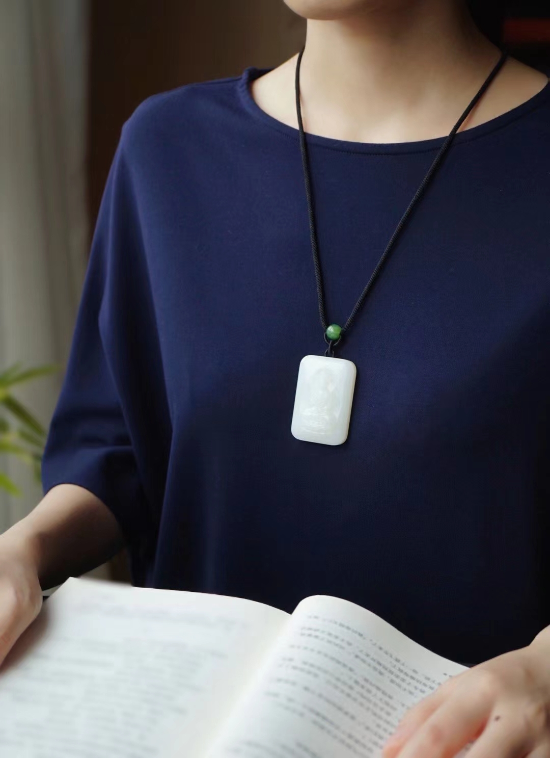牌型厚實飽滿,正面蘇工立體精雕觀音一尊,觀音端坐蓮花寶座之上,闔目合掌寶相莊嚴,週身飄帶靈動,蓮瓣衣褶線條流暢纖微畢現,雕刻非常精緻細膩,背面雕刻蓮花及梵文六字真言“嘛”字,代表菩薩的慈悲和智慧,寓意化險為夷,功成名就苦盡甘來。