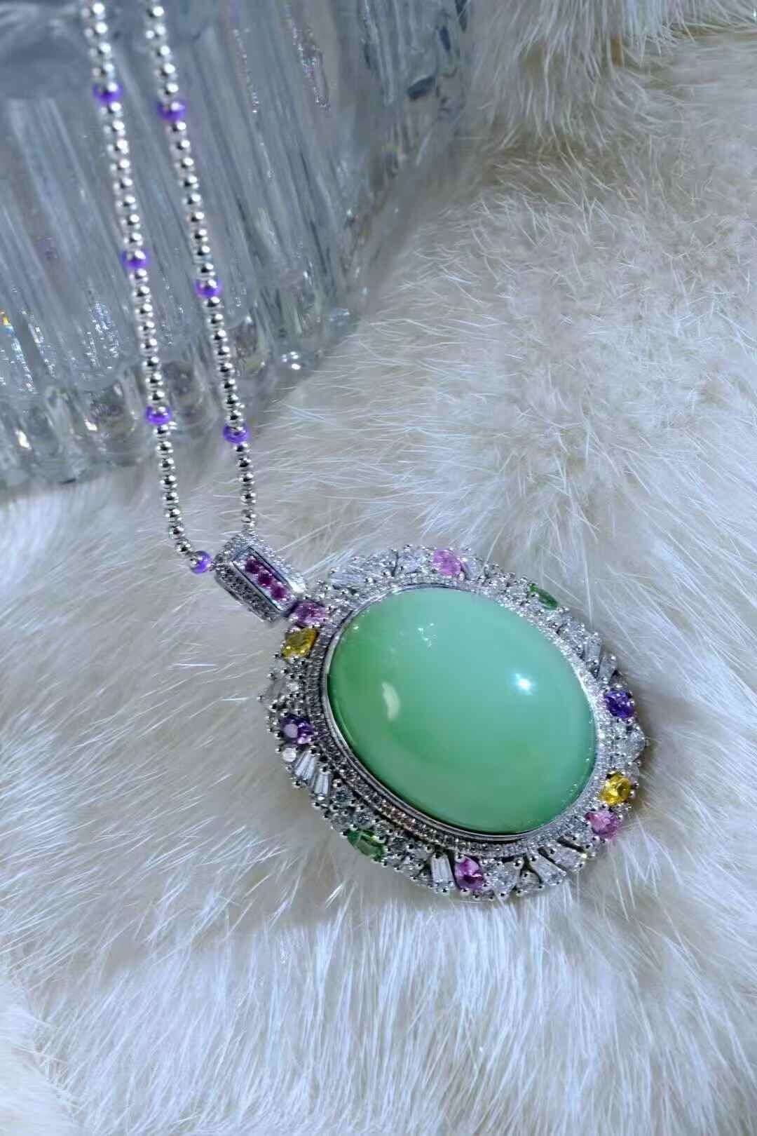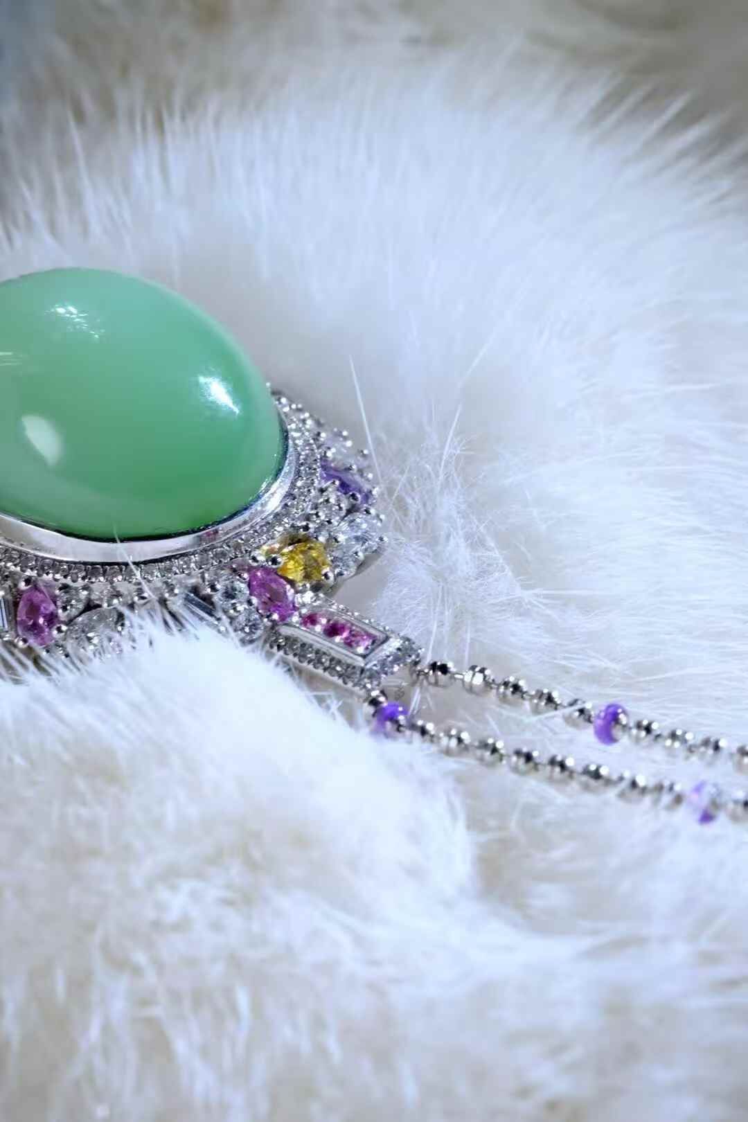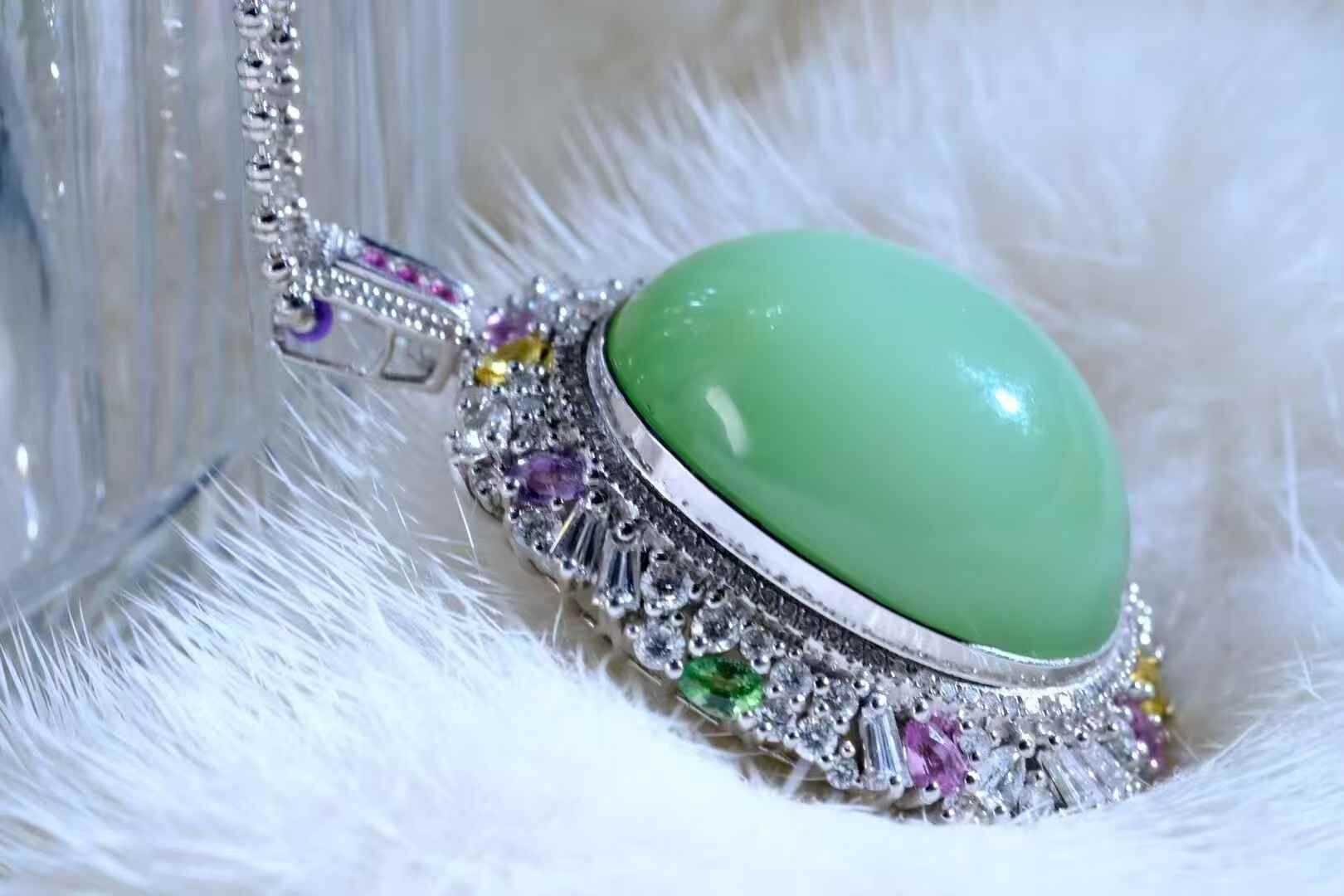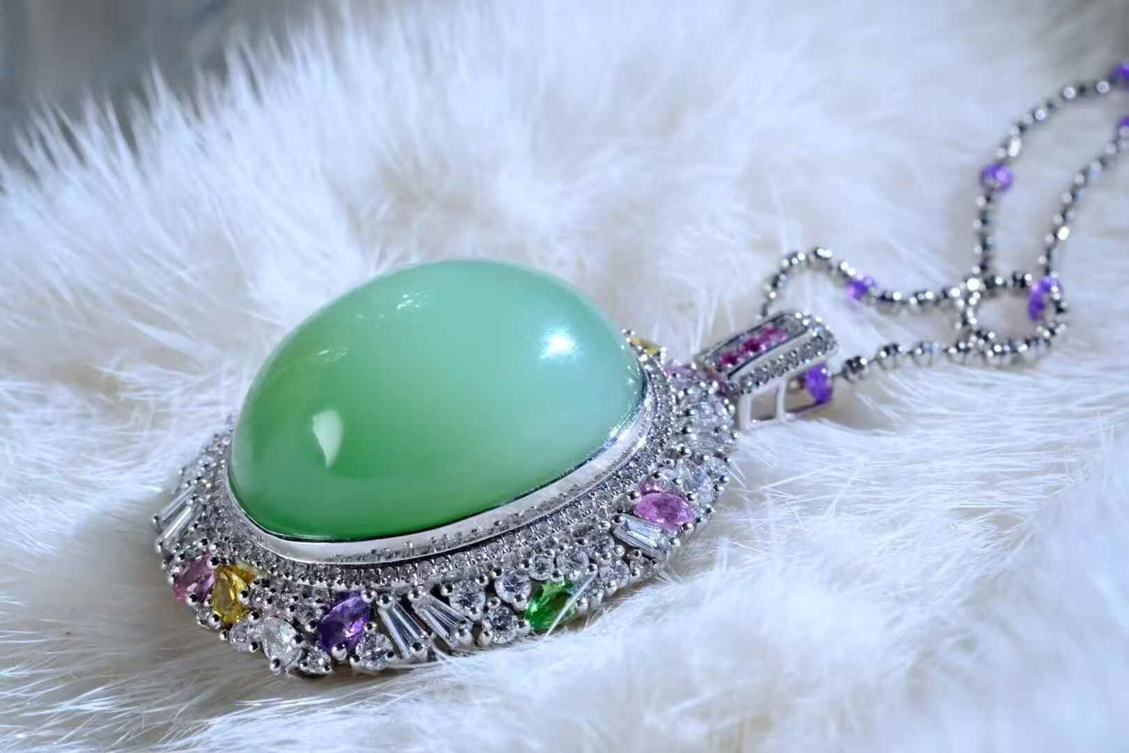 天然和田玉,稀缺高品,黑羊洞薄荷綠鴿子蛋吊墜。孤品,絕無僅有的美物臻品,奢華的設計,誰看都說驚艷,心頭好的美物,愛不釋手。