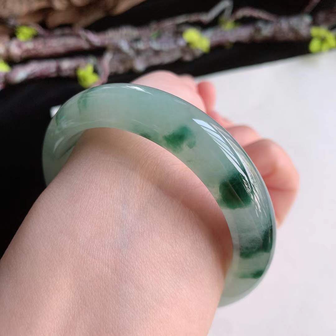 • 翡翠冰糯冰飄綠花正圈手鐲,天然翡翠A玉, 緬甸玉, Jade, Jadeite