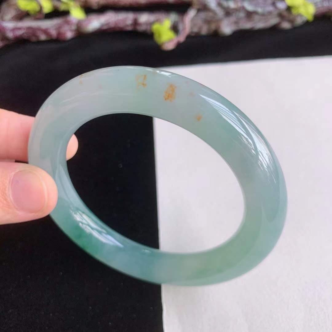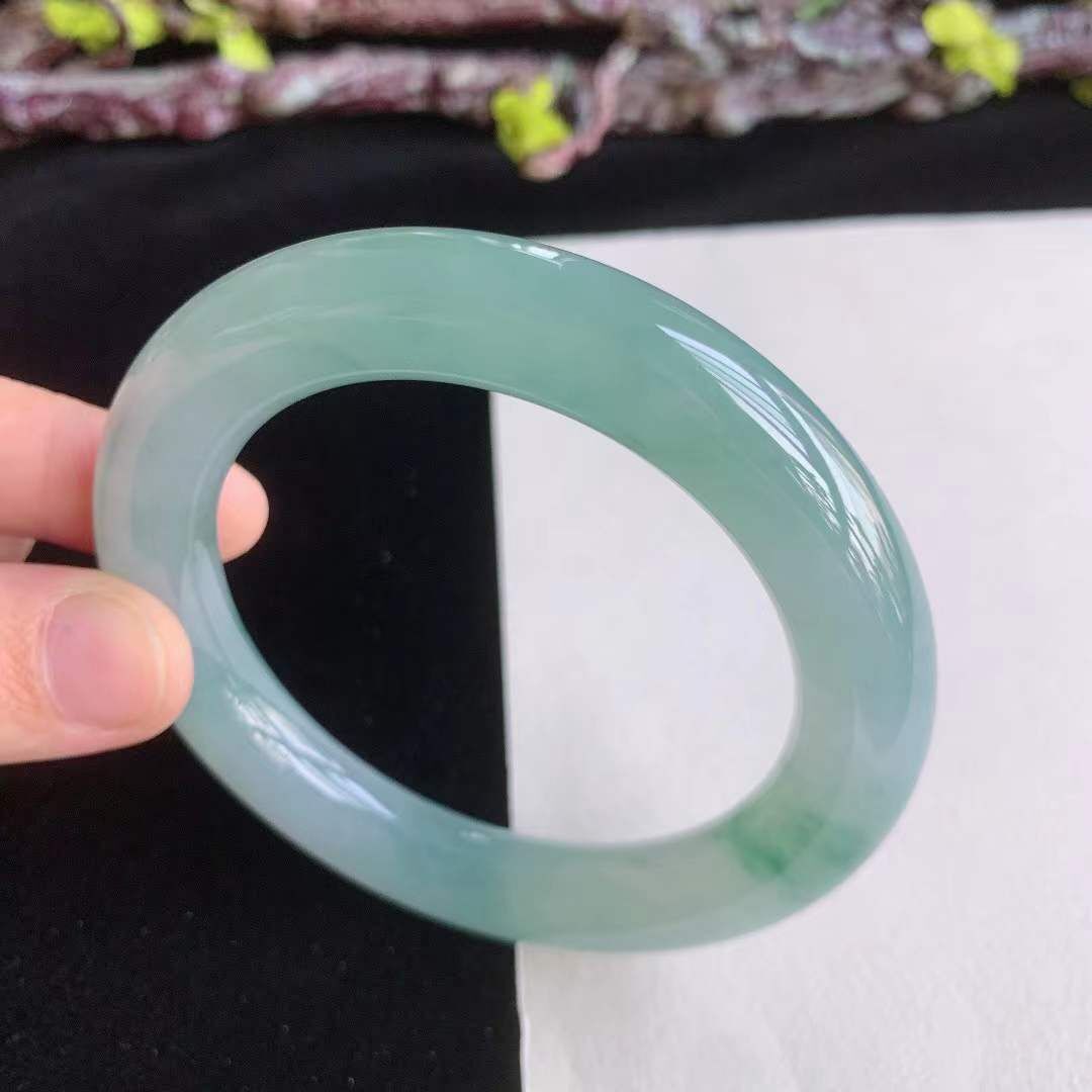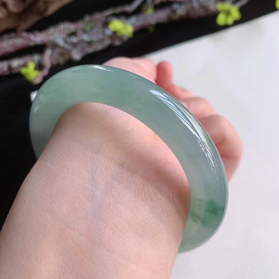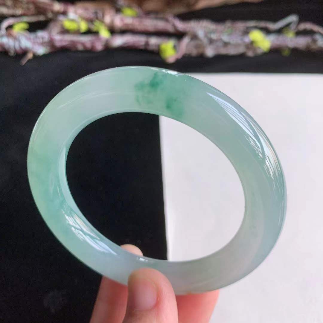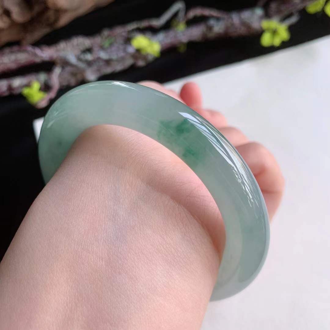 372660 55.2mm翡翠冰種飄綠花飄黃翡圓條手鐲