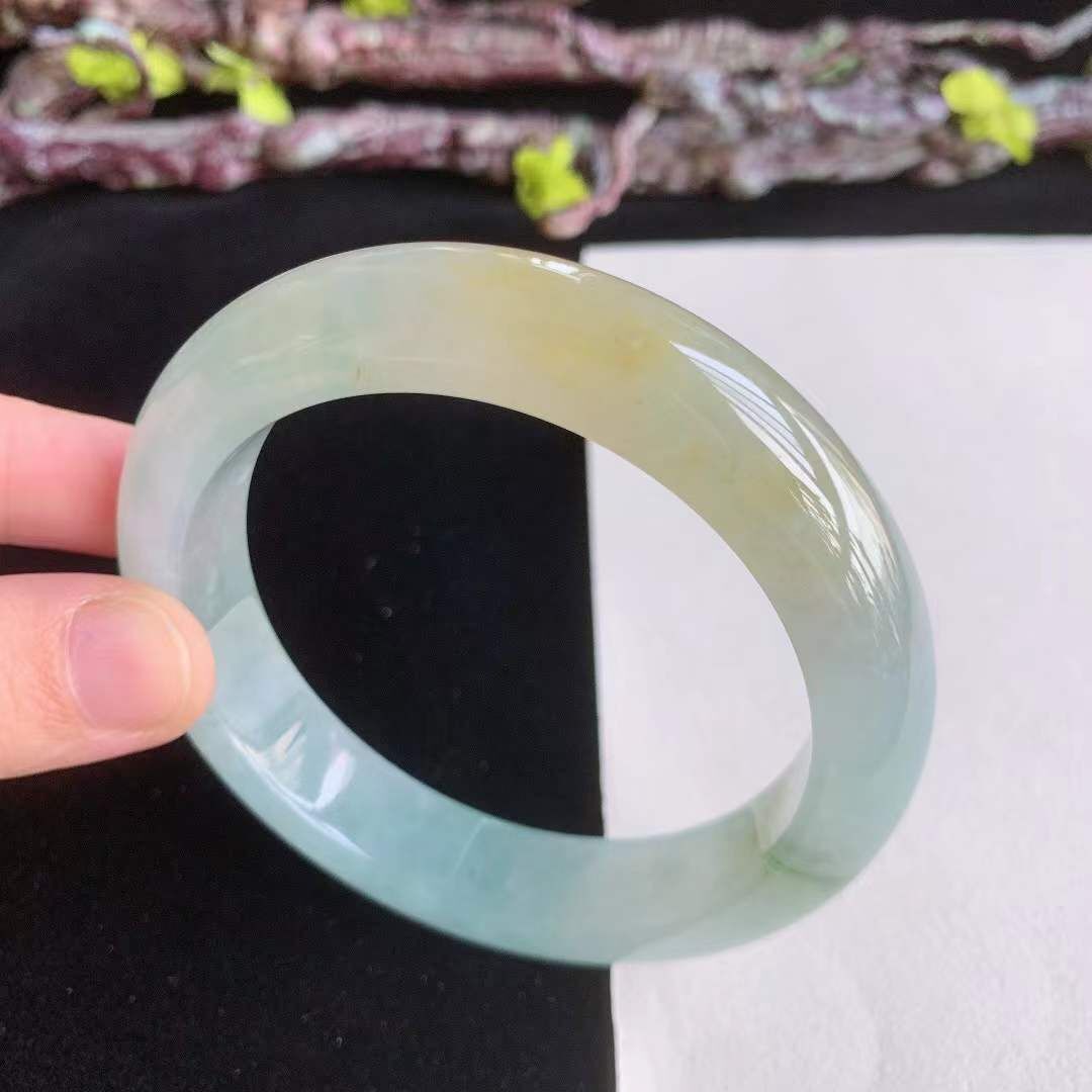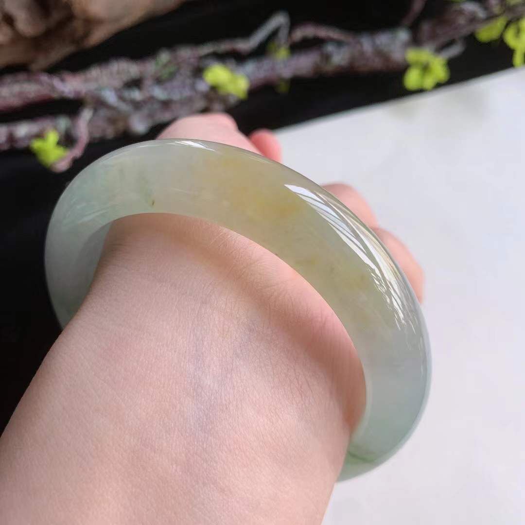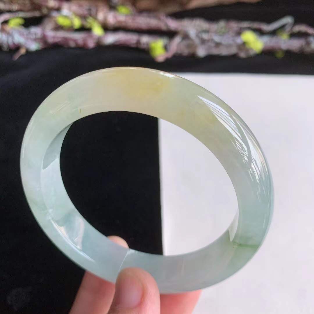 • 翡翠冰種冰潤飄黃翡正圈手鐲,天然翡翠A玉, 緬甸玉, Jade, Jadeite