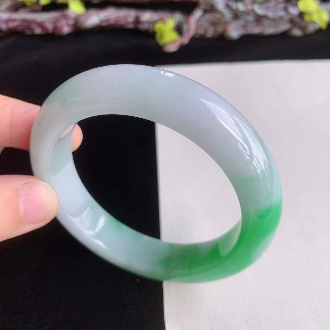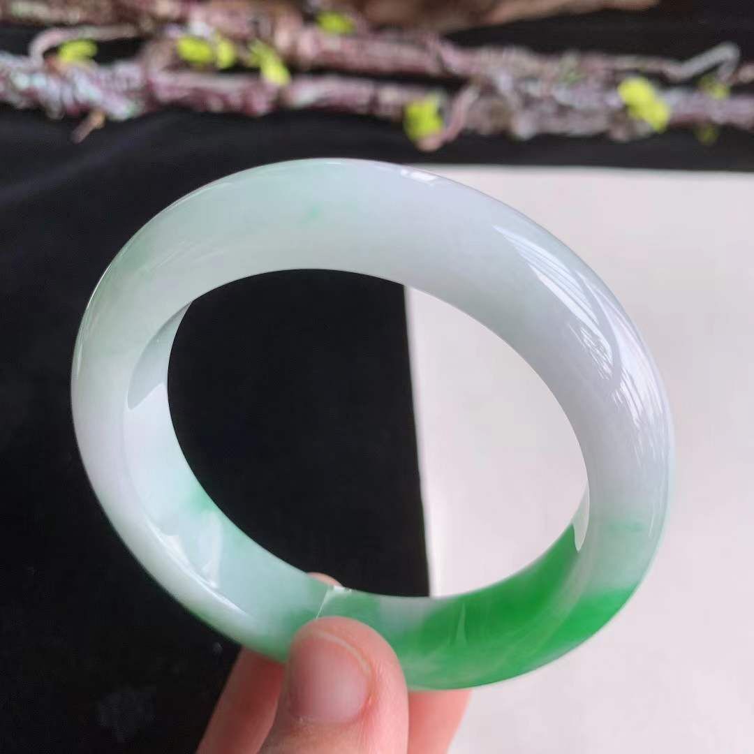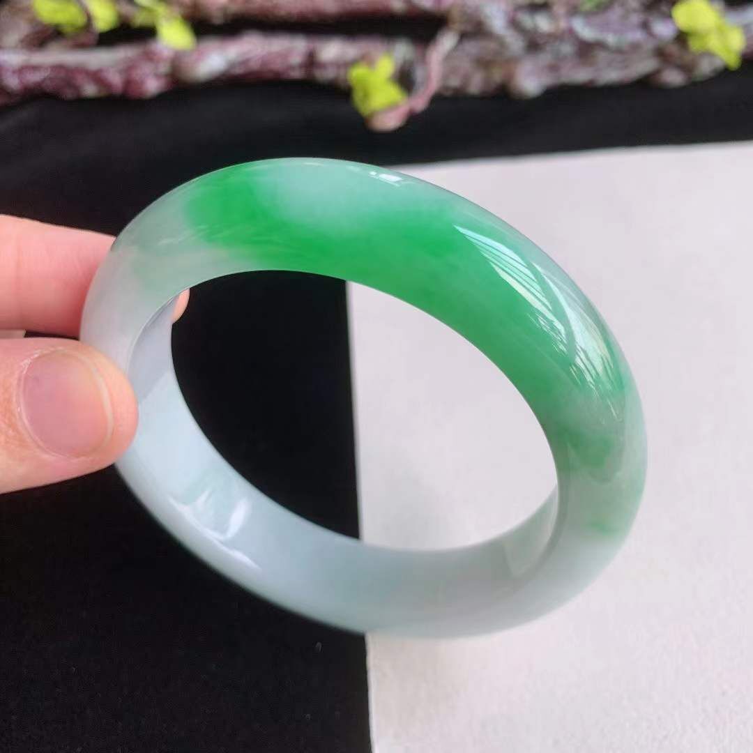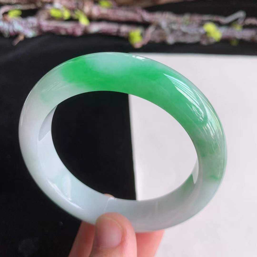 372663 53.8mm翡翠冰糯飄陽綠正圈手鐲