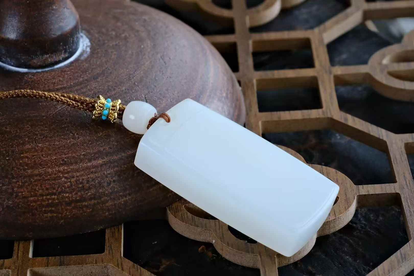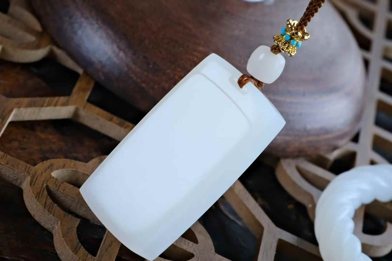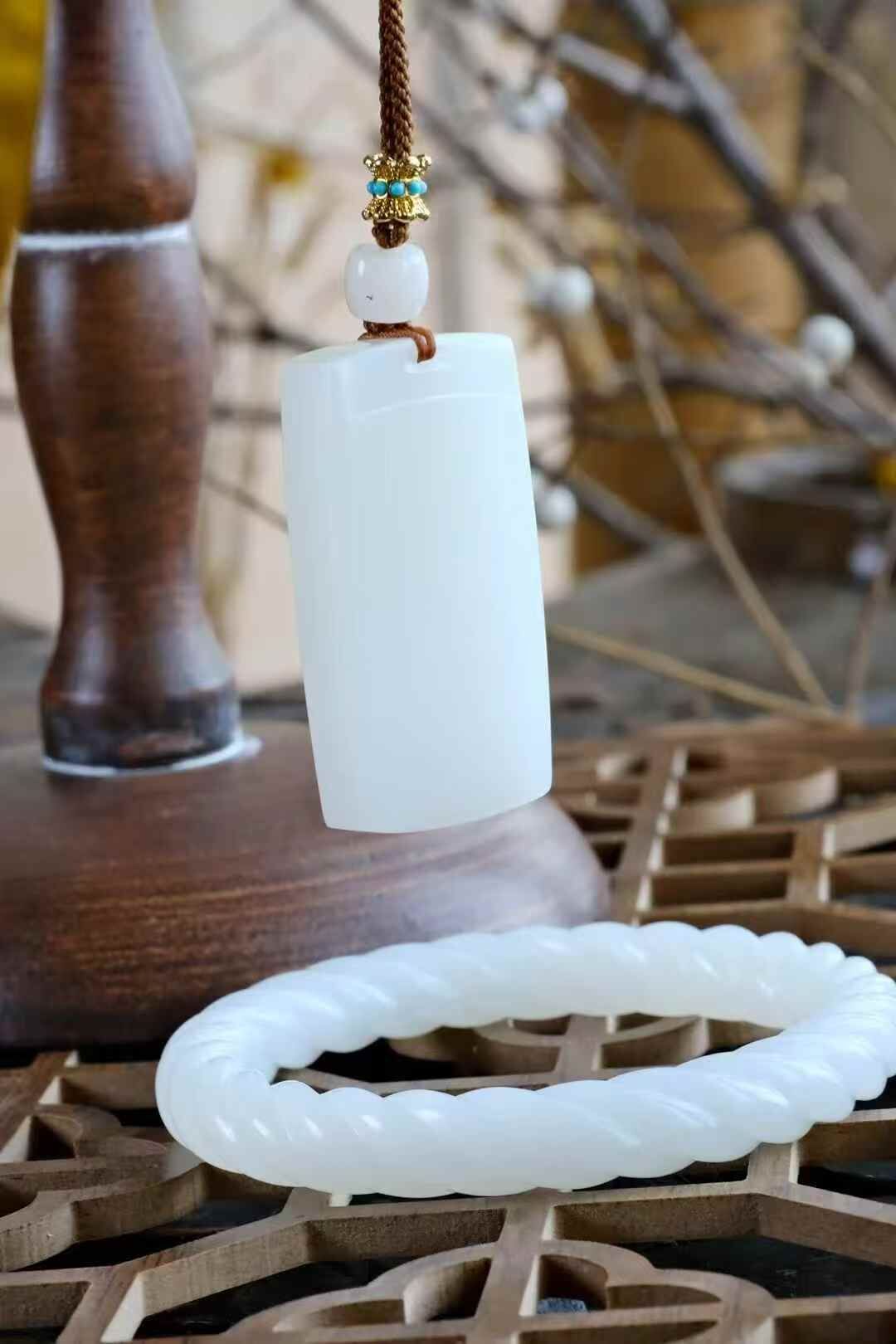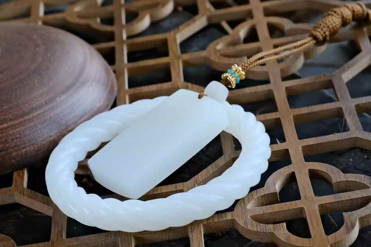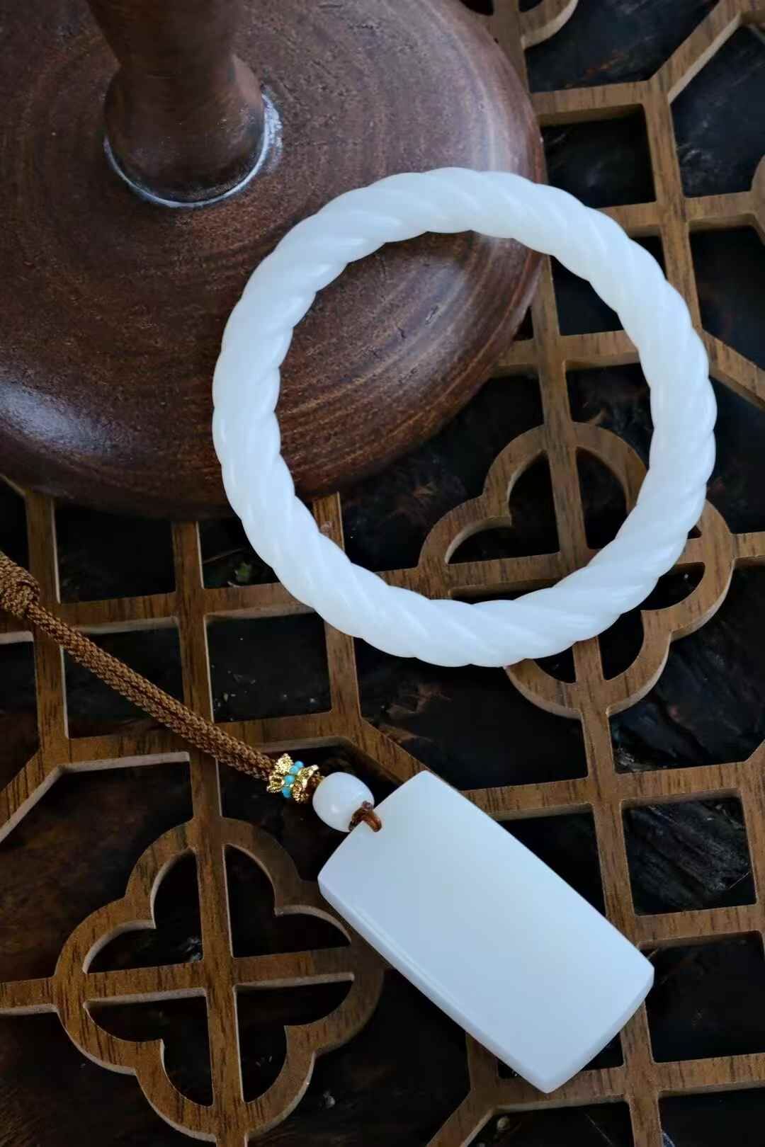 天然和田玉白玉,環形器+無事牌,質地白淨瑩潤,整器雕作兩股絞絲交繞成器,其雕琢凹凸分明,佩戴復古又特色。