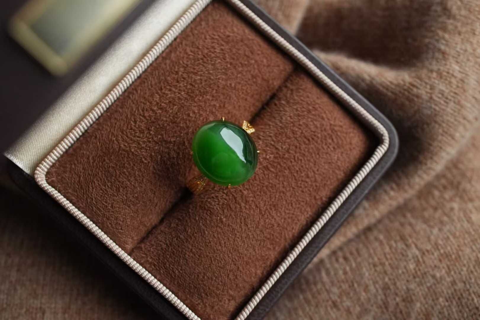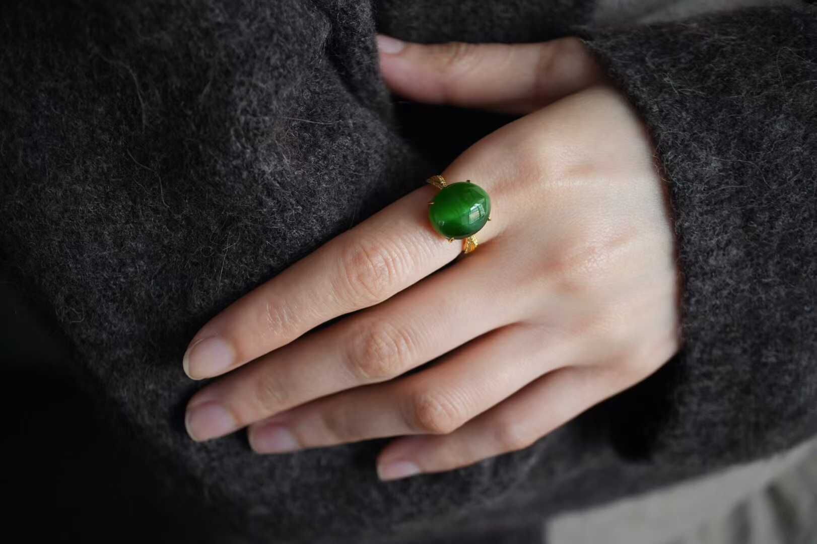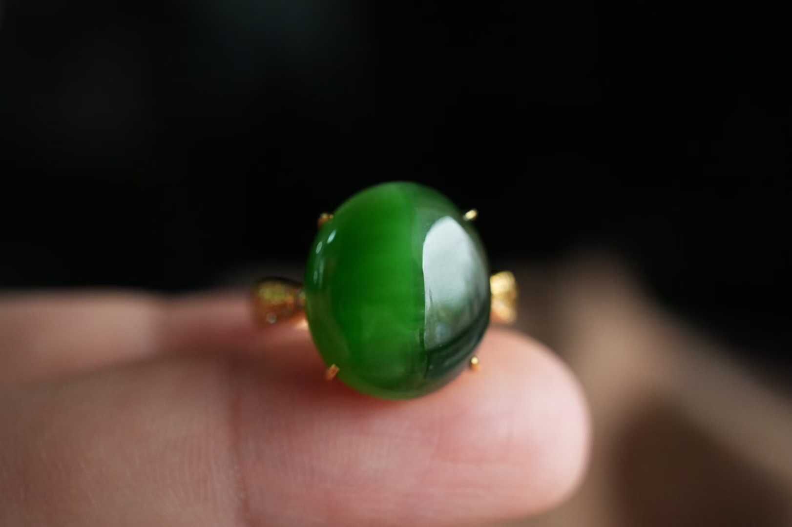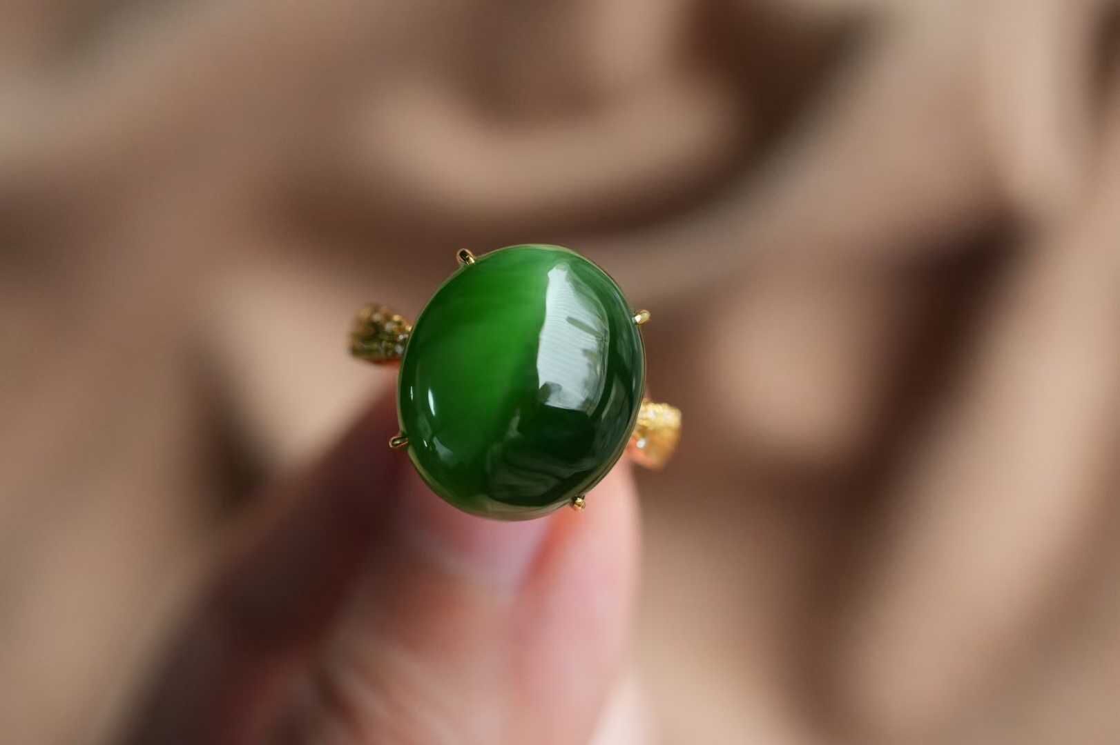 • 和田玉碧玉陽綠貓眼蛋面戒指,天然和田玉軟玉