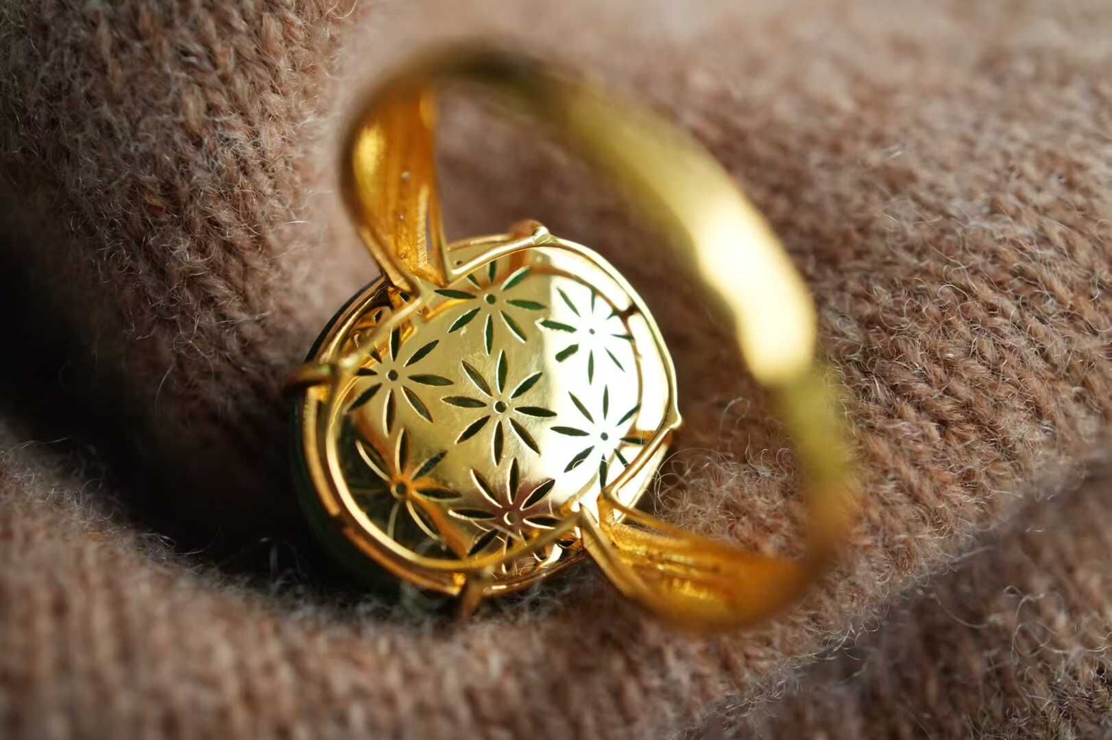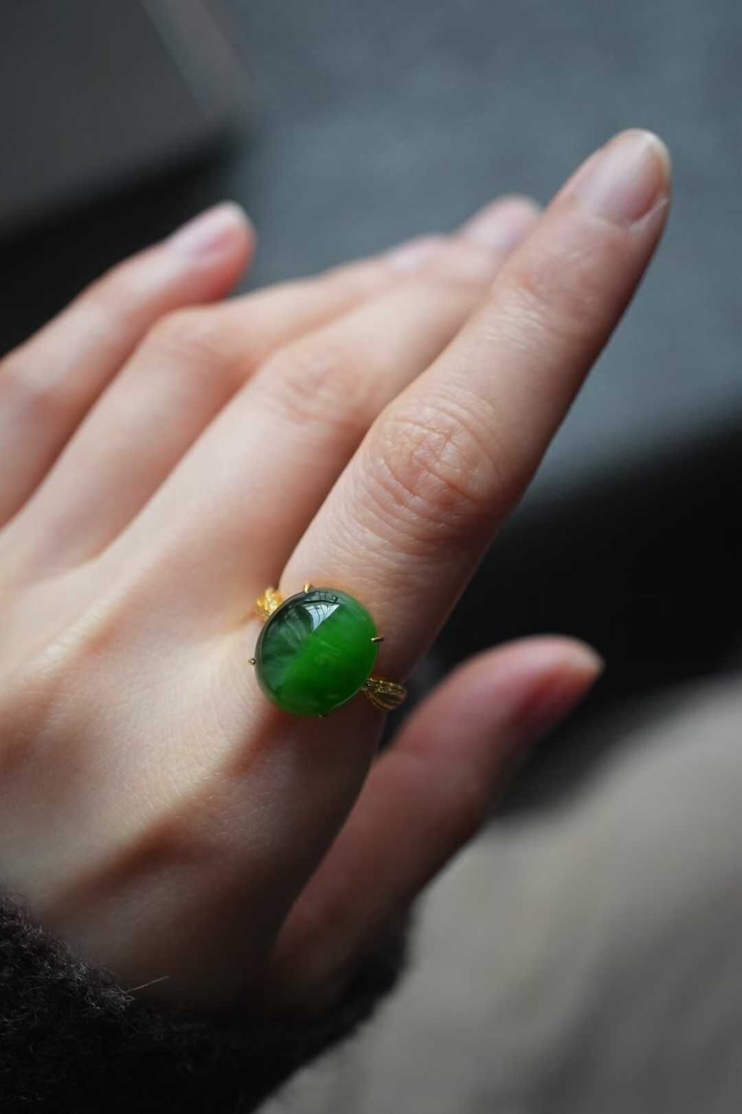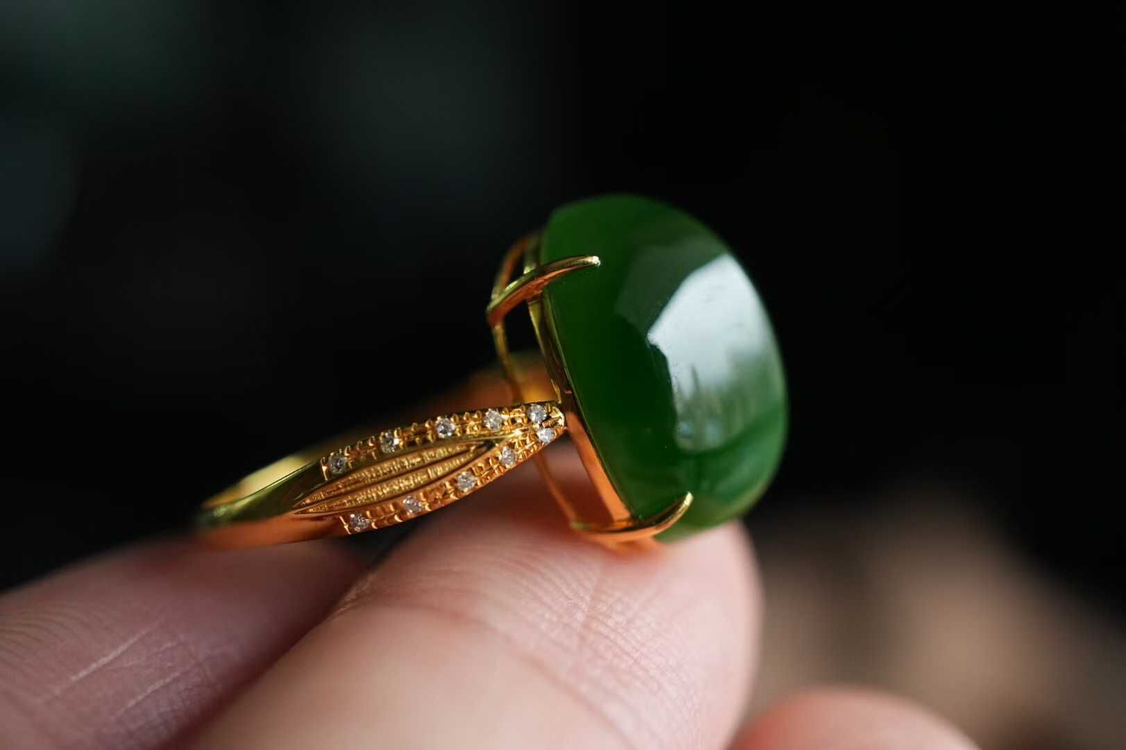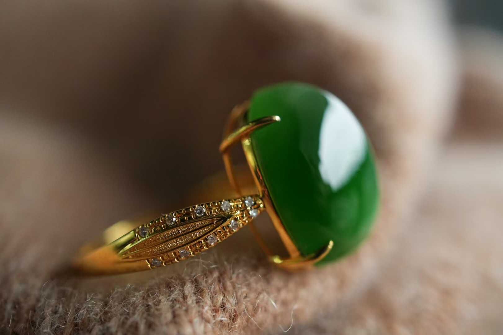 • 和田玉碧玉陽綠貓眼蛋面戒指,天然和田玉軟玉