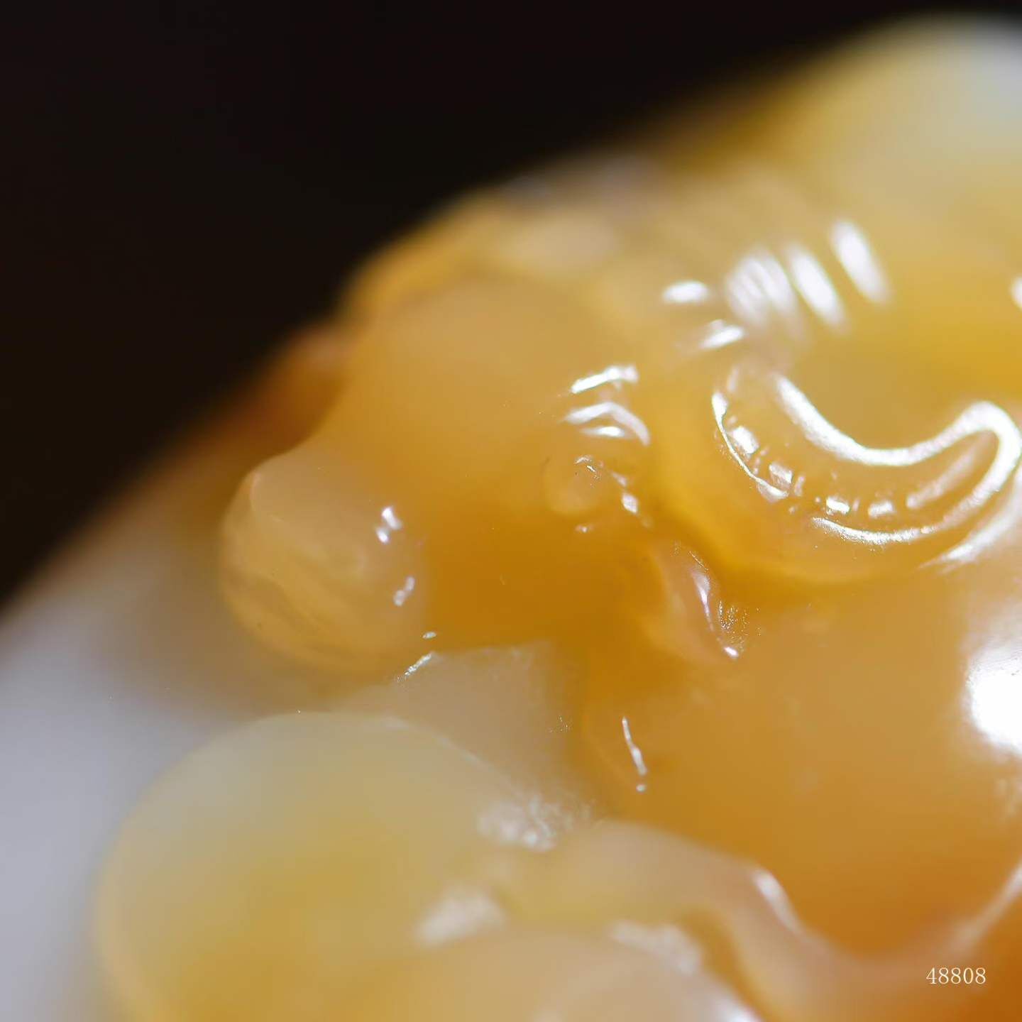 天然和田玉,且末糖白玉,脂漫金波,赤糖凝光若初陽熔蜜。臥牛俯臥昂首,脊骨如弓,糖色漫溢處肌理浮凸若地脈奔湧。