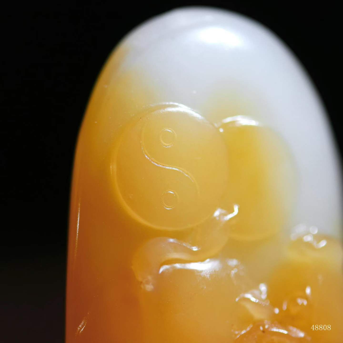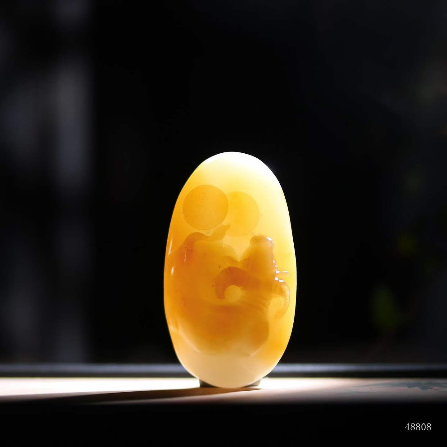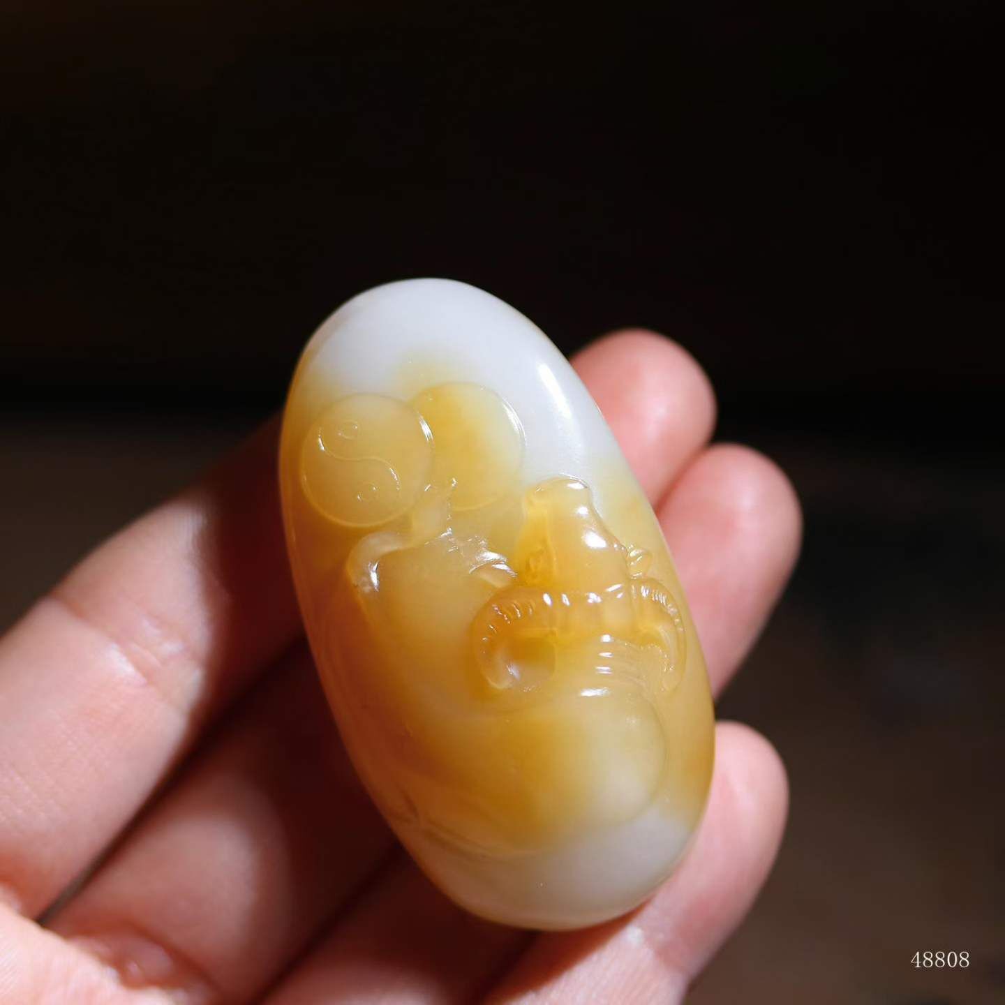 牛角折轉暗合乾旋坤轉之勢,尾掃糖紋濺星斗,玉潤脂光裹千鈞蓄勢之魂,佩之引時運犇騰。