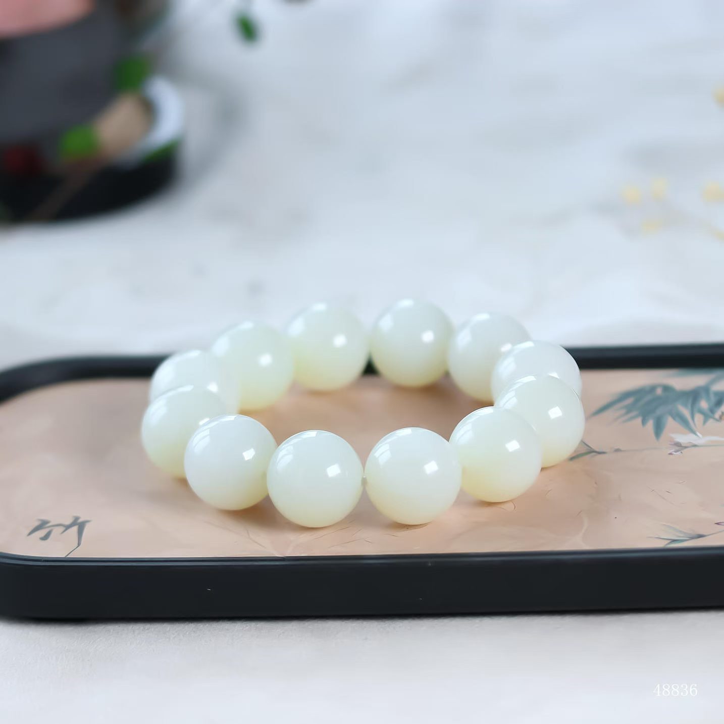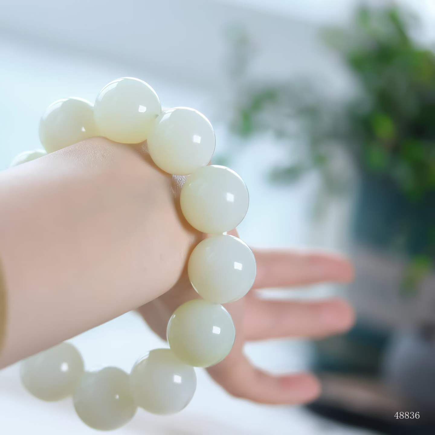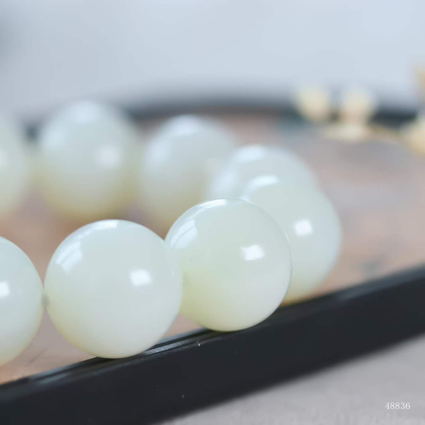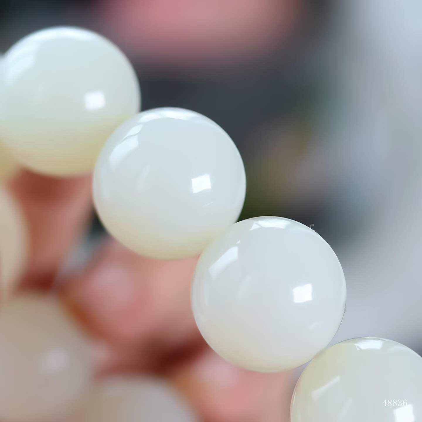 珠體渾圓飽滿,溫潤細糯如握暖日雲團。盤轉腕間,皓白生輝,雄渾氣度暗合乾坤朗朗,佩之蘊藏山河襟懷。
