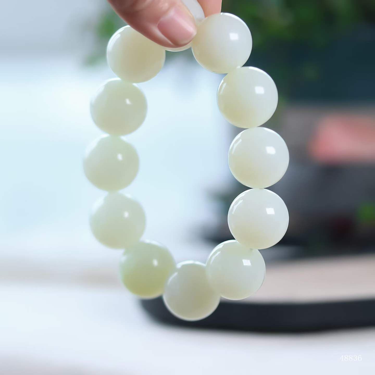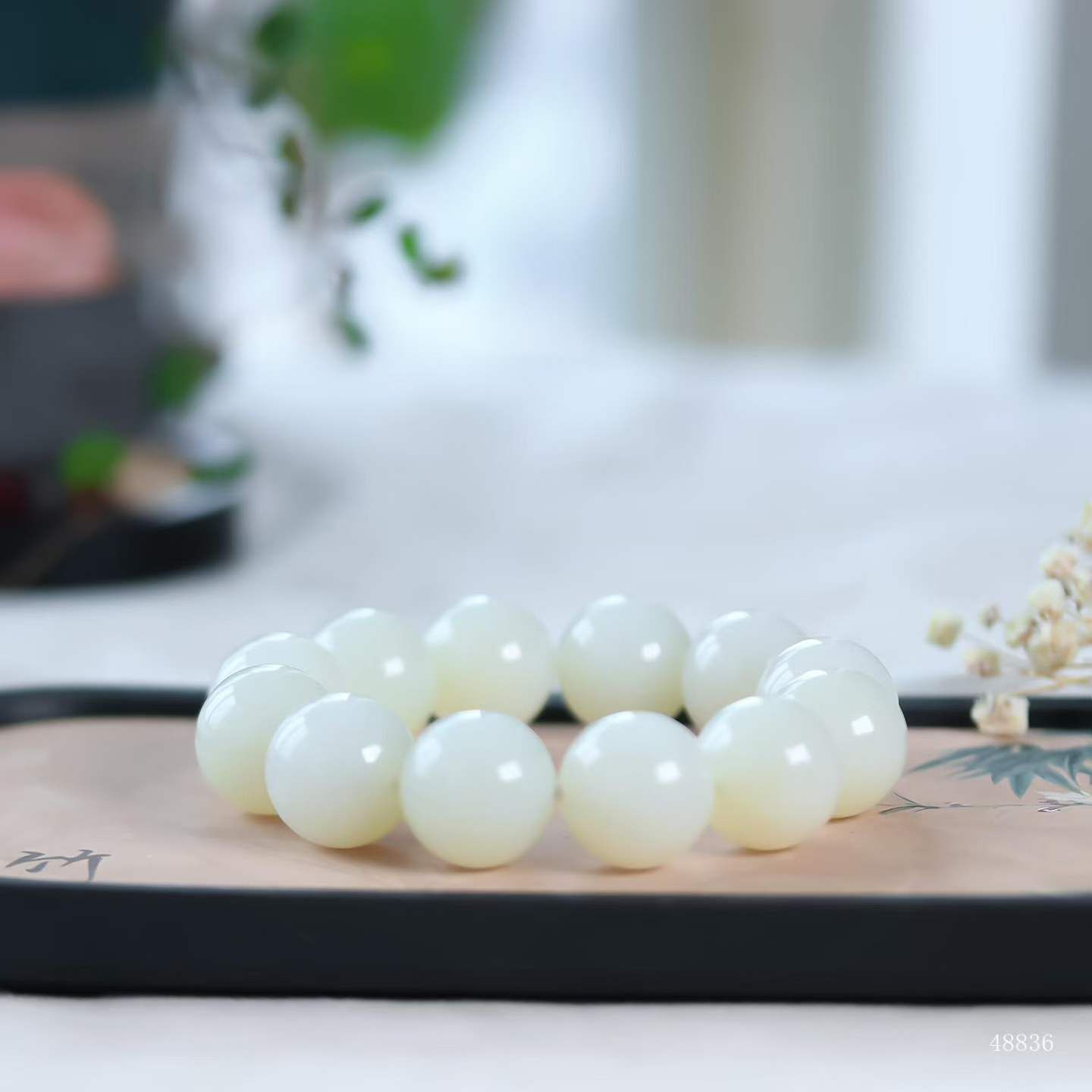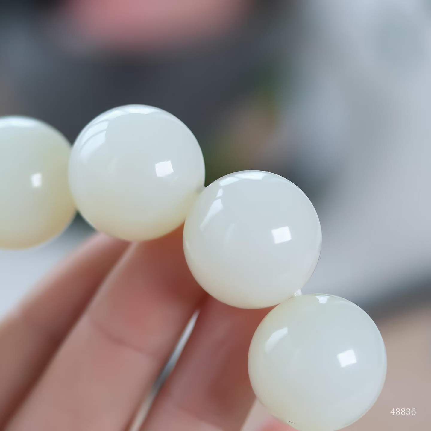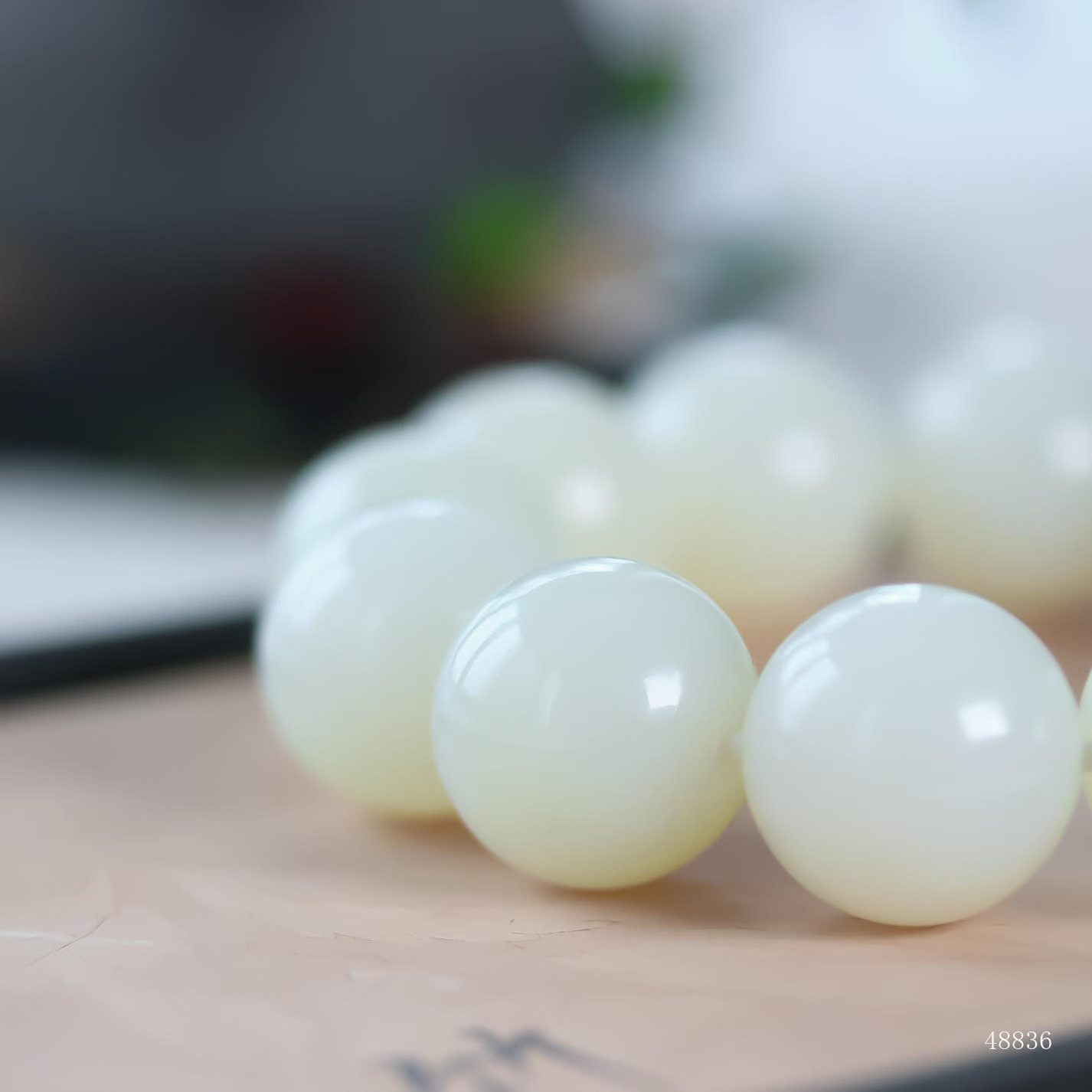 珠體渾圓飽滿,溫潤細糯如握暖日雲團。盤轉腕間,皓白生輝,雄渾氣度暗合乾坤朗朗,佩之蘊藏山河襟懷。