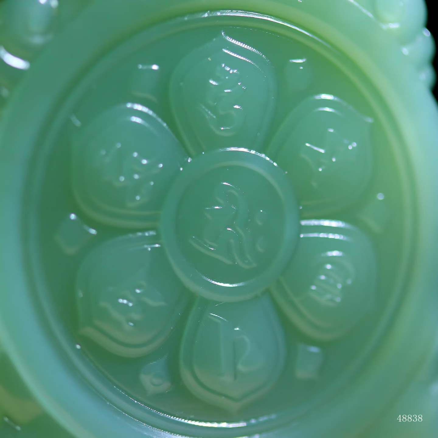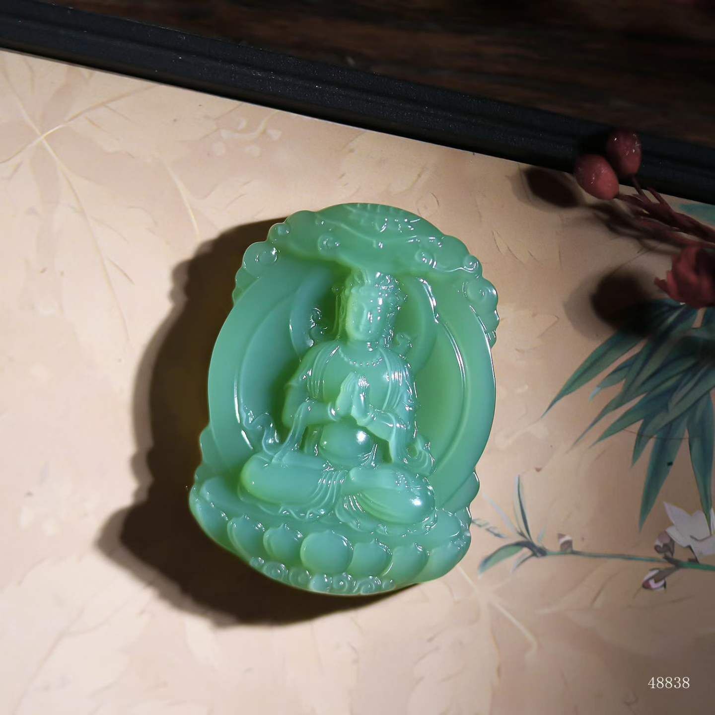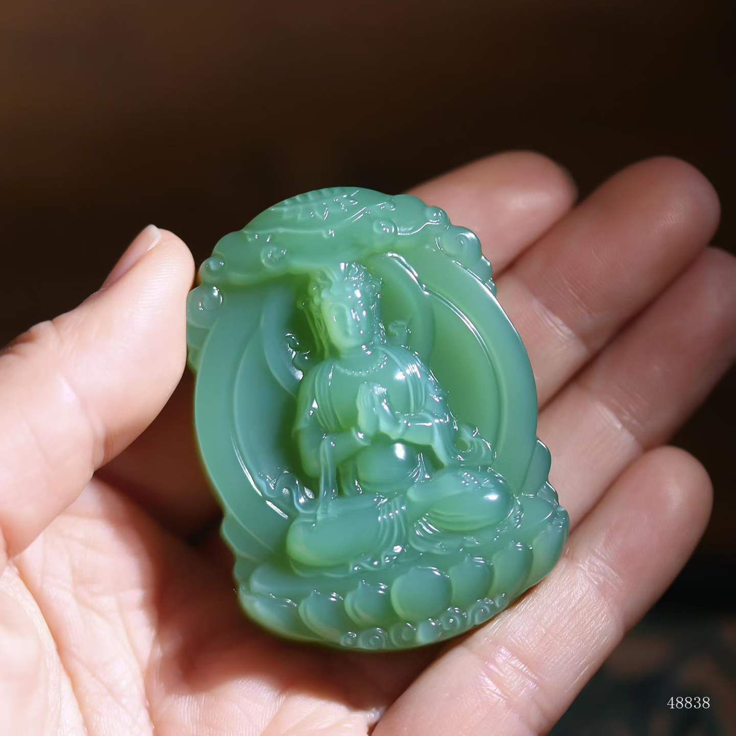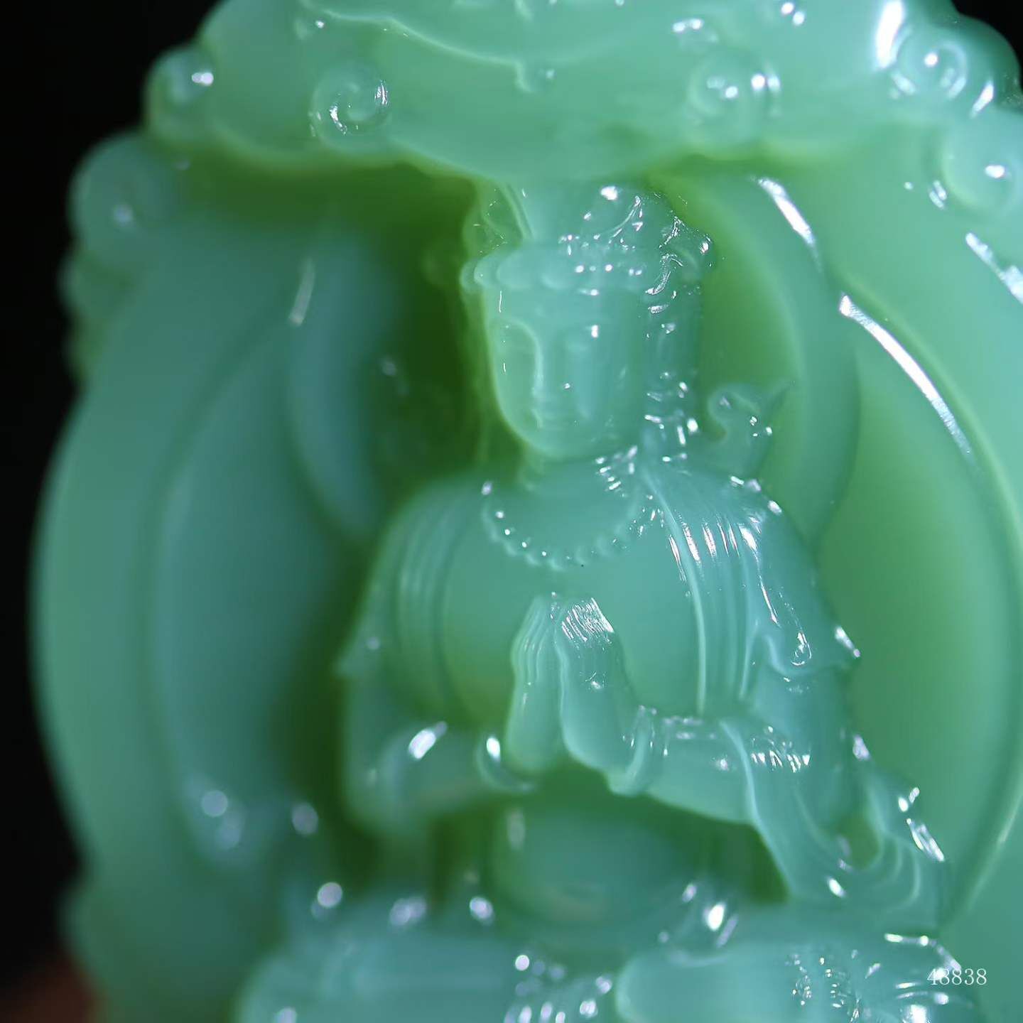 觀音合十端坐蓮台,儀容端庄似月映靜湖,肅穆庄嚴中透慈悲光暈。背面六字真言浮雕如梵音低誦,護佑平安,吉祥永駐,祈福隨身化塵憂。
