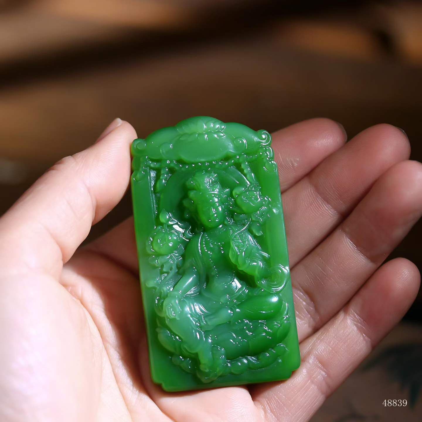 浮雕度母端坐蓮台,纖手持花如拈天界芳華,衣袂翩躚間儀容秀雅。玉質瑩透裹刀鋒,梵花盛放寓十方庇護,觸手生涼時祥瑞自湧,方寸碧玉承渡厄慈悲。
