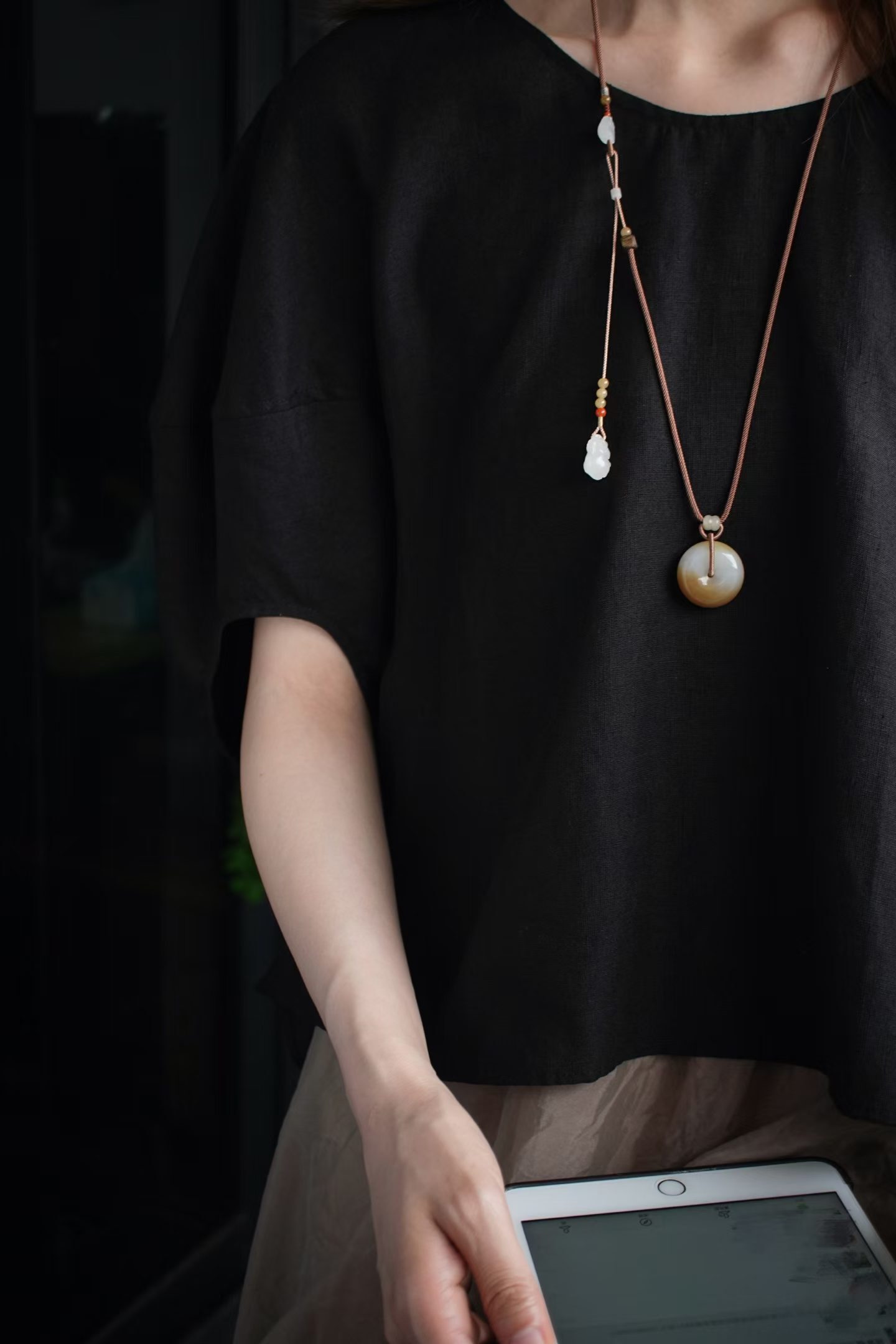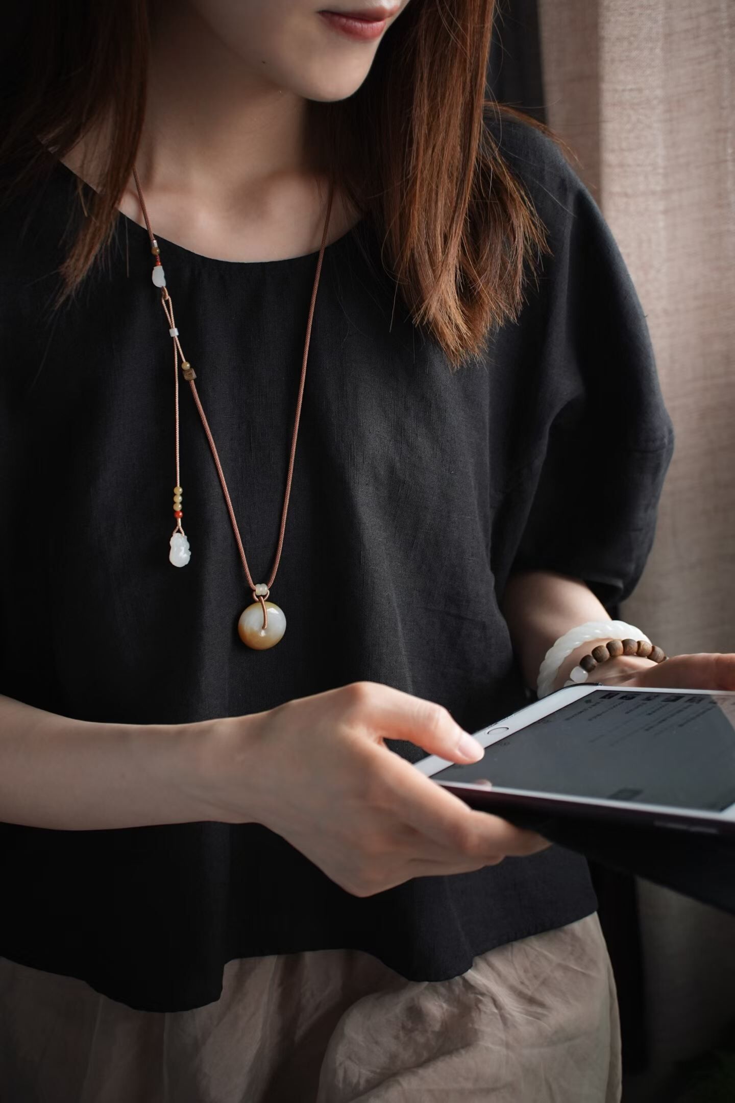 手工制作可調節繩,點綴糖色頂珠,糖料/南紅圓珠,白玉知了、白玉貔貅等配飾,平安扣寓意平安圓滿,承載的是東方獨有的吉祥文化,願它護佩戴者走過歲歲年年。