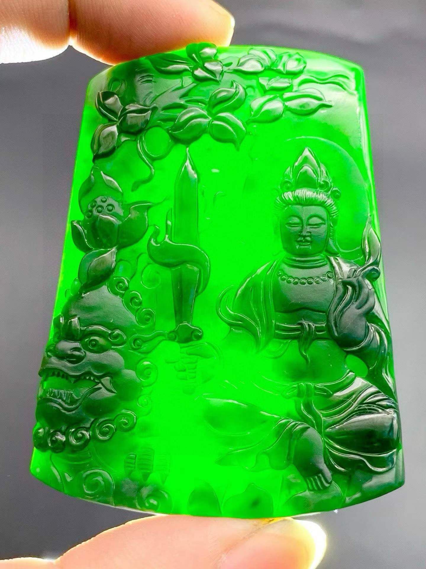 天然翡翠A玉,燈照透綠,雕工精美,完美無紋裂。