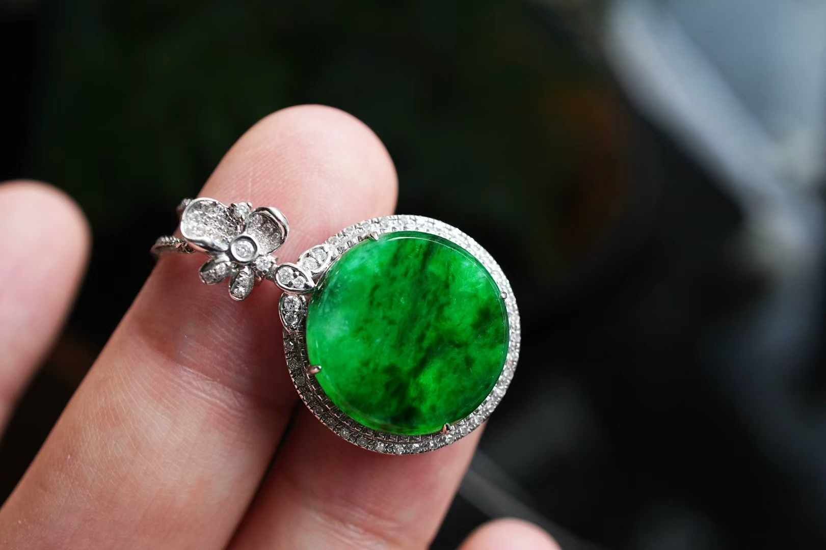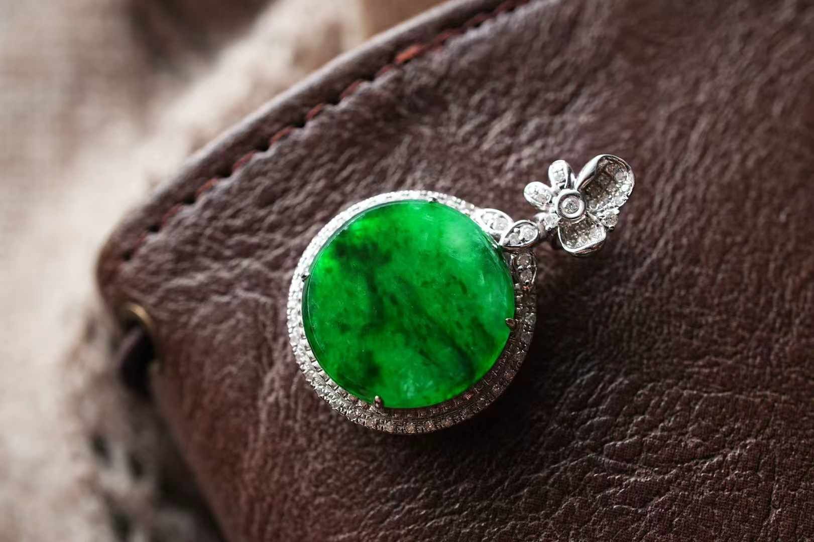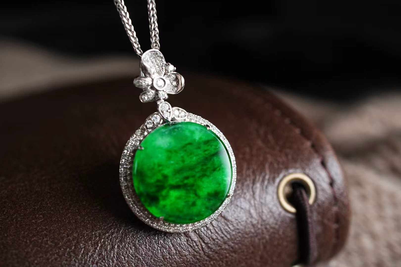 天然翡翠A玉,緬料,老坑種,冰種辣陽綠,色澤濃郁,翠色如織,紋理如墨暈染,明艷大方。