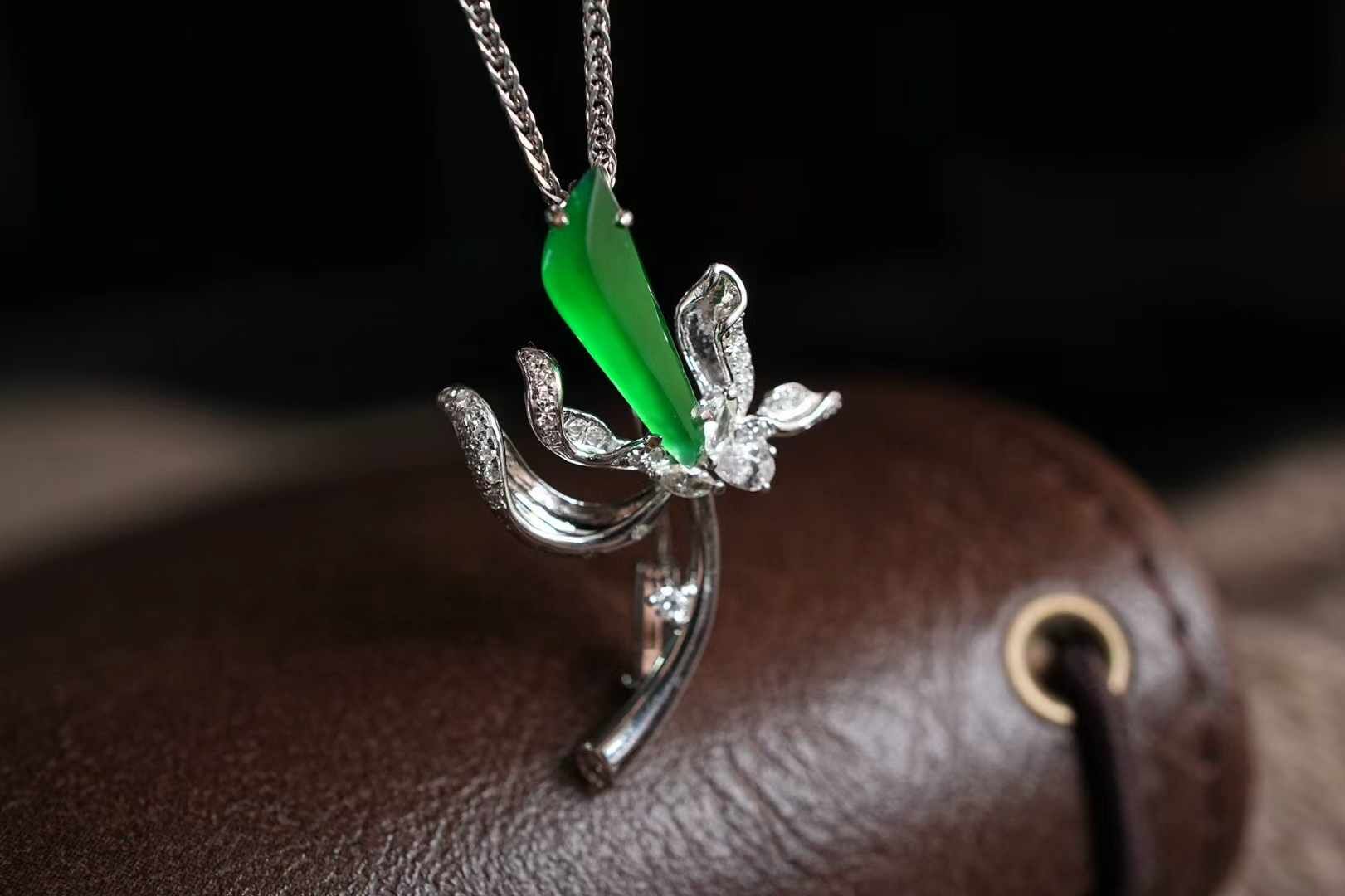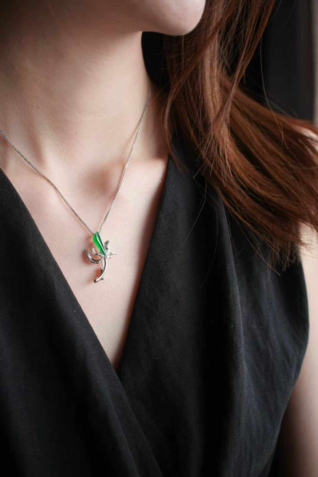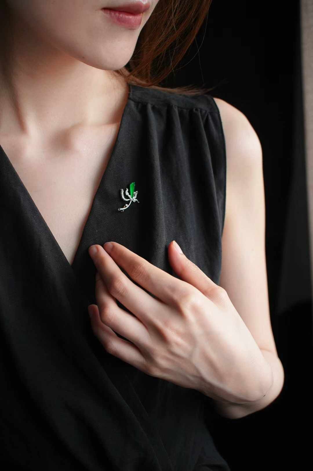 天然翡翠A玉,一支臨風而綻的玉蘭。風動暗香濃,始知玉蘭開。仙氣,靈氣,勢必要用最上好的翠,才能表達出來。冰陽綠滿色翡翠,簡單幾筆勾勒出花苞的形態。
